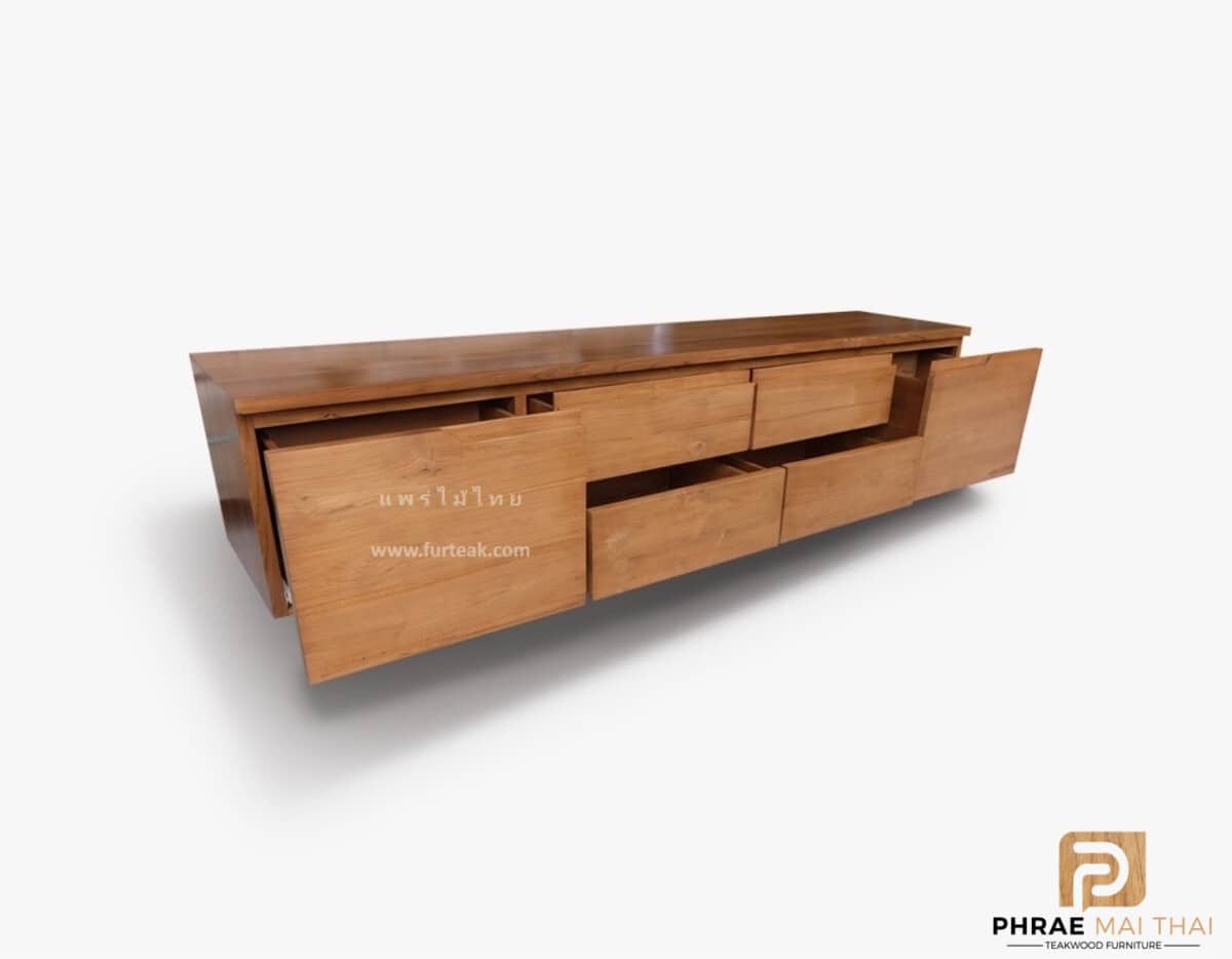 ชั้นวางทีวี โมเดิร์น 6 ลิ้นชัก  เป็นไม้สักทองอบแห้ง ซึ่งคุณสมบัติของไม้เป็นไม้เนื้อแข็งอายุตั้งแต่ 30 ปีขึ้นไป เราเลือกใช้ไม้สักที่มีคุณภาพและใช้กระบวนการอบไม้ จึงทำให้ไม้มีการคงสภาพ ความชื้นน้อย และโอกาสไม้หดตัวน้อยมาก