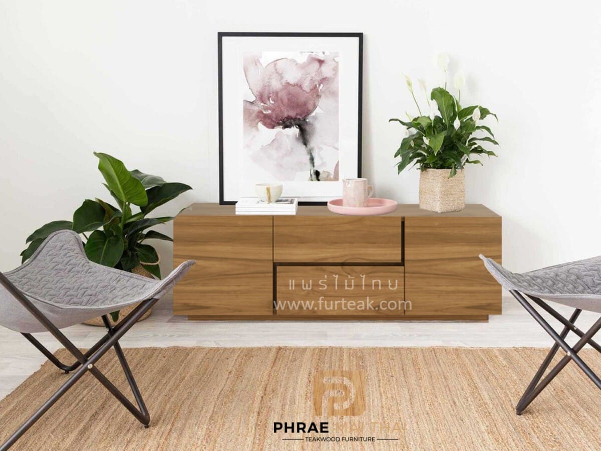 ชั้นวางทีวีโมเดิร์นไม้สัก ประกอบไปด้วย 2 ลิ้นชักแบบดึงในตัว 2 บานเปิด-ปิด สีสักทอง เป็นไม้สักทองอบแห้ง ซึ่งคุณสมบัติของไม้เป็นไม้เนื้อแข็งอายุตั้งแต่ 30 ปีขึ้นไป เราเลือกใช้ไม้สักที่มีคุณภาพและใช้กระบวนการอบไม้ จึงทำให้ไม้มีการคงสภาพ ความชื้นน้อย และโอกาสไม้หดตัวน้อยมาก