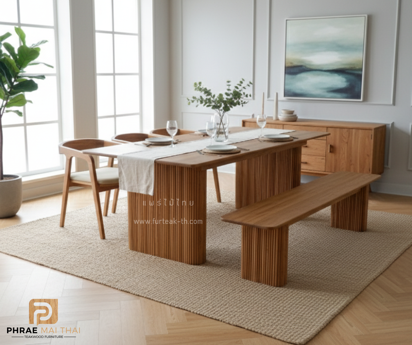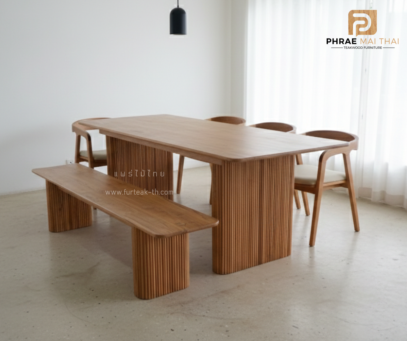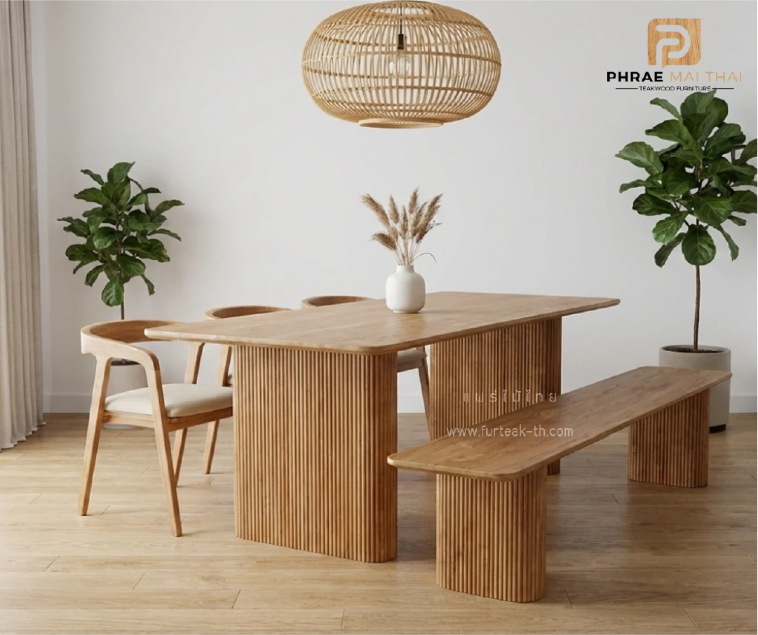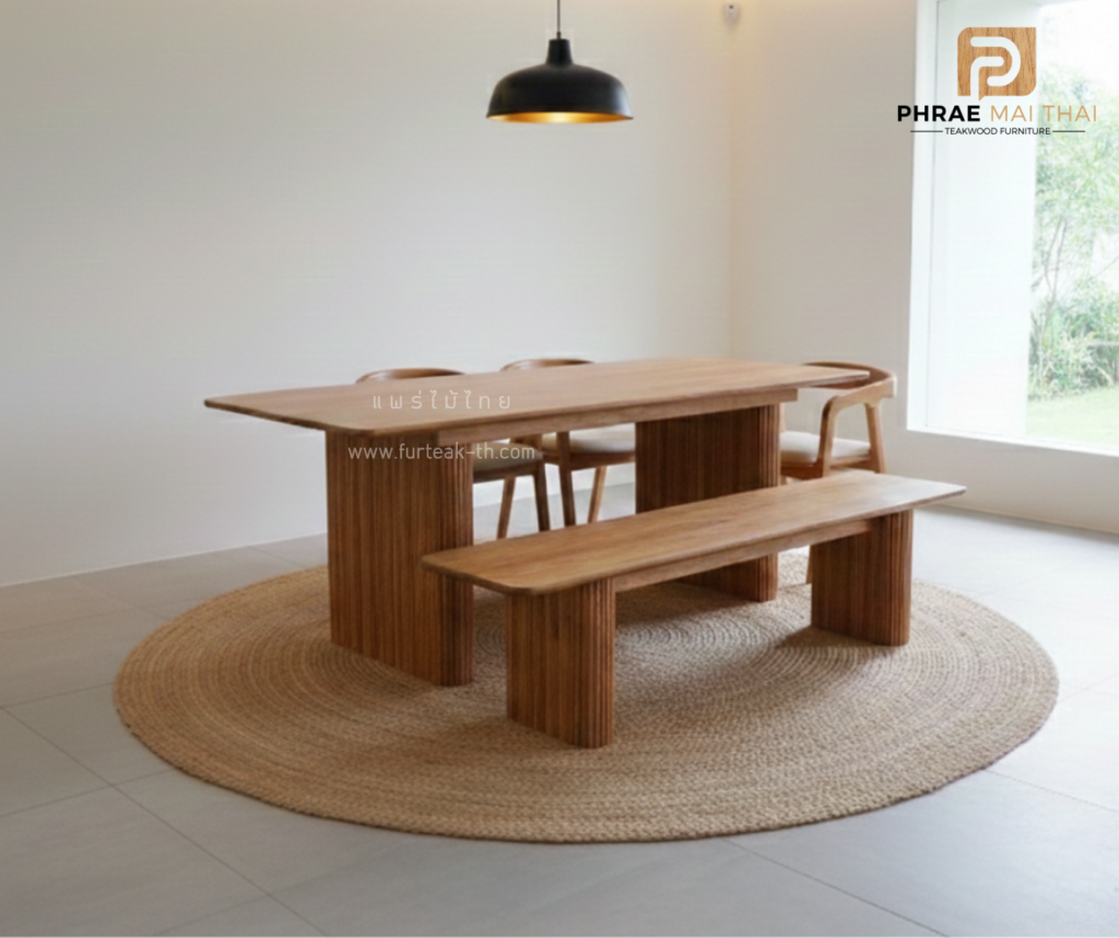 ชุดโต๊ะอาหาร 2.5 เมตร + ม้านั่ง พร้อมเก้าอี้มีเบาะ 3 ตัว เป็นไม้สักทองอบแห้ง ซึ่งคุณสมบัติของไม้เป็นไม้เนื้อแข็งอายุตั้งแต่ 30 ปีขึ้นไป เราเลือกใช้ไม้สักที่มีคุณภาพและใช้กระบวนการอบไม้ จึงทำให้ไม้มีการคงสภาพ ความชื้นน้อย และโอกาสไม้หดตัวน้อยมาก