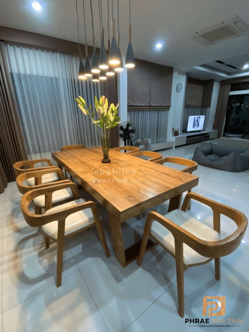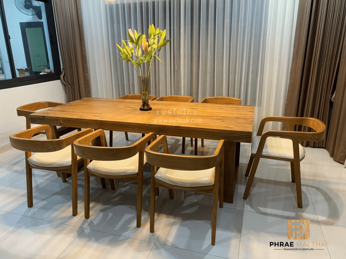 ชุดโต๊ะอาหารขาคางหมู 2.5 เมตร พร้อมเก้าอี้มีเบาะ 8 ตัว เป็นไม้สักทองอบแห้ง ซึ่งคุณสมบัติของไม้เป็นไม้เนื้อแข็งอายุตั้งแต่ 30 ปีขึ้นไป เราเลือกใช้ไม้สักที่มีคุณภาพและใช้กระบวนการอบไม้ จึงทำให้ไม้มีการคงสภาพ ความชื้นน้อย และโอกาสไม้หดตัวน้อยมาก