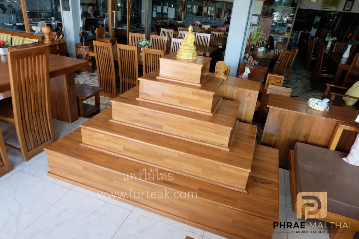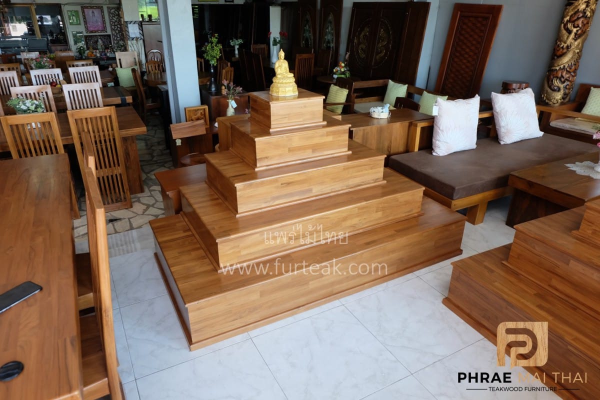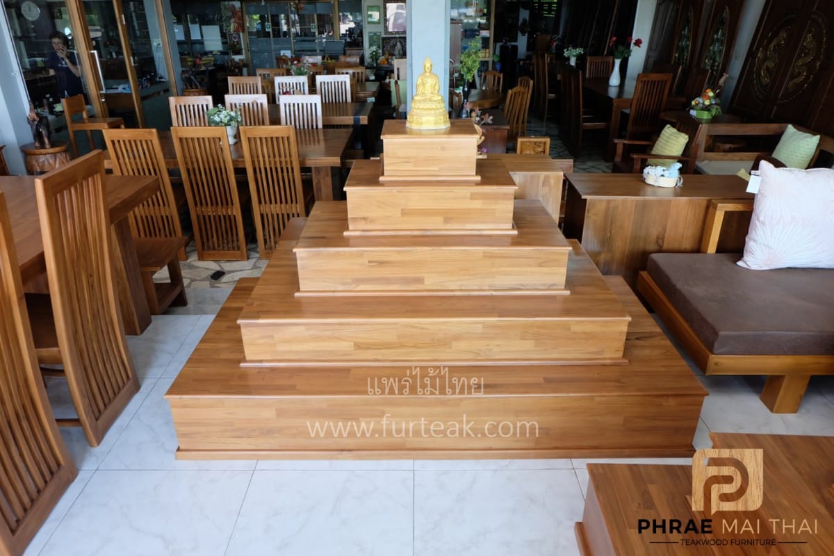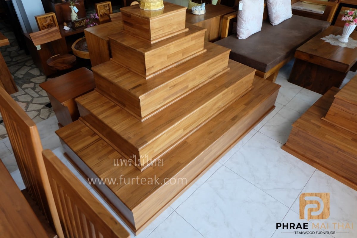 โต๊ะหมู่บูชาโมเดิร์นเรียบ ฐานล่างประกอบไปด้วย 3 ลิ้นชักเท่ากัน และ 1 ลิ้นชักวางของไหว้ เป็นไม้สักทองอบแห้งทั้งหมด สีสักทอง (ถอดประกอบได้) ซึ่งคุณสมบัติของไม้เป็นไม้เนื้อแข็งอายุตั้งแต่ 30-50 ปีขึ้นไป เราเลือกใช้ไม้สักที่มีคุณภาพและใช้กระบวนการอบไม้ จึงทำให้ไม้มีการคงสภาพ ความชื้นน้อย ไม้ไม่หด หรือ แตกงอ