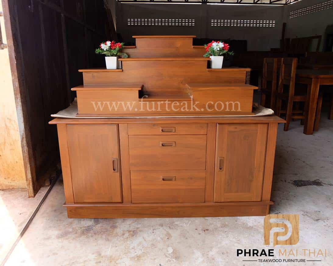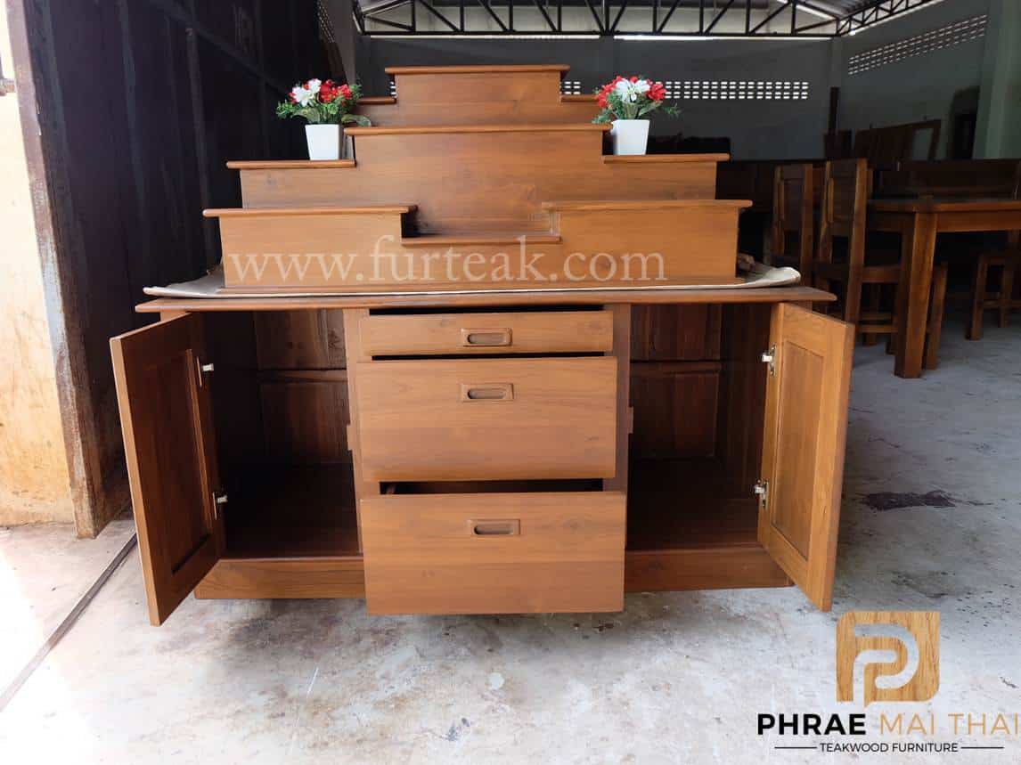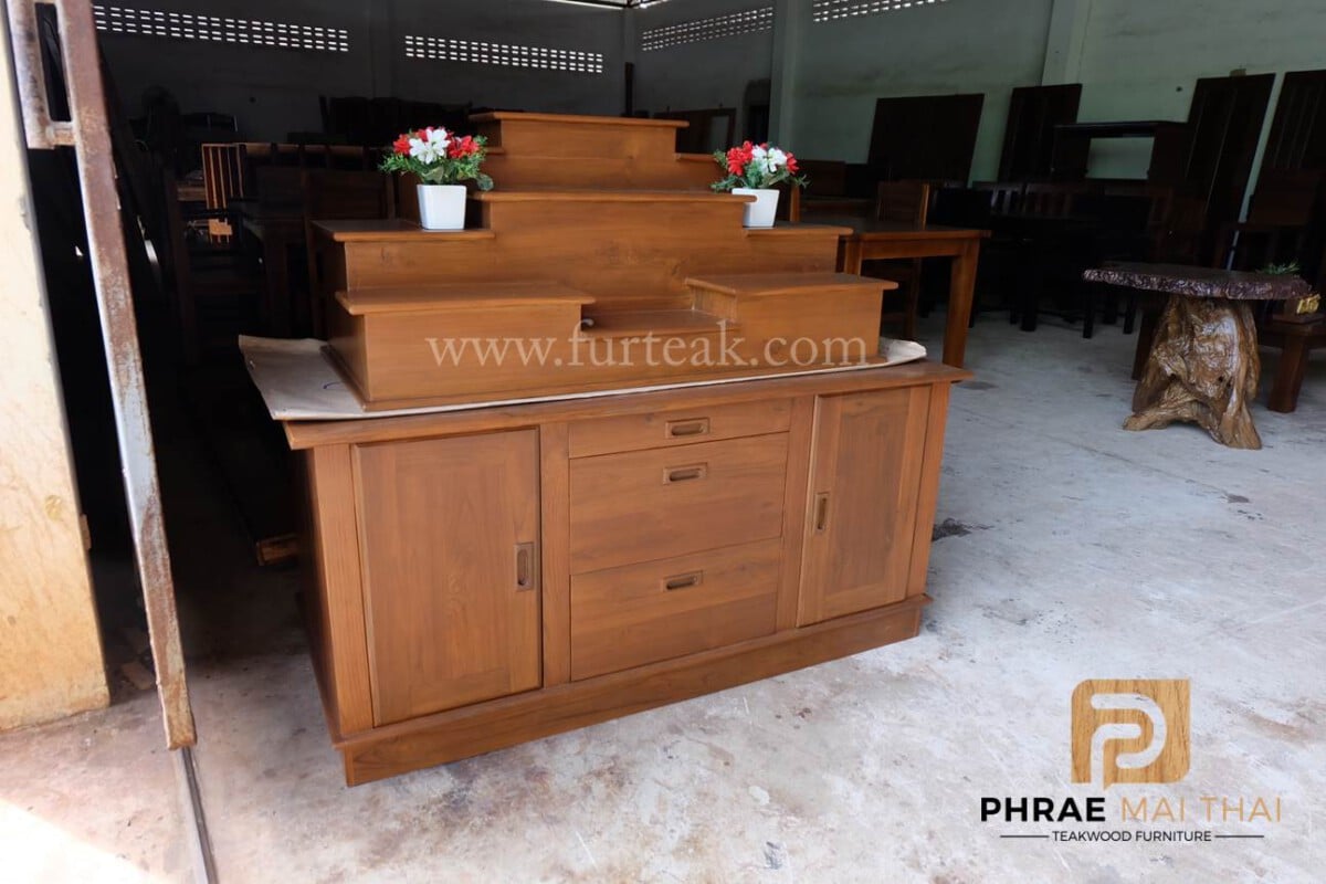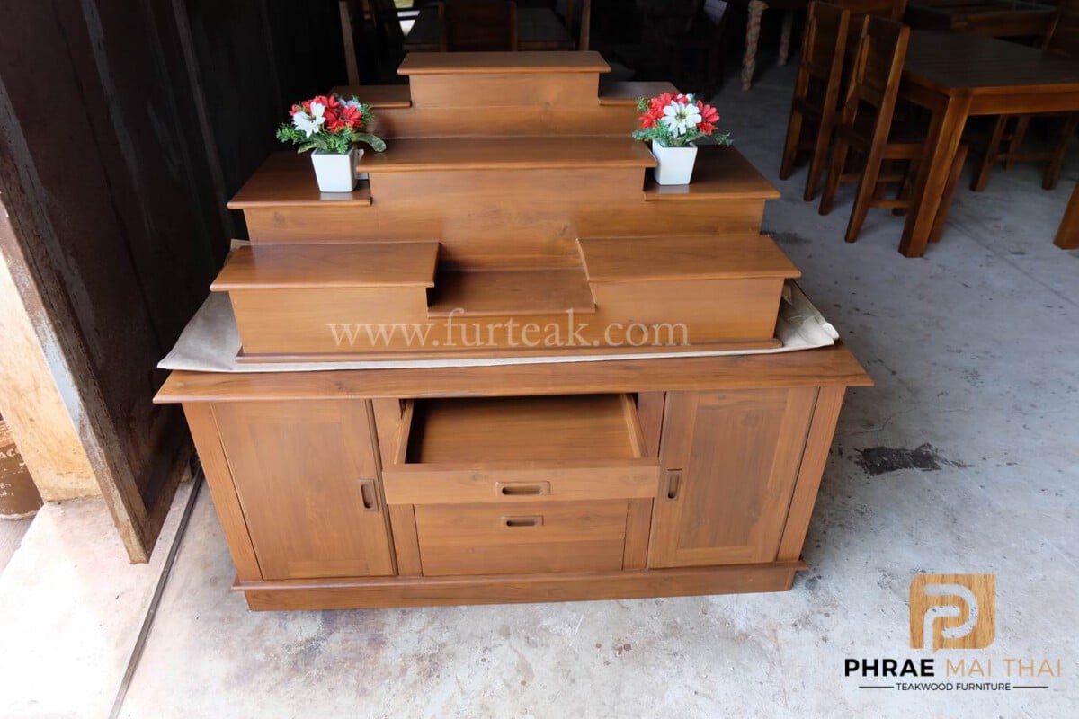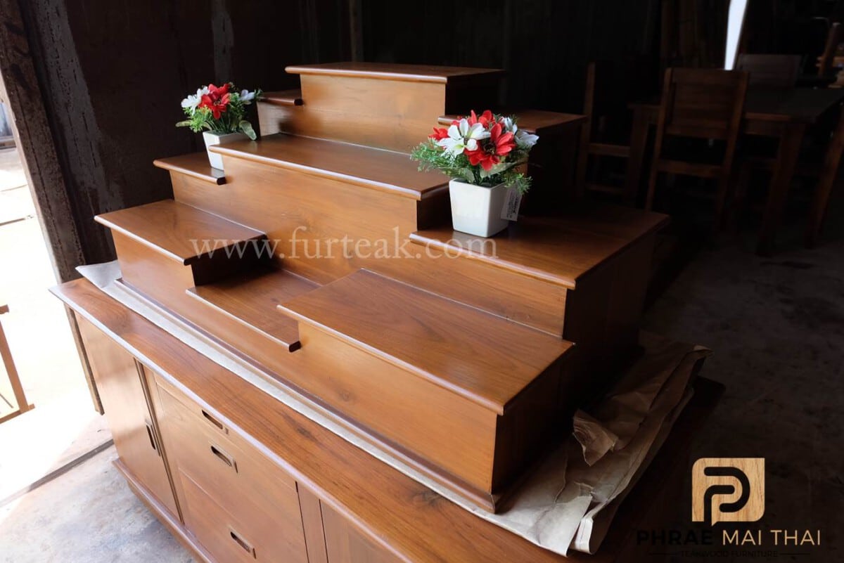 โต๊ะหมู่บูชาโมเดิร์นเรียบ พร้อมตู้อเนกประสงค์ ลิ้นชักด้านล่างสามารถวางของไหว้ถวายพระได้ สีสักเข้ม เป็นไม้สักทองอบแห้ง ประกอบไปด้วยโต๊ะด้านบน 9ตัว (ถอดประกอบได้) ซึ่งคุณสมบัติของไม้เป็นไม้เนื้อแข็งอายุตั้งแต่ 30 ปีขึ้นไป เราเลือกใช้ไม้สักที่มีคุณภาพและใช้กระบวนการอบไม้ จึงทำให้ไม้มีการคงสภาพ ความชื้นน้อย โอกาสไม้หด หรือ แตกงอน้อยมาก