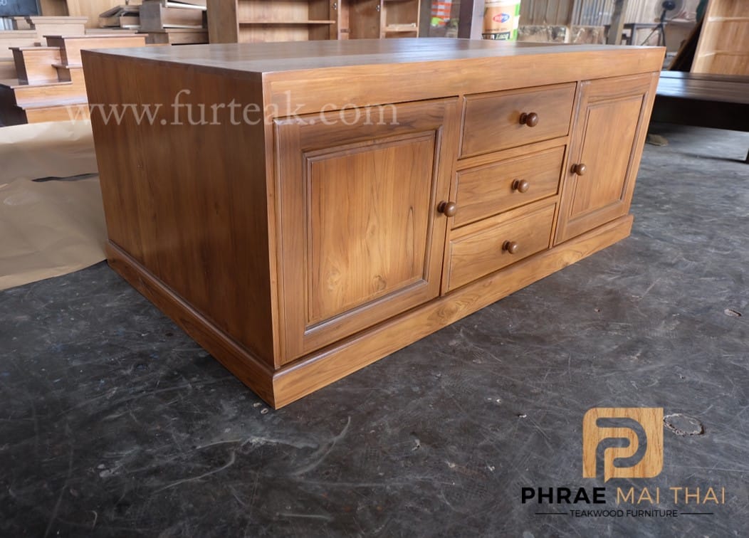 โต๊ะหมู่บูชาโมเดิร์นเรียบ ท่อนบนที่วางพระประธาน กว้าง 38*ยาว 60 ซม. และฐานล่างประกอบไปด้วย  3 ลิ้นชัก  2 บานเปิด-ปิด เป็นไม้สักทองอบแห้งสีสักทอง