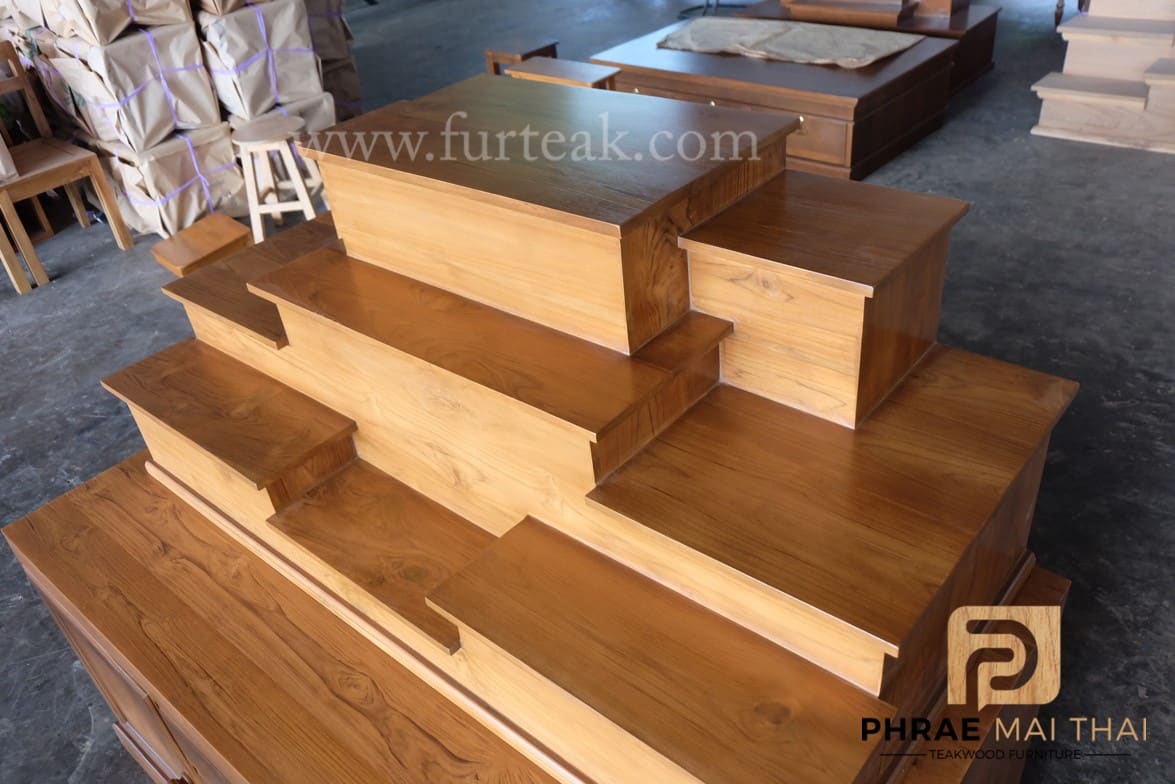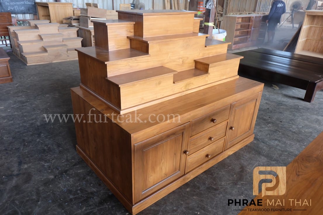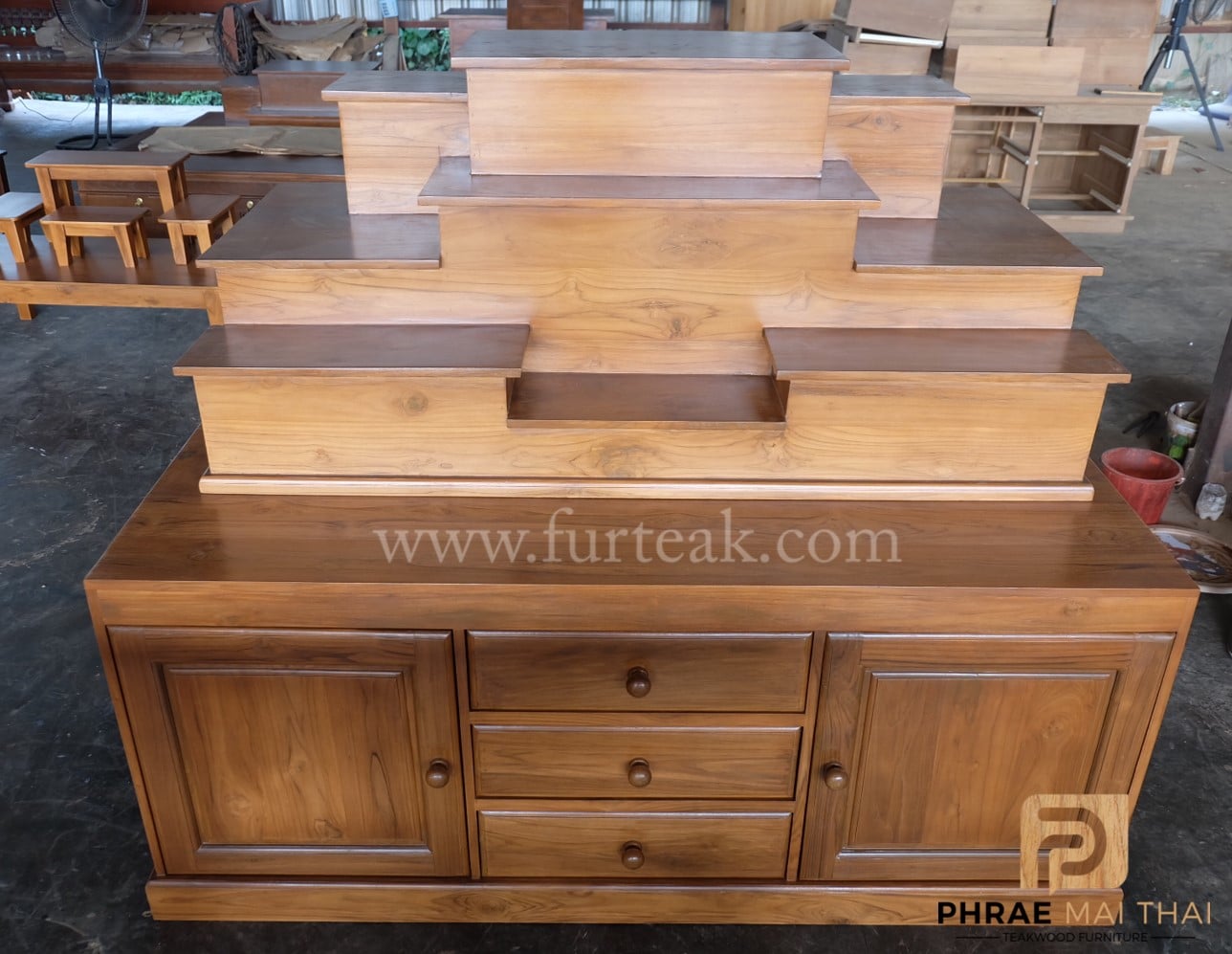 โต๊ะหมู่บูชาโมเดิร์นเรียบ ท่อนบนที่วางพระประธาน กว้าง 38*ยาว 60 ซม. และฐานล่างประกอบไปด้วย  3 ลิ้นชัก  2 บานเปิด-ปิด เป็นไม้สักทองอบแห้งสีสักทอง (ถอดประกอบได้ ฐานล่าง 1 ตัวและท่อนบน 1ตัว ) ซึ่งเหมาะสำหรับท่านที่กำลังมองหาที่วางพระขนาดใหญ่แต่มีพื้นที่จำกัด