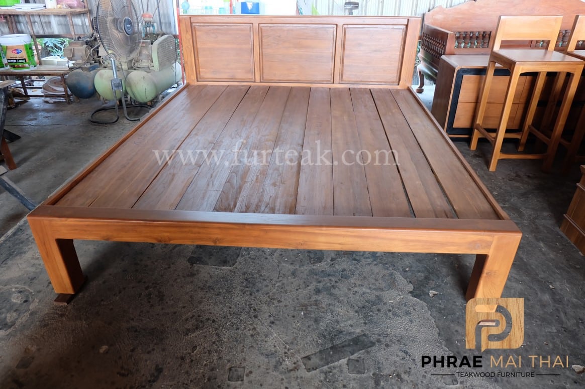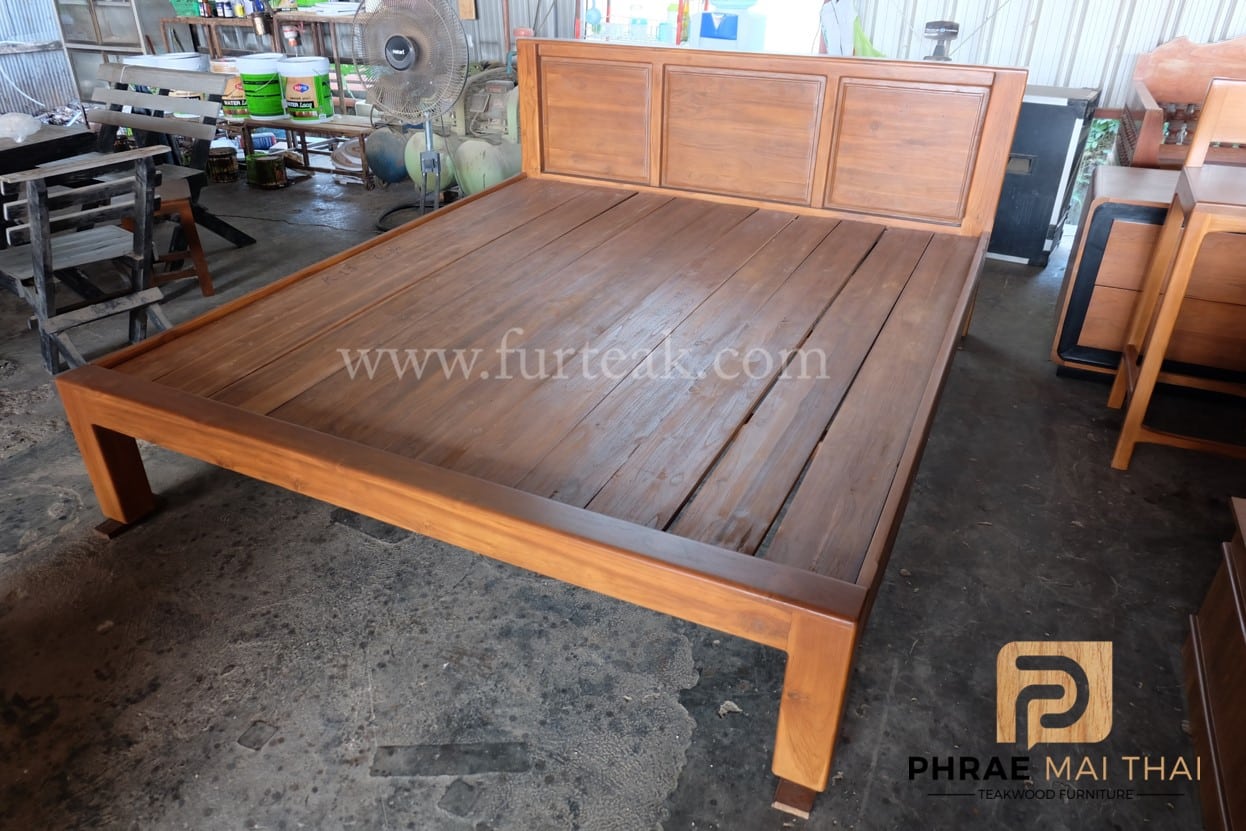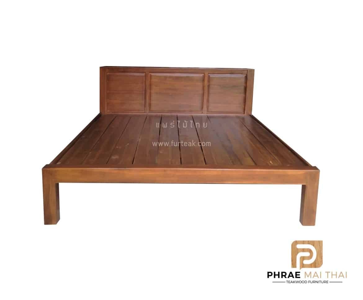 เตียงบาหลี 3 ช่อง สีสักเข้มเป็นไม้สักทองอบแห้ง หัวเตียงสูง 90 ซม. หนา 3.5 นิ้ว และท้ายเตียงสูง 40 ซม. หนา 3.5 นิ้ว