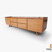This TV stand features 6 compartments with double-door panels and pull handles. It is crafted from kiln-dried golden teak wood, a durable hardwood aged over 30 years. We carefully select high-quality teak and use a wood-drying process to ensure stability, low moisture content, and minimal shrinkage over time.