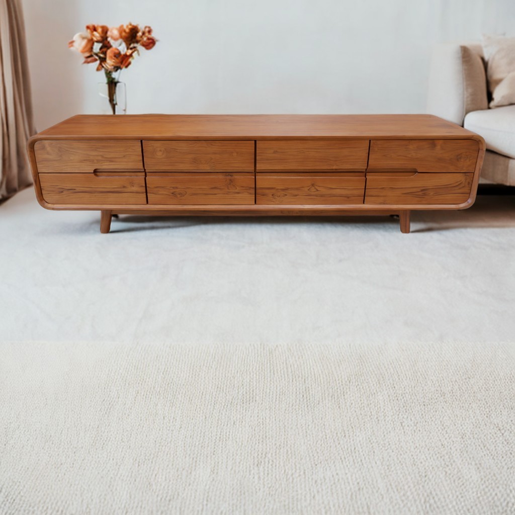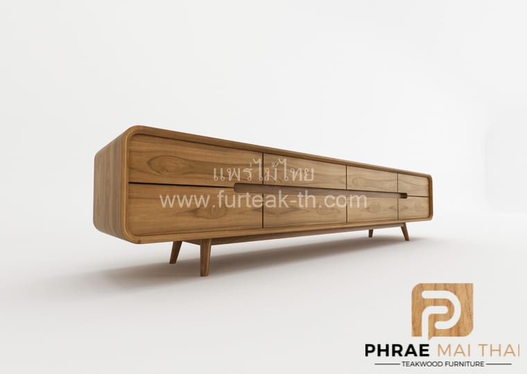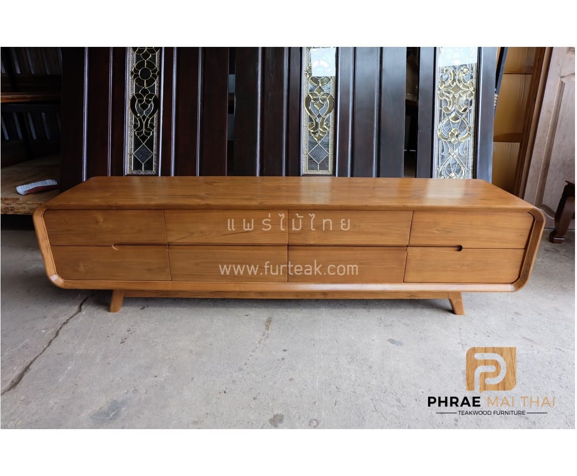 ชั้นวางทีวีขาลอย 8 ลิ้นชัก ขอบโค้ง สไตล์โมเดิร์น ป็นไม้สักทองอบ แห้ง ซึ่งคุณสมบัติของไม้เป็นไม้เนื้อแข็งอายุตั้งแต่ 30 ปีขึ้นไป เราเลือกใช้ไม้สักที่มีคุณภาพและใช้กระบวนการอบไม้ จึงทำให้ไม้มีการคงสภาพ ความชื้นน้อย และโอกาสไม้หดตัวน้อยมาก