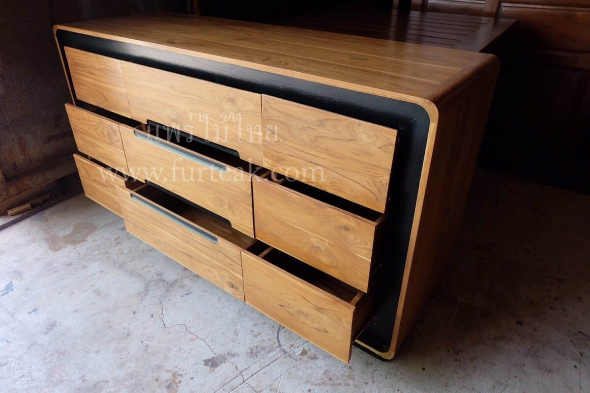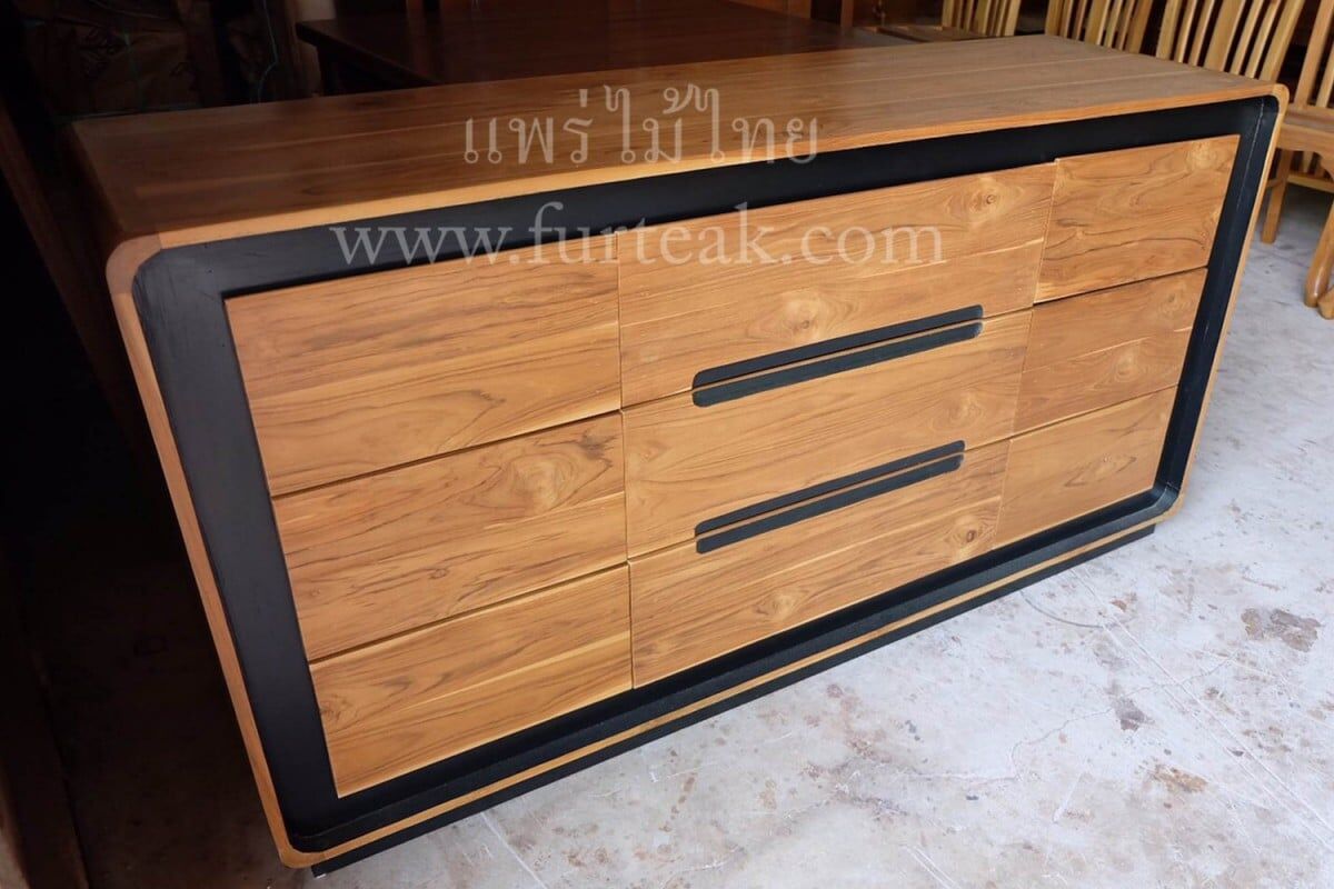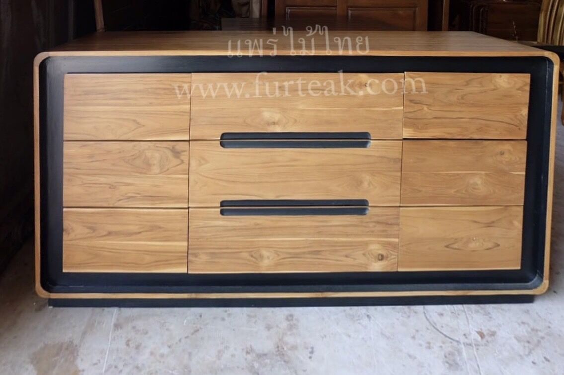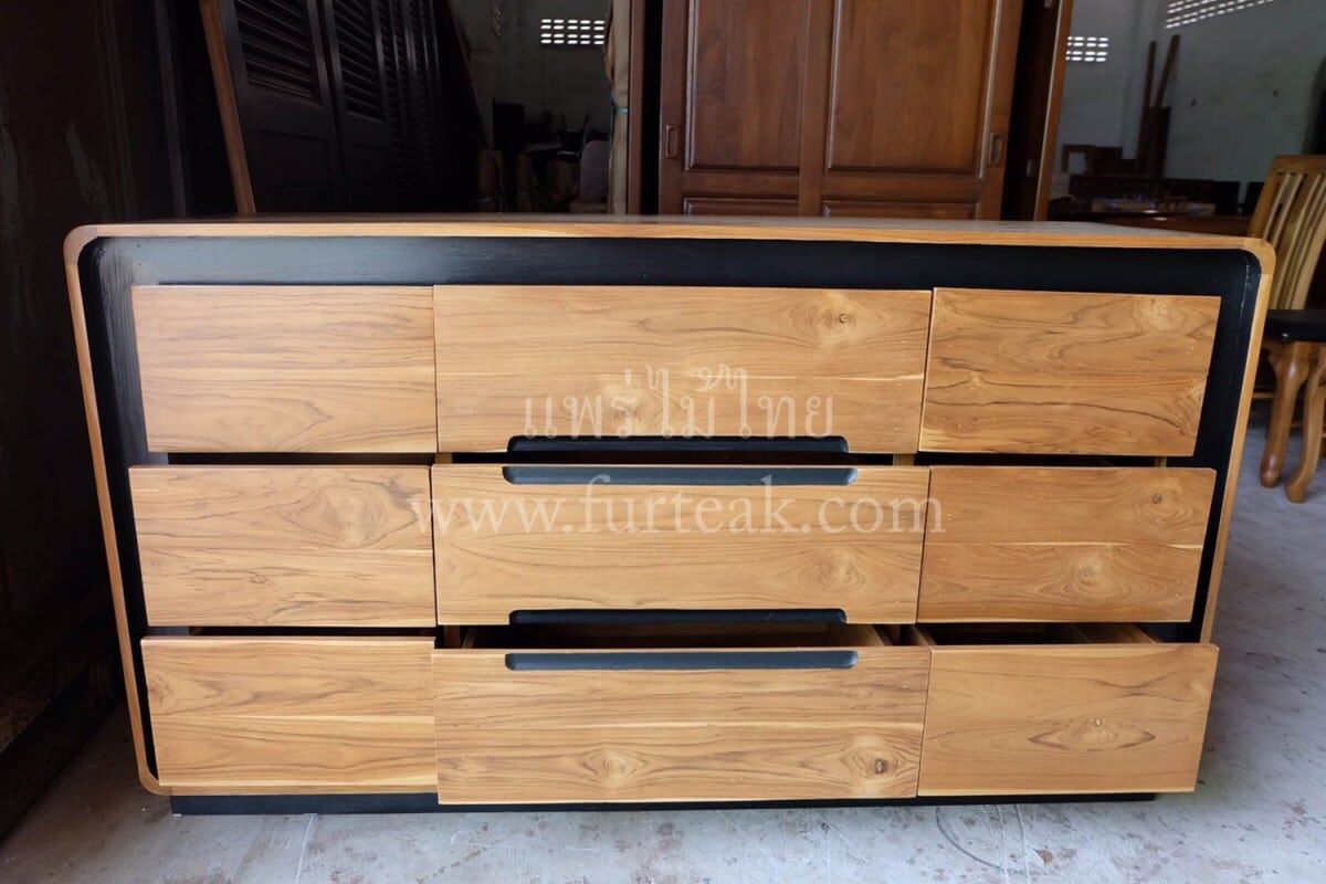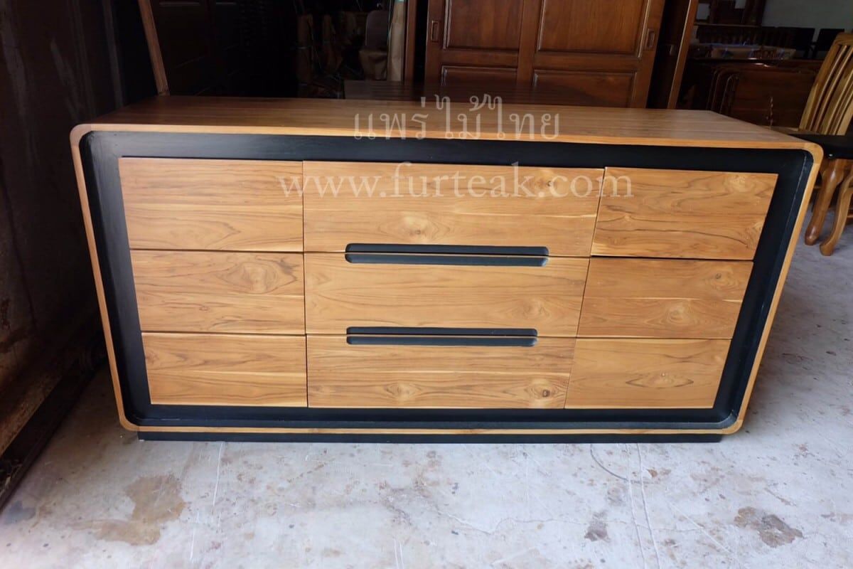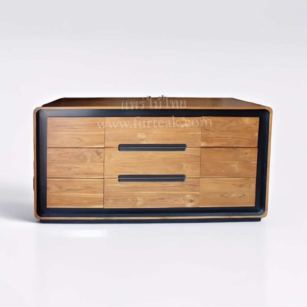 ชั้นวางทีวี Sideboard 9 ลิ้นชัก modern art สีสักธรรมชาติเป็นไม้สักทองอบแห้ง ซึ่งคุณสมบัติของไม้เป็นไม้เนื้อแข็งอายุตั้งแต่ 30 ปีขึ้นไป เราเลือกใช้ไม้สักที่มีคุณภาพและใช้กระบวนการอบไม้ จึงทำให้ไม้มีการคงสภาพ ความชื้นน้อย และโอกาสไม้หดตัวน้อยมาก