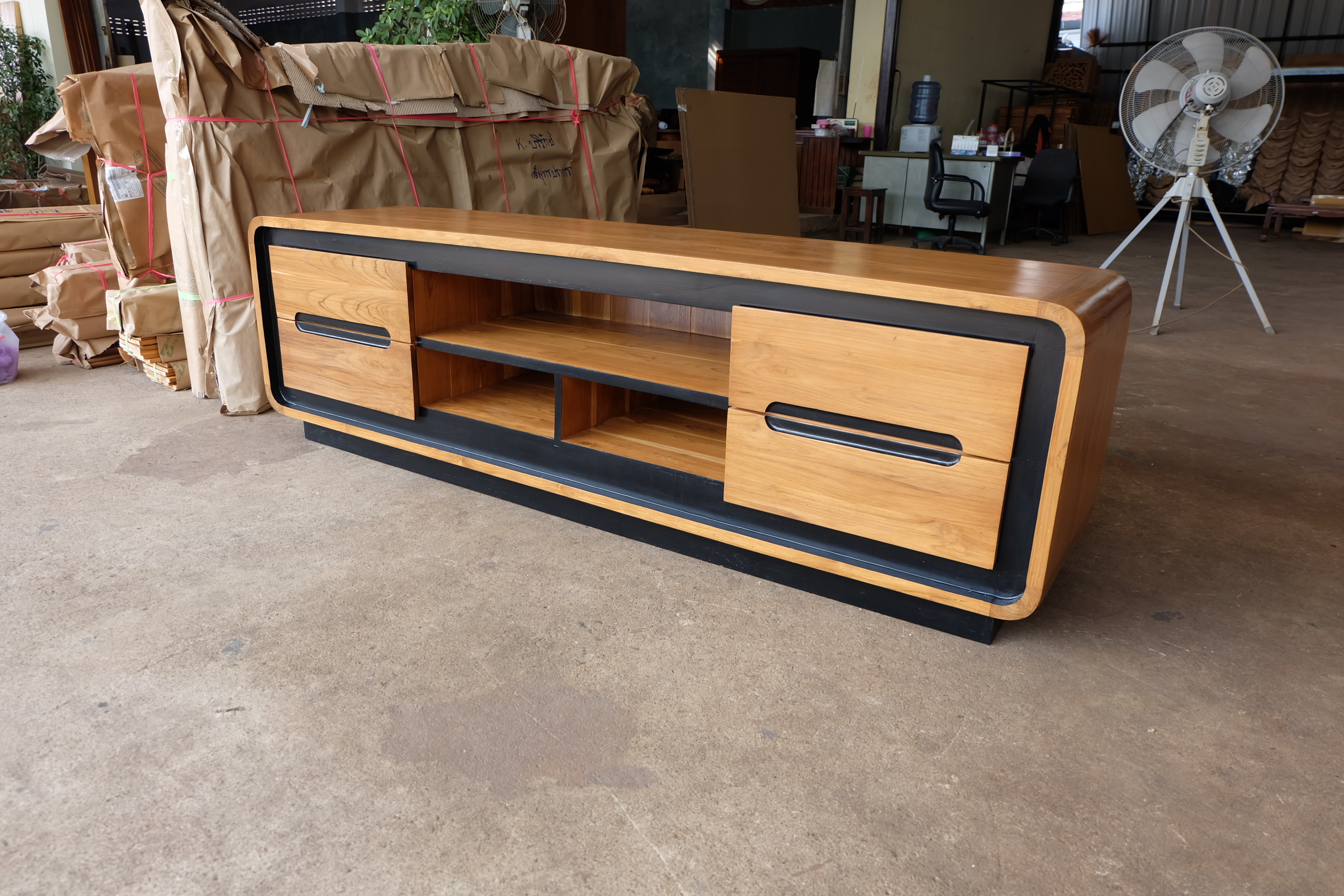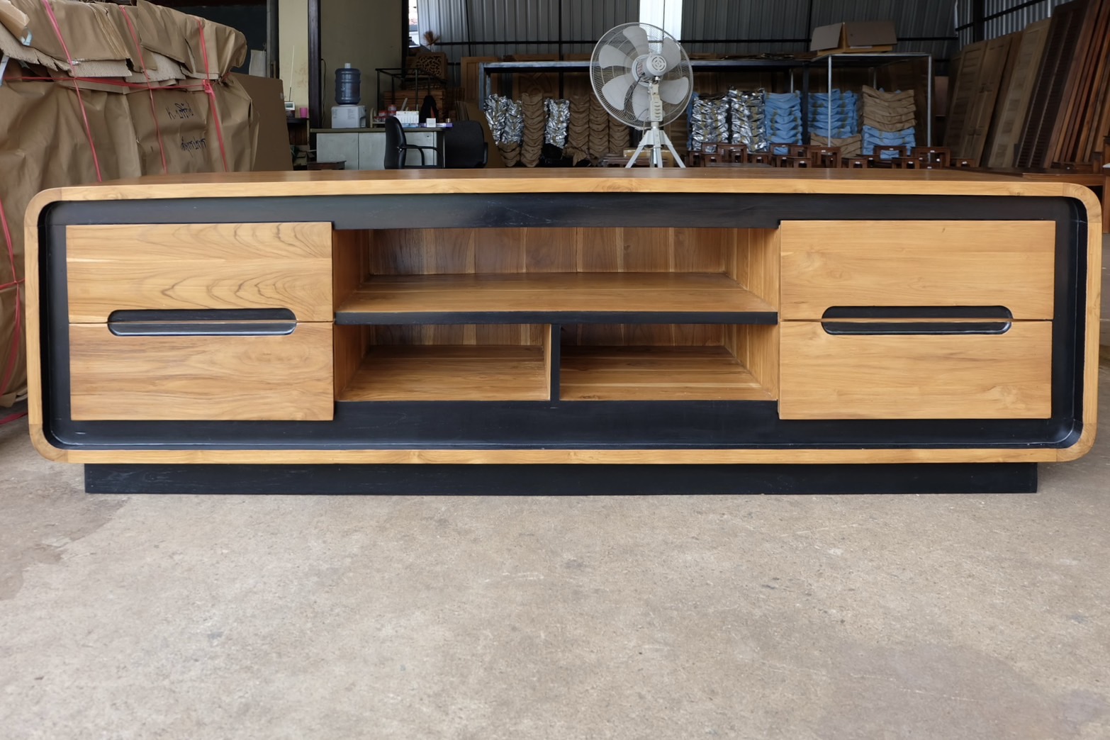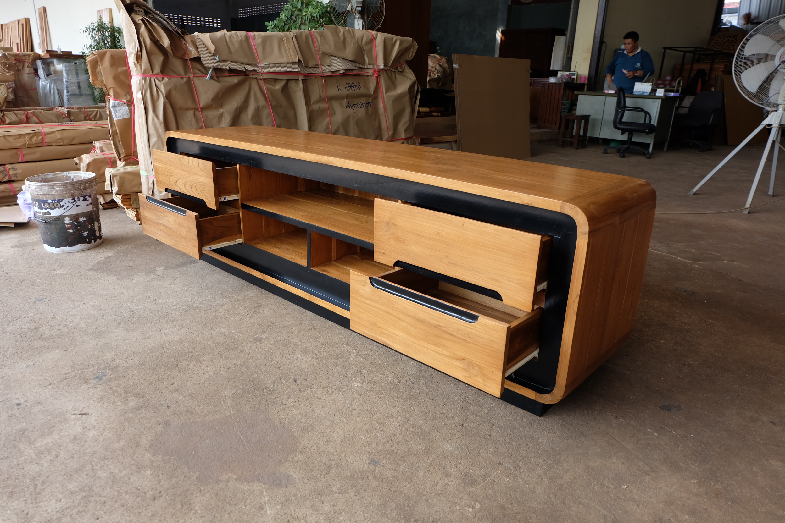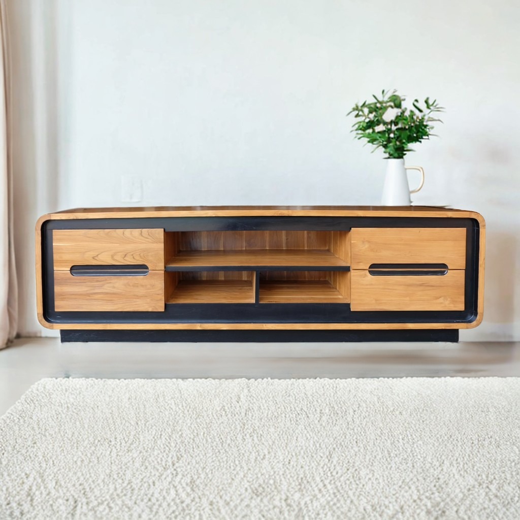 ชั้นวางทีวีโมเดิร์น 4 ลิ้นชักสีสักเข้ม คาดดำ เป็นไม้สักทองอบแห้ง ซึ่งคุณสมบัติของไม้เป็นไม้เนื้อแข็งอายุตั้งแต่ 30 ปีขึ้นไป เราเลือกใช้ไม้สักที่มีคุณภาพและใช้กระบวนการอบไม้ จึงทำให้ไม้มีการคงสภาพ ความชื้นน้อย และโอกาสไม้หดตัวน้อยมาก