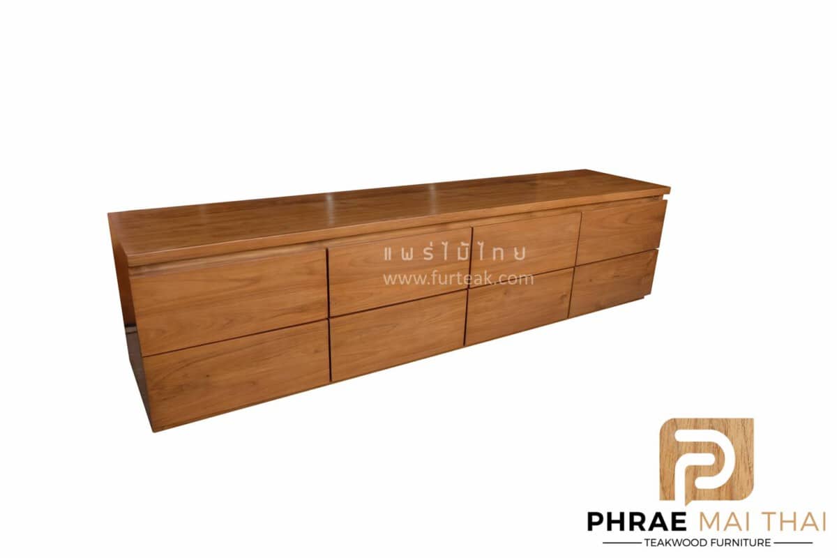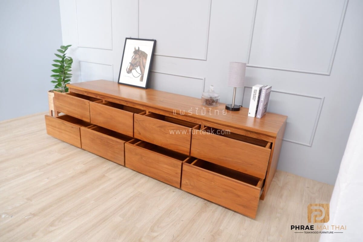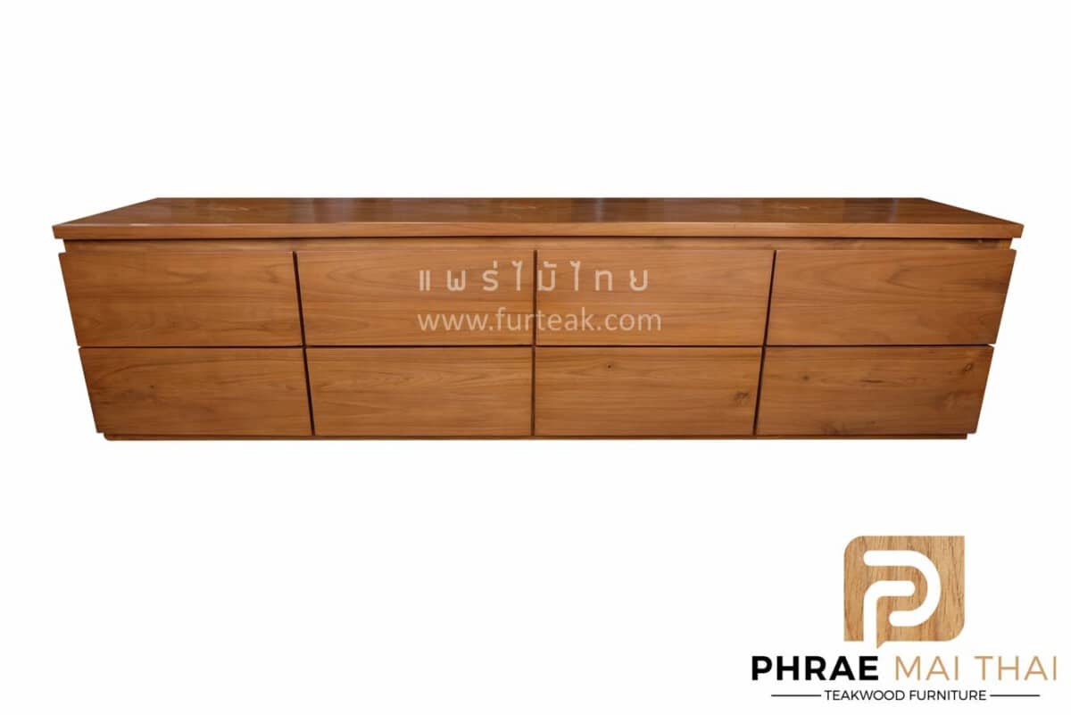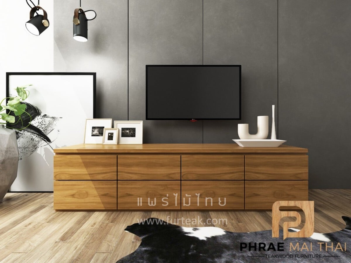 ชั้นวางทีวีโมเดิร์นไม้สัก ประกอบไปด้วย 8 ลิ้นชักแบบดึงในตัว สีสักทอง เป็นไม้สักทองอบแห้ง ซึ่งคุณสมบัติของไม้เป็นไม้เนื้อแข็งอายุตั้งแต่ 30 ปีขึ้นไป เราเลือกใช้ไม้สักที่มีคุณภาพและใช้กระบวนการอบไม้ จึงทำให้ไม้มีการคงสภาพ ความชื้นน้อย และโอกาสไม้หดตัวน้อยมาก