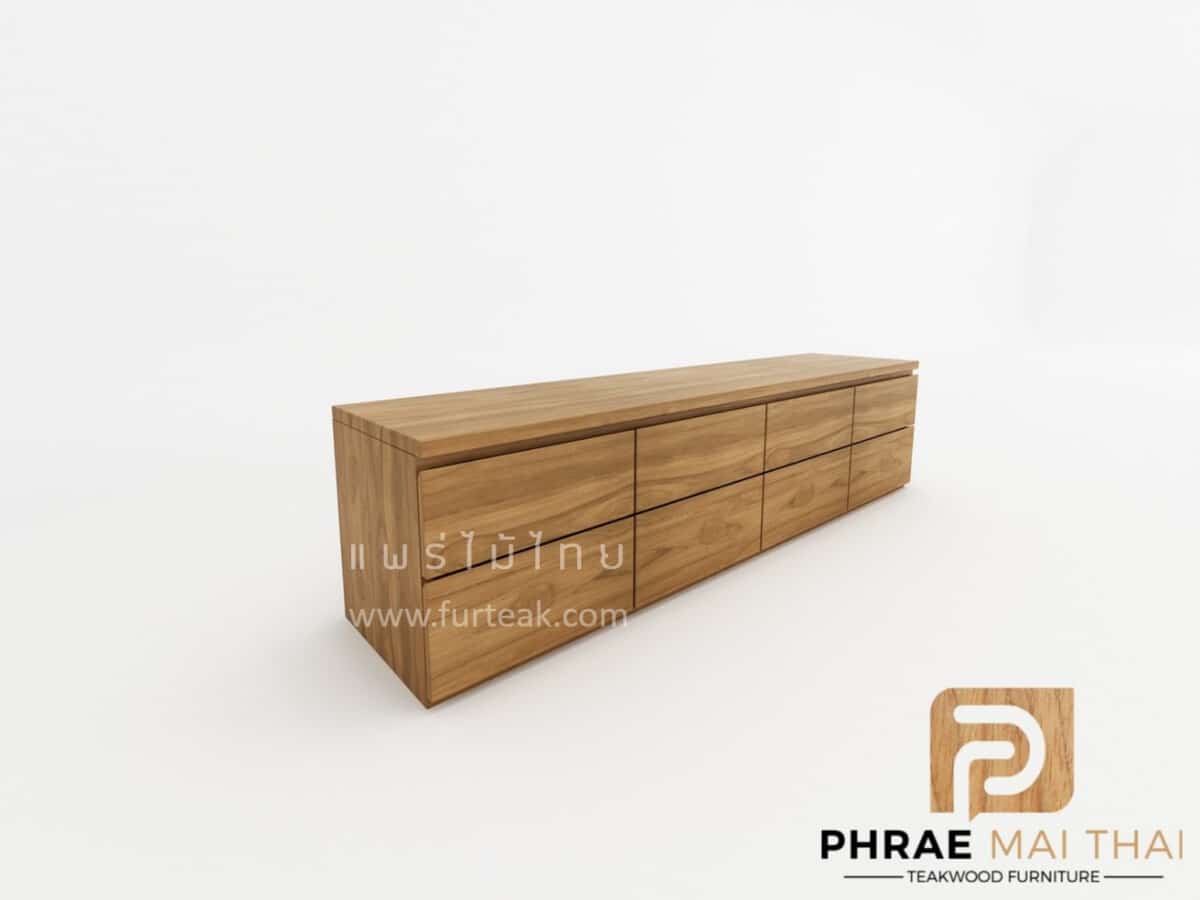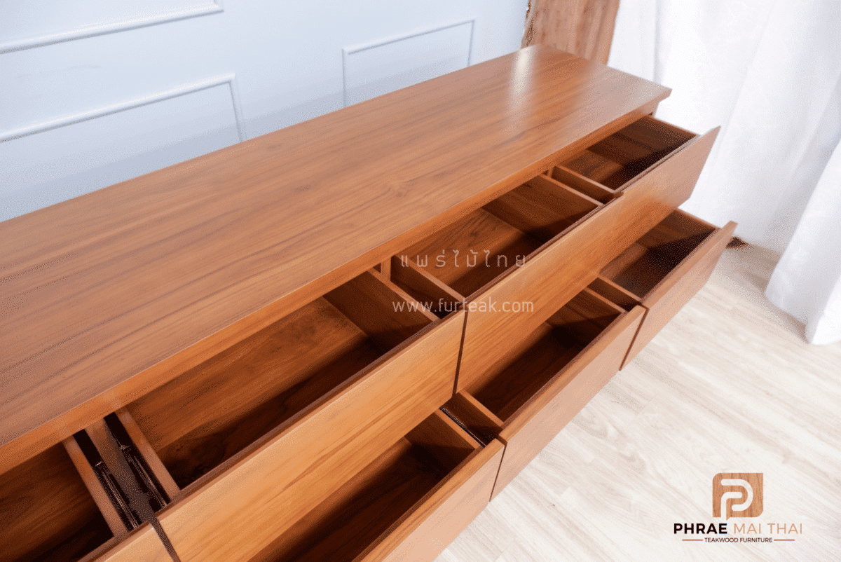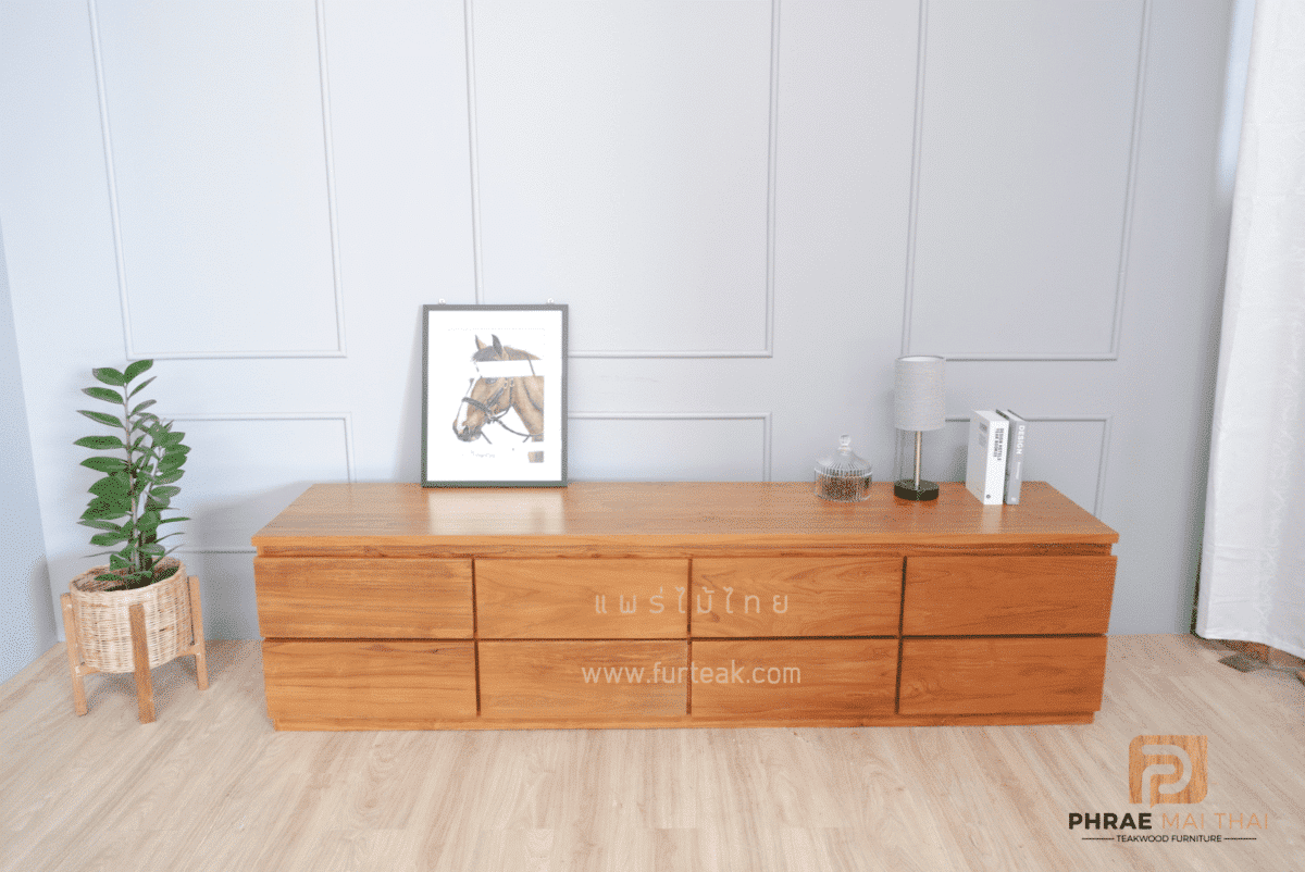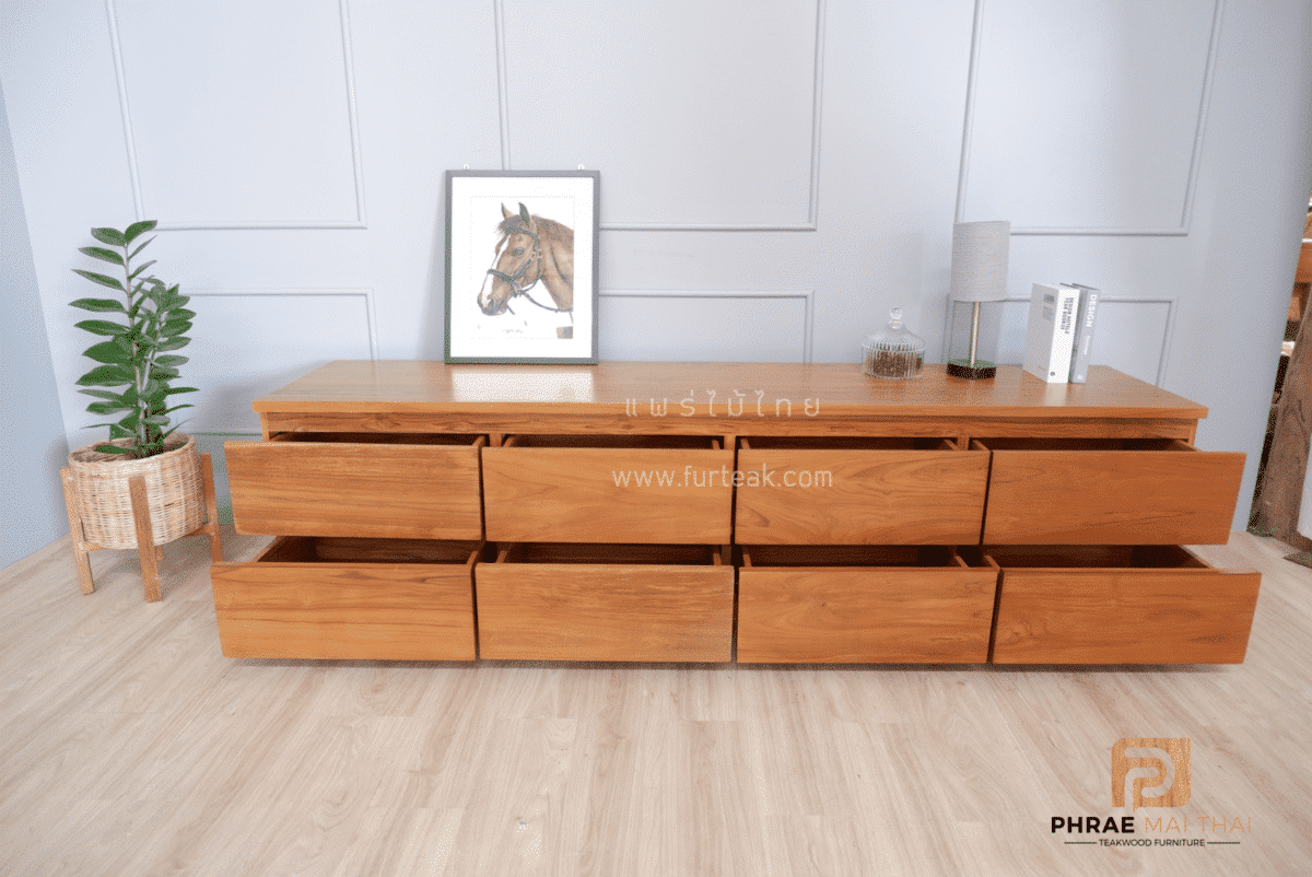 ชั้นวางทีวีโมเดิร์นไม้สัก ประกอบไปด้วย 8 ลิ้นชักแบบดึงในตัว สีสักทอง เป็นไม้สักทองอบแห้ง ซึ่งคุณสมบัติของไม้เป็นไม้เนื้อแข็งอายุตั้งแต่ 30 ปีขึ้นไป เราเลือกใช้ไม้สักที่มีคุณภาพและใช้กระบวนการอบไม้ จึงทำให้ไม้มีการคงสภาพ ความชื้นน้อย และโอกาสไม้หดตัวน้อยมาก