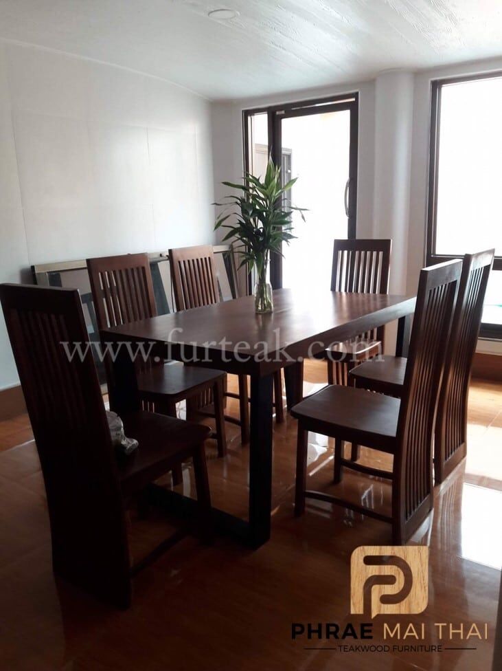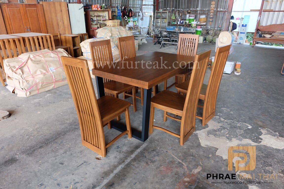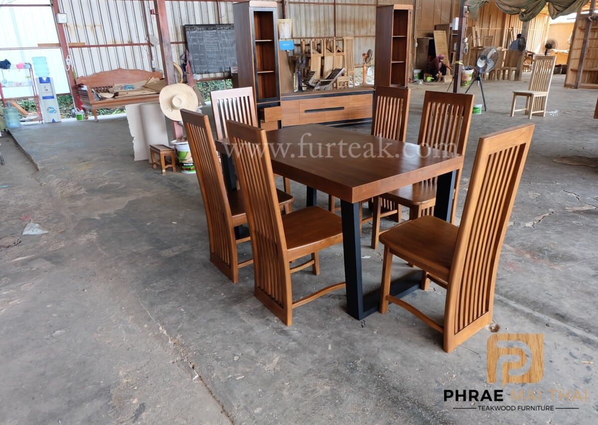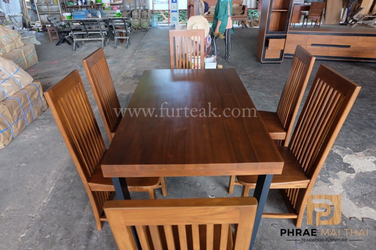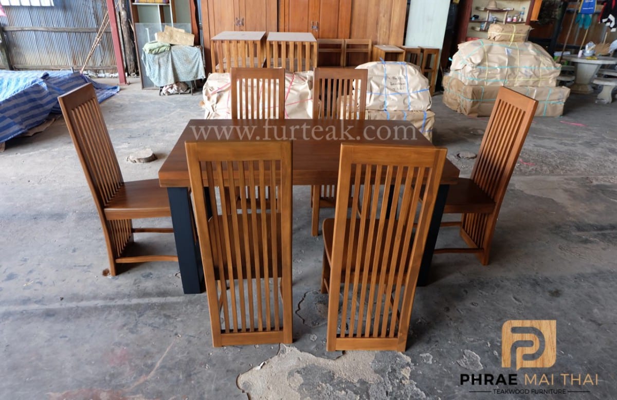 ชุดโต๊ะอาหารโมเดิร์น ขาคางหมูเป็นไม้สักทาสีดำพร้อมเก้าอี้ซี่ยาว  6 ตัวสีสักทอง(เคลือบด้าน) เป็นไม้สักทองอบแห้ง ซึ่งคุณสมบัติของไม้เป็นไม้เนื้อแข็งอายุตั้งแต่ 30 ปีขึ้นไป เราเลือกใช้ไม้สักที่มีคุณภาพและใช้กระบวนการอบไม้ จึงทำให้ไม้มีการคงสภาพ ความชื้นน้อย และโอกาสไม้หดตัวน้อยมาก