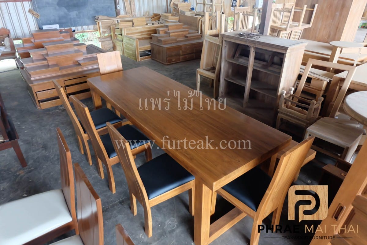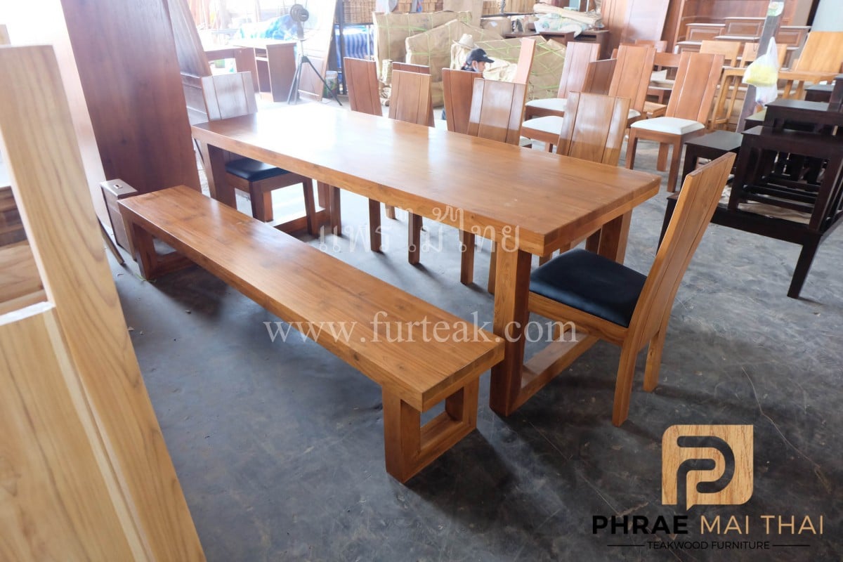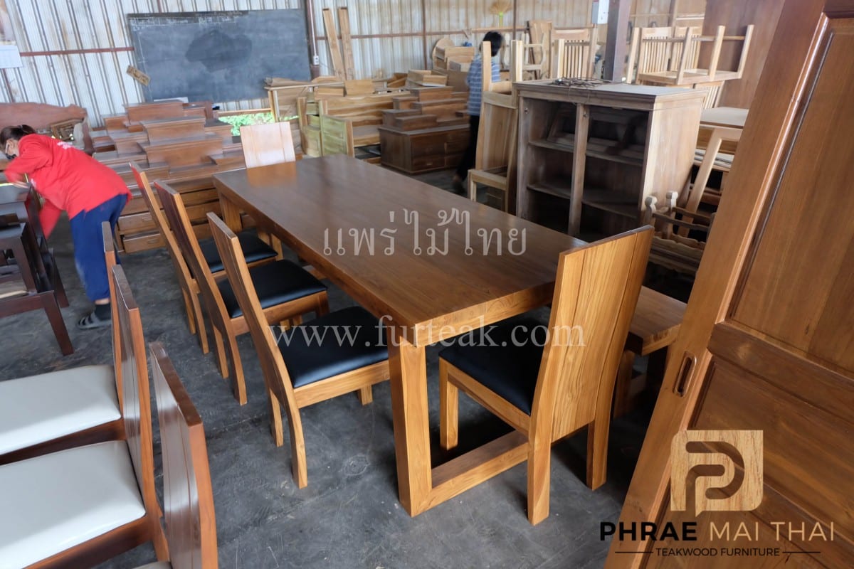 ชุดโต๊ะอาหารไม้สักโมเดิร์น ไม้ทั้งหมดขากล่องทรงสี่เหลี่ยม เก้าอี้ 5 ที่นั่งพร้อมเบาะ และ ม้านั่งยาว ขากล่อง สีสักทองกึ่งธรรมชาติเป็นไม้สักทองอบแห้ง ซึ่งคุณสมบัติของไม้เป็นไม้เนื้อแข็งอายุตั้งแต่ 30 ปีขึ้นไป เราเลือกใช้ไม้สักที่มีคุณภาพและใช้กระบวนการอบไม้ จึงทำให้ไม้มีการคงสภาพ ความชื้นน้อย และโอกาสไม้หดตัวน้อยมาก