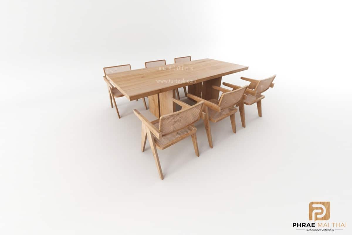 ชุดโต๊ะอาหาร โมเดิร์น ขาแฝด พร้อมเก้าอี้หวายแท้ 6 ตัว เป็นไม้สักทองอบแห้ง ซึ่งคุณสมบัติของไม้เป็นไม้เนื้อแข็งอายุตั้งแต่ 30 ปีขึ้นไป เราเลือกใช้ไม้สักที่มีคุณภาพและใช้กระบวนการอบไม้ จึงทำให้ไม้มีการคงสภาพ ความชื้นน้อย และโอกาสไม้หดตัวน้อยมาก