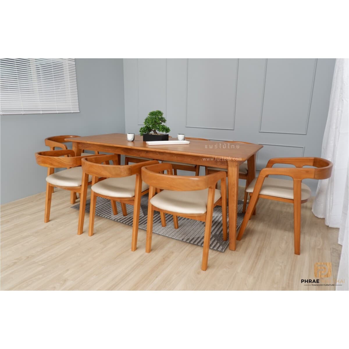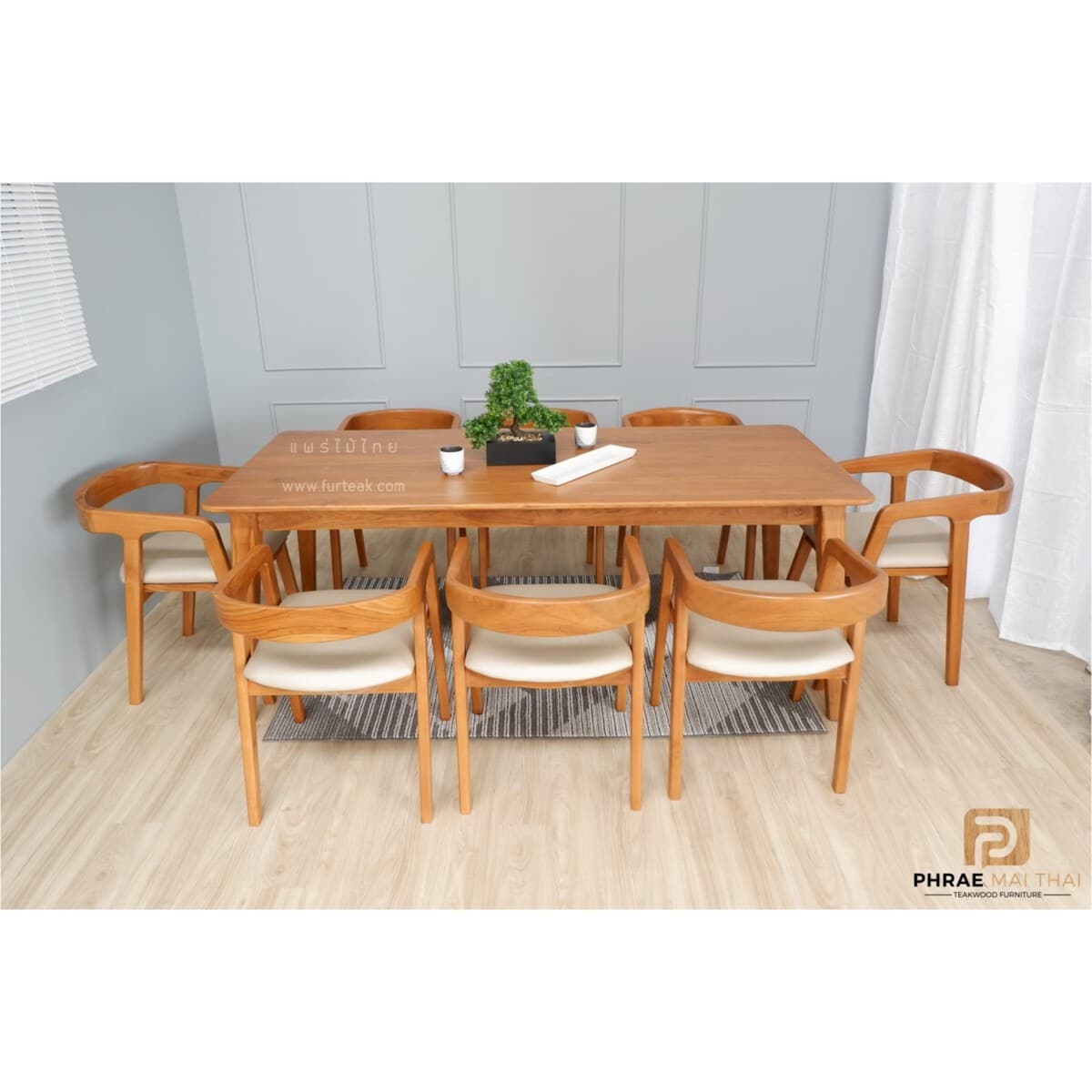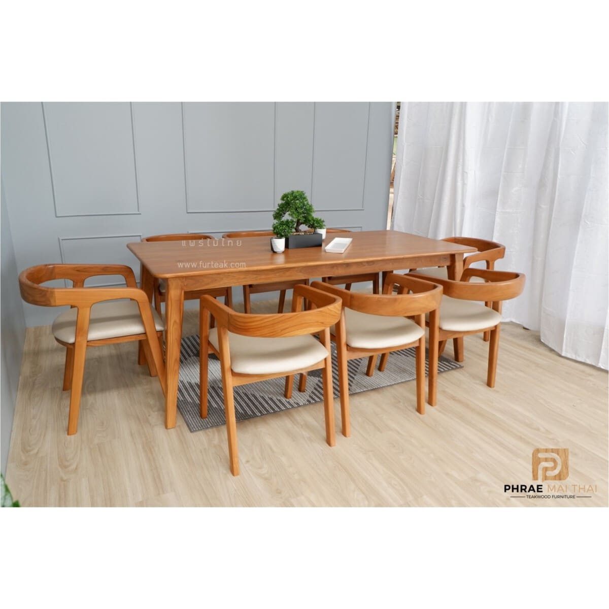 ชุดโต๊ะอาหาร ขาเฉียง พร้อมเก้าอี้มีเบาะ 8 ตัว เป็นไม้สักทองอบแห้ง ซึ่งคุณสมบัติของไม้เป็นไม้เนื้อแข็งอายุตั้งแต่ 30 ปีขึ้นไป เราเลือกใช้ไม้สักที่มีคุณภาพและใช้กระบวนการอบไม้ จึงทำให้ไม้มีการคงสภาพ ความชื้นน้อย และโอกาสไม้หดตัวน้อยมาก