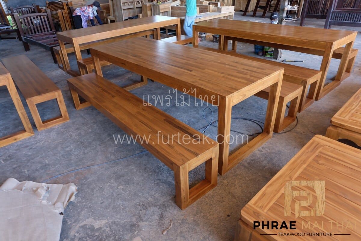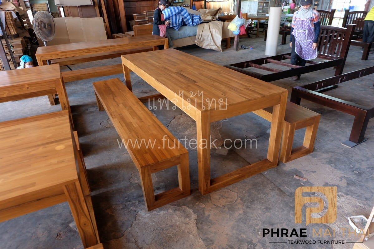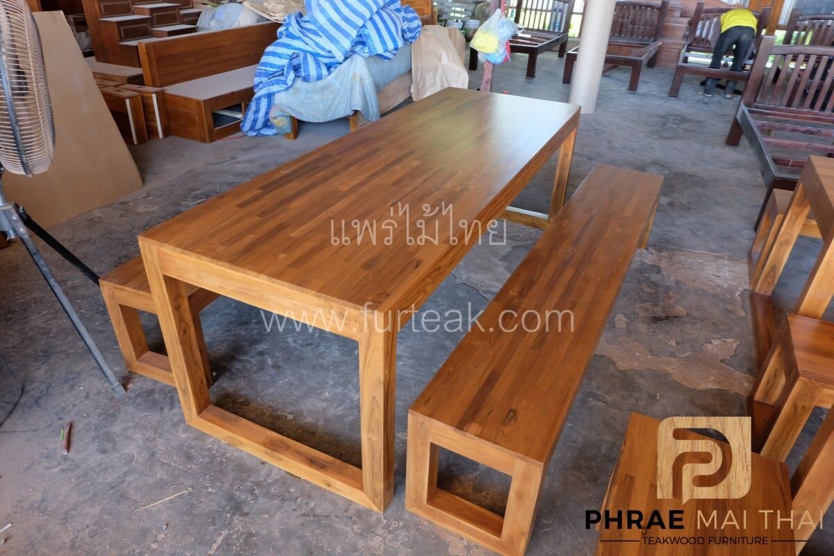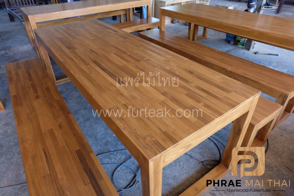 ชุดโต๊ะอาหารไม้สักโมเดิร์น ไม้สักประสาน(โดยเครื่องจักร) ประกอบไปด้วย โต๊ะยาว 1 ตัว ม้านั่งยาว 2 ที่นั่ง สีสักทองกึ่งธรรมชาติเป็นไม้สักทองอบแห้ง ซึ่งคุณสมบัติของไม้เป็นไม้เนื้อแข็งอายุตั้งแต่ 30 ปีขึ้นไป เราเลือกใช้ไม้สักที่มีคุณภาพและใช้กระบวนการอบไม้ จึงทำให้ไม้มีการคงสภาพ ความชื้นน้อย และโอกาสไม้หดตัวน้อยมาก