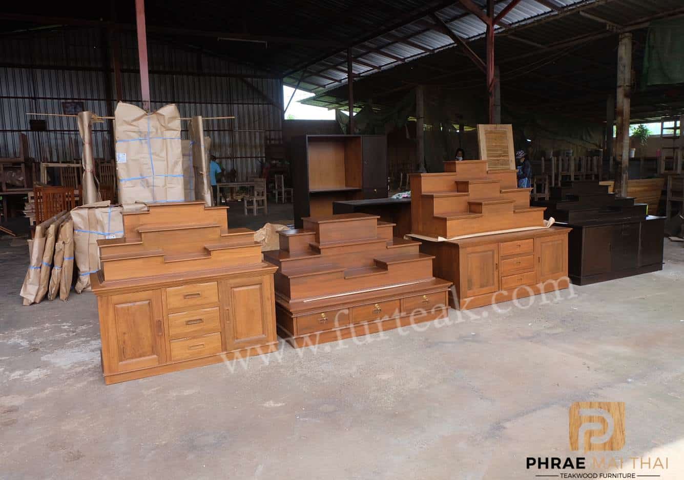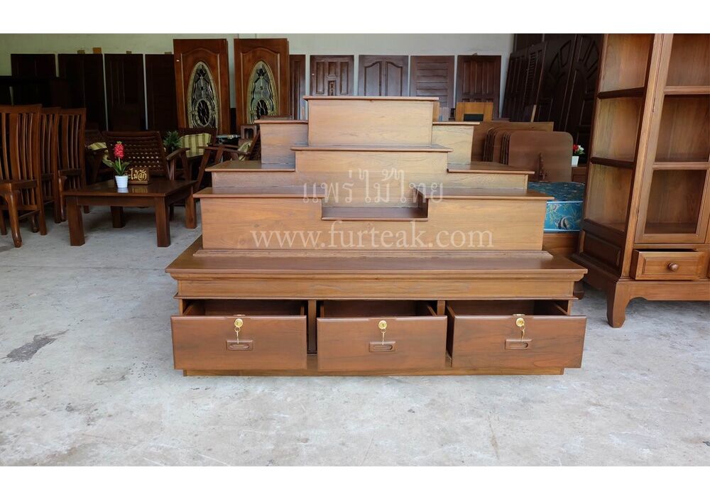 โต๊ะหมู่บูชาโมเดิร์นเรียบ ท่อนบนที่วางพระประธาน กว้าง 38*ยาว 60 ซม. และฐานล่างประกอบไปด้วย 3 ลิ้นชัก (มีกุญแจ) เป็นไม้สักทองอบแห้งสีสักเข้ม (ถอดประกอบได้ ฐานล่าง 1 ตัวและท่อนบน 1ตัว ) ซึ่งเหมาะสำหรับท่านที่กำลังมองหาที่วางพระขนาดใหญ่แต่มีพื้นที่จำกัด