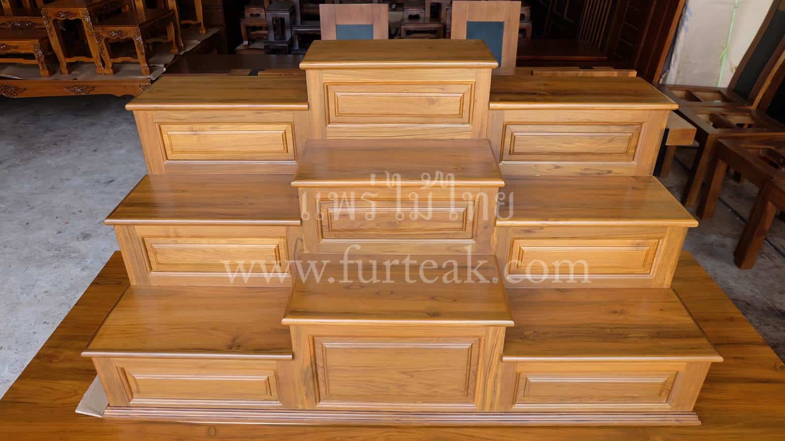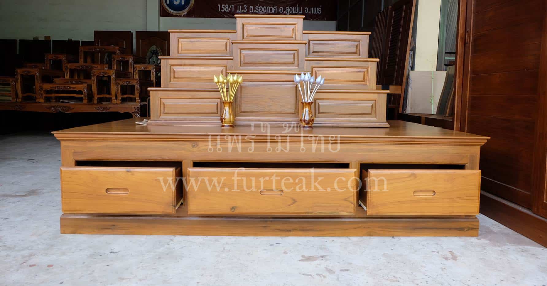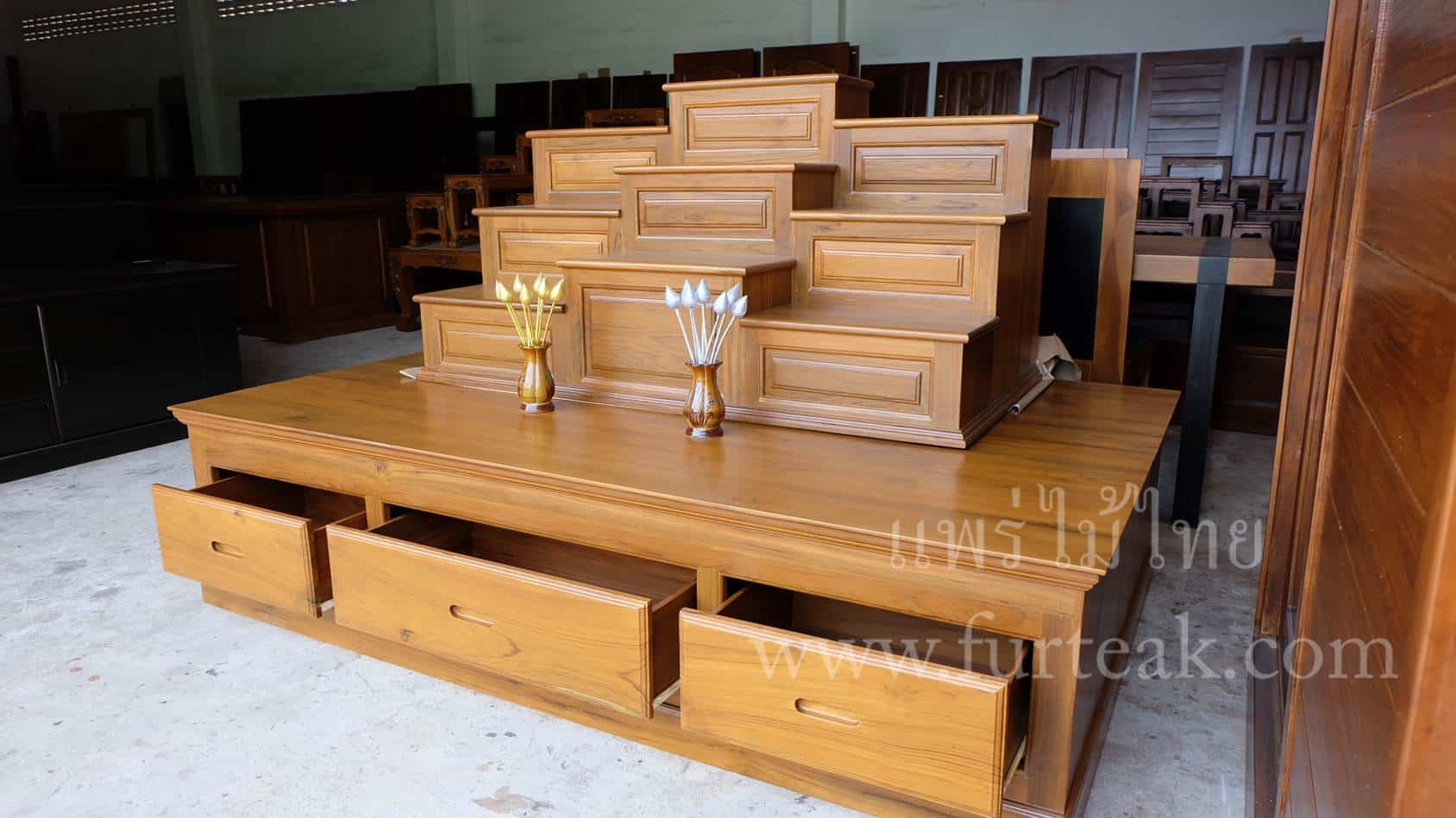 โต๊ะหมู่บูชาโมเดิร์นเรียบ ตรงฐานประกอบไปด้วย 3 ลิ้นชัก (ลิ้นชักกลางใหญ่) เป็นไม้สักทองอบแห้งสีสักทอง (ถอดประกอบได้ ฐานล่าง 1 ตัวและท่อนบน 1ตัว ) ซึ่งคุณสมบัติของไม้เป็นไม้เนื้อแข็งอายุตั้งแต่ 30-50 ปีขึ้นไป เราเลือกใช้ไม้สักที่มีคุณภาพและใช้กระบวนการอบไม้ จึงทำให้ไม้มีการคงสภาพ ความชื้นน้อย และ โอกาสไม้หดตัวน้อยมาก