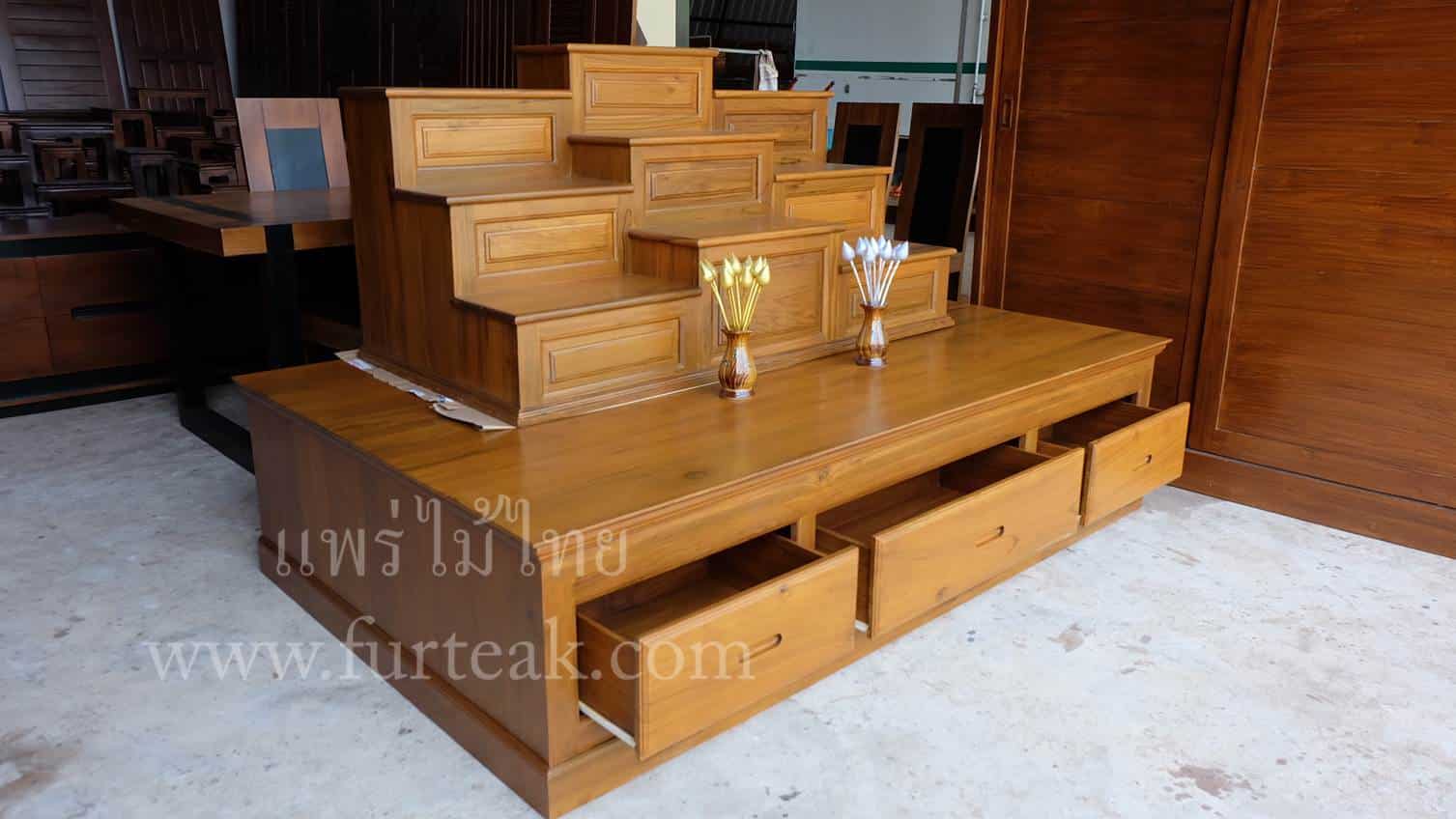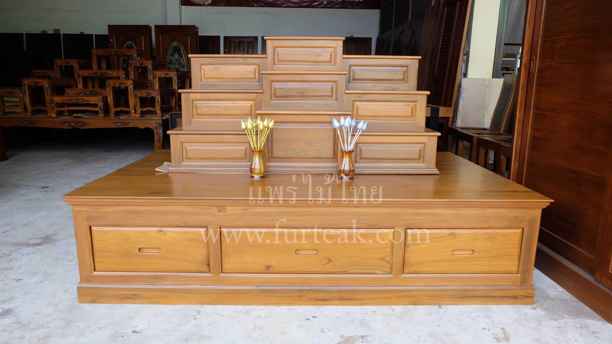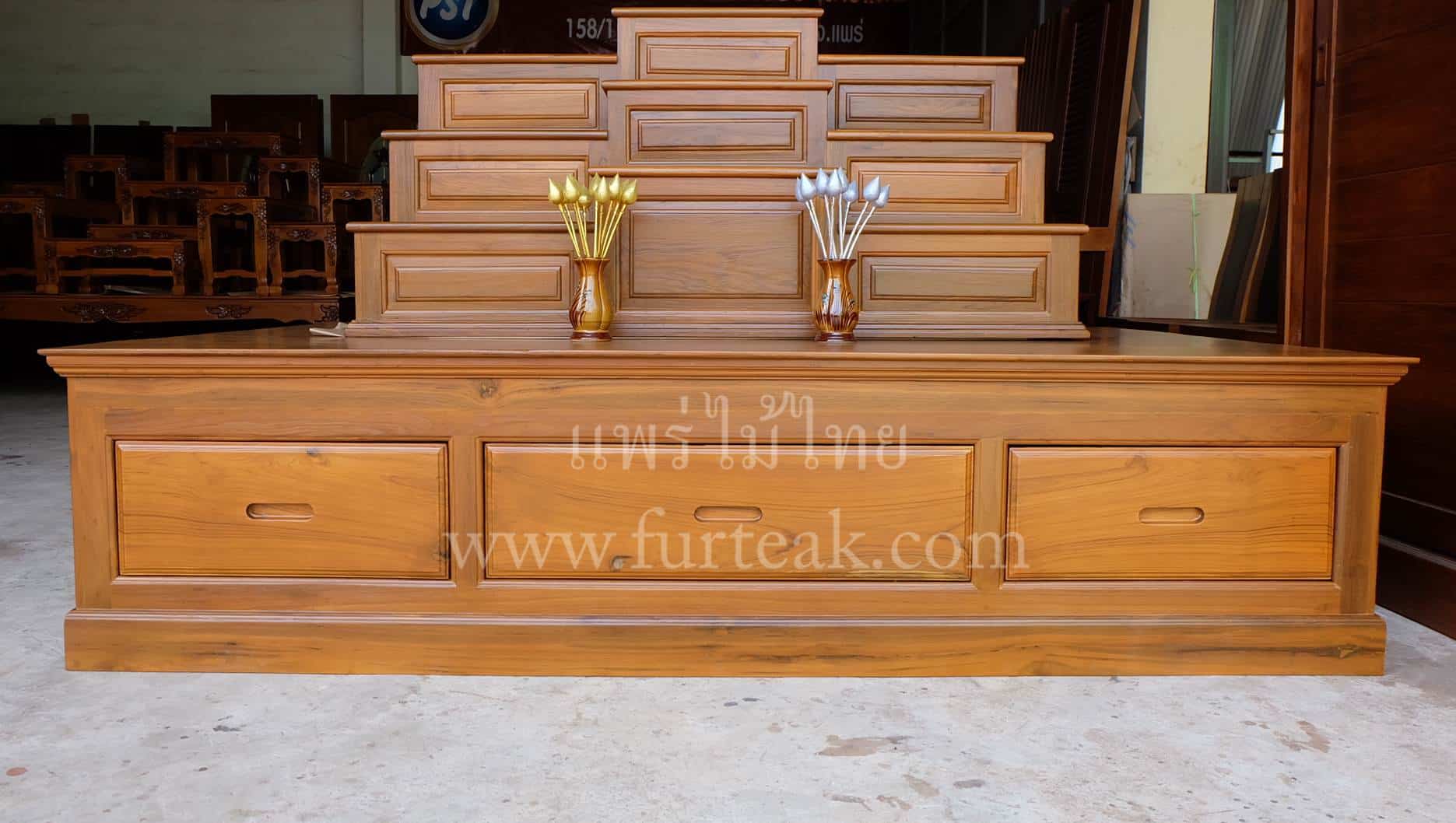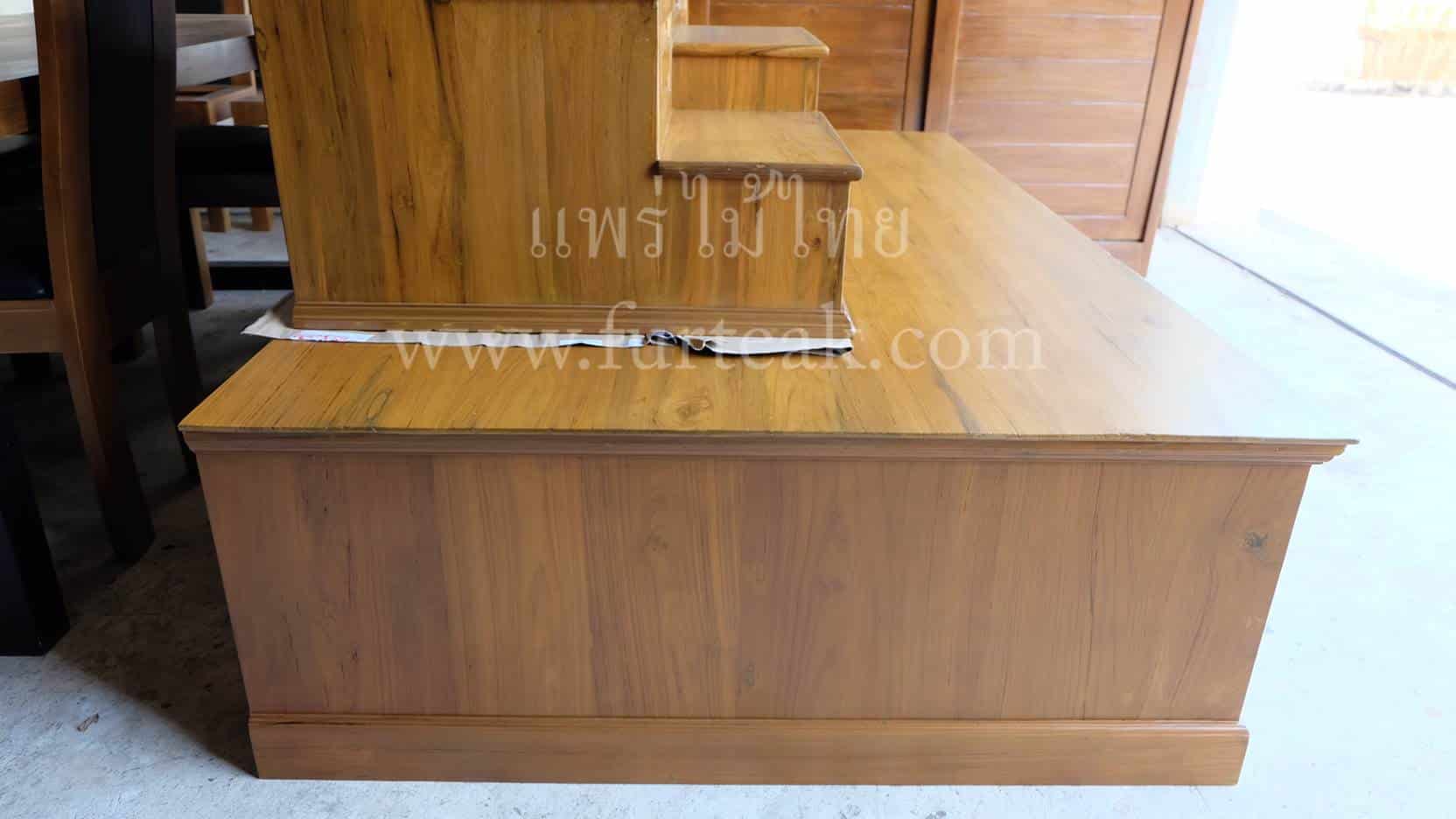 โต๊ะหมู่บูชาโมเดิร์นเรียบ ตรงฐานประกอบไปด้วย 3 ลิ้นชัก (ลิ้นชักกลางใหญ่) เป็นไม้สักทองอบแห้งสีสักทอง (ถอดประกอบได้ ฐานล่าง 1 ตัวและท่อนบน 1ตัว ) ซึ่งคุณสมบัติของไม้เป็นไม้เนื้อแข็งอายุตั้งแต่ 30-50 ปีขึ้นไป เราเลือกใช้ไม้สักที่มีคุณภาพและใช้กระบวนการอบไม้ จึงทำให้ไม้มีการคงสภาพ ความชื้นน้อย และ โอกาสไม้หดตัวน้อยมาก