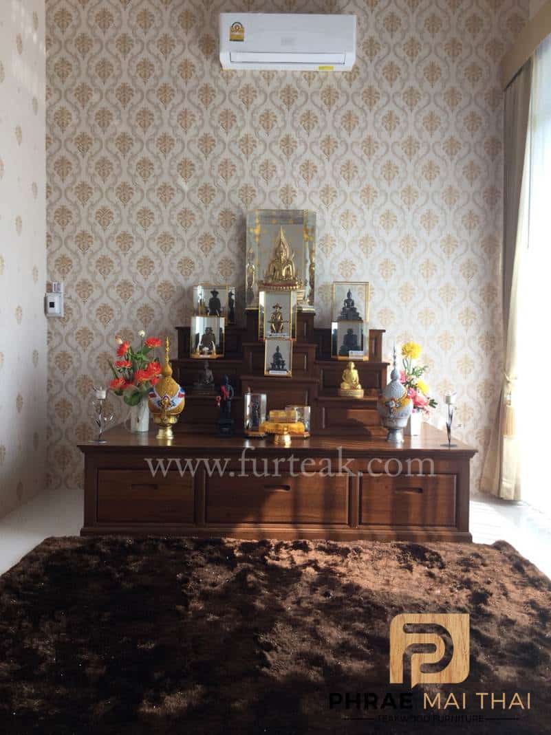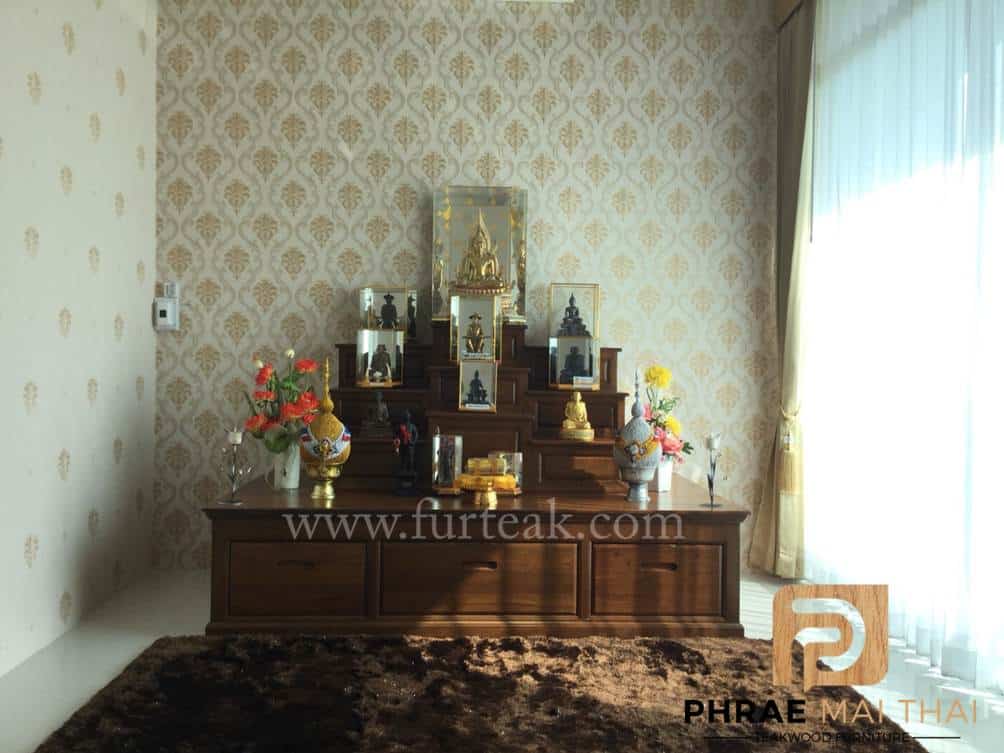 - วิธีการจัดตั้งที่บูชาในห้องพระ การจัดโต๊ะหมู่บูชาแบบโมเดิร์นกล่องทึบ การจัดแบบนี้จะขึ้นอยู่กับความชอบของเจ้าบ้าน แต่ส่วนใหญ่จะเน้นให้มีลักษณะเป็นชั้นๆ เรียงลำดับกันลงมา เพราะสามารถวางพระพุทธรูปได้เยอะกว่าโต๊ะหมู่บูชาขาลอยแบบทั่วๆไป อีกทั้งยังทำความสะอาดได้ง่ายอีกด้วย
