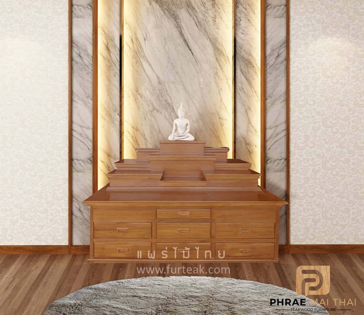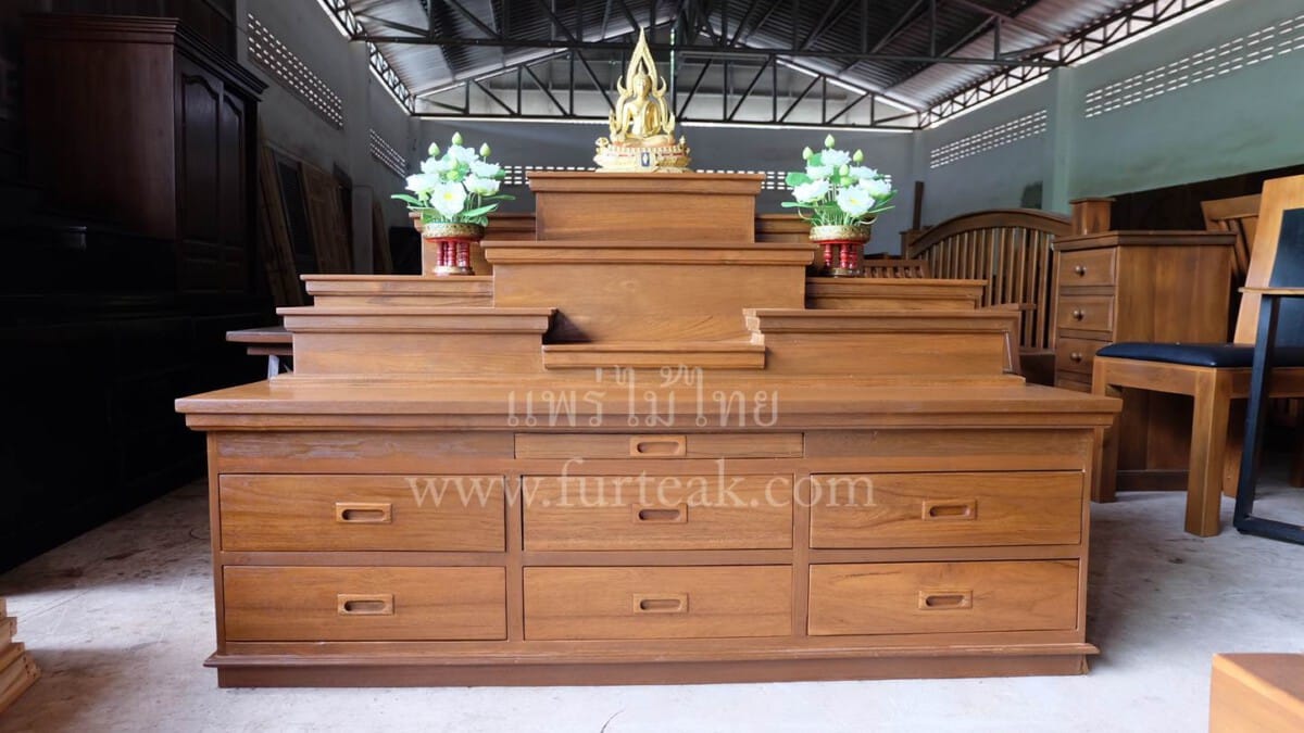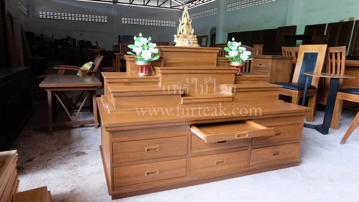 โต๊ะหมู่บูชาโมเดิร์นเรียบ ฐานล่างประกอบไปด้วย 6 ลิ้นชักเท่ากัน และอีก 1 ลิ้นชักใช้ใส่ของไหว้ถวายพระ เป็นไม้สักทองอบแห้งทั้งหมด สีสักทอง (ถอดประกอบได้) ซึ่งคุณสมบัติของไม้เป็นไม้เนื้อแข็งอายุตั้งแต่ 30-50 ปีขึ้นไป เราเลือกใช้ไม้สักที่มีคุณภาพและใช้กระบวนการอบไม้ จึงทำให้ไม้มีการคงสภาพ ความชื้นน้อย โอกาสไม้หด หรือ แตกงอน้อยมาก