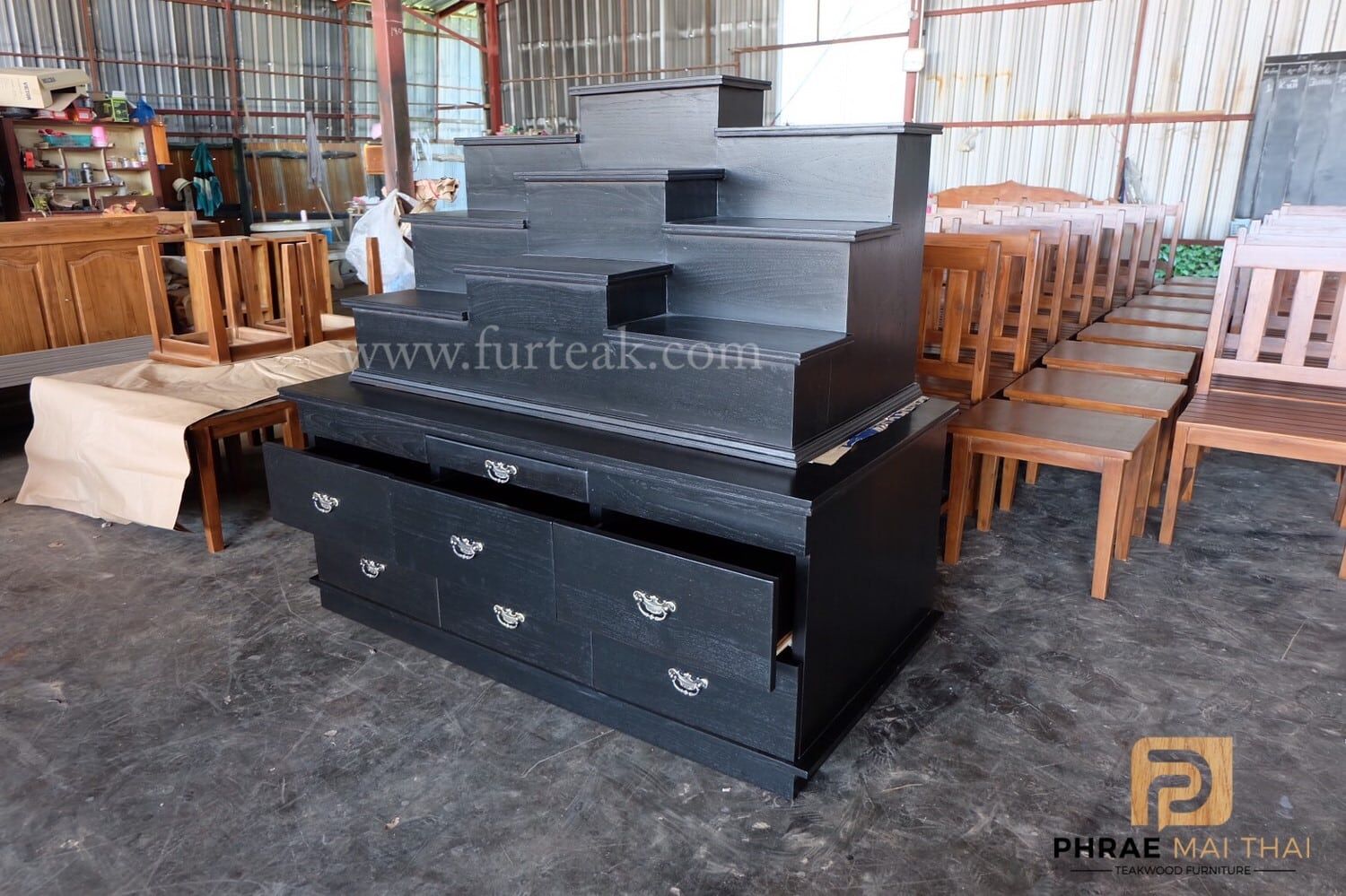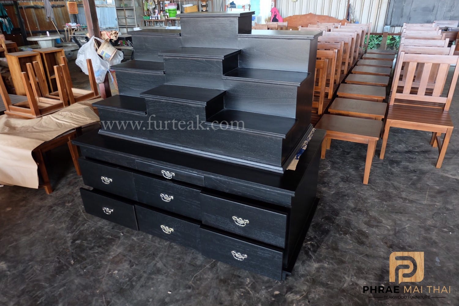 โต๊ะหมู่บูชา Modern ฐานล่างประกอบไปด้วย 6 ลิ้นชักเท่ากัน และ 1 ลิ้นชักวางของถวายพระ เป็นไม้สักทองอบแห้งทั้งหมด สีโอ๊คดำ (ถอดประกอบได้) เหมาะสำหรับบ้านที่ตกแต่ง Style modern ซึ่งคุณสมบัติของไม้เป็นไม้เนื้อแข็งอายุตั้งแต่ 30-50 ปีขึ้นไป เราเลือกใช้ไม้สักที่มีคุณภาพและใช้กระบวนการอบไม้ จึงทำให้ไม้มีการคงสภาพ ความชื้นน้อย และโอกาสไม้หดตัวน้อยมาก