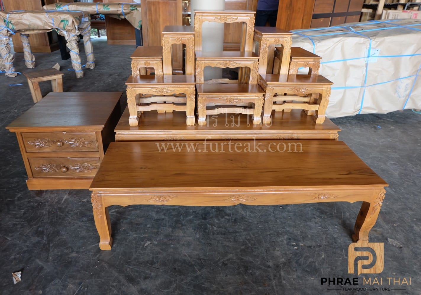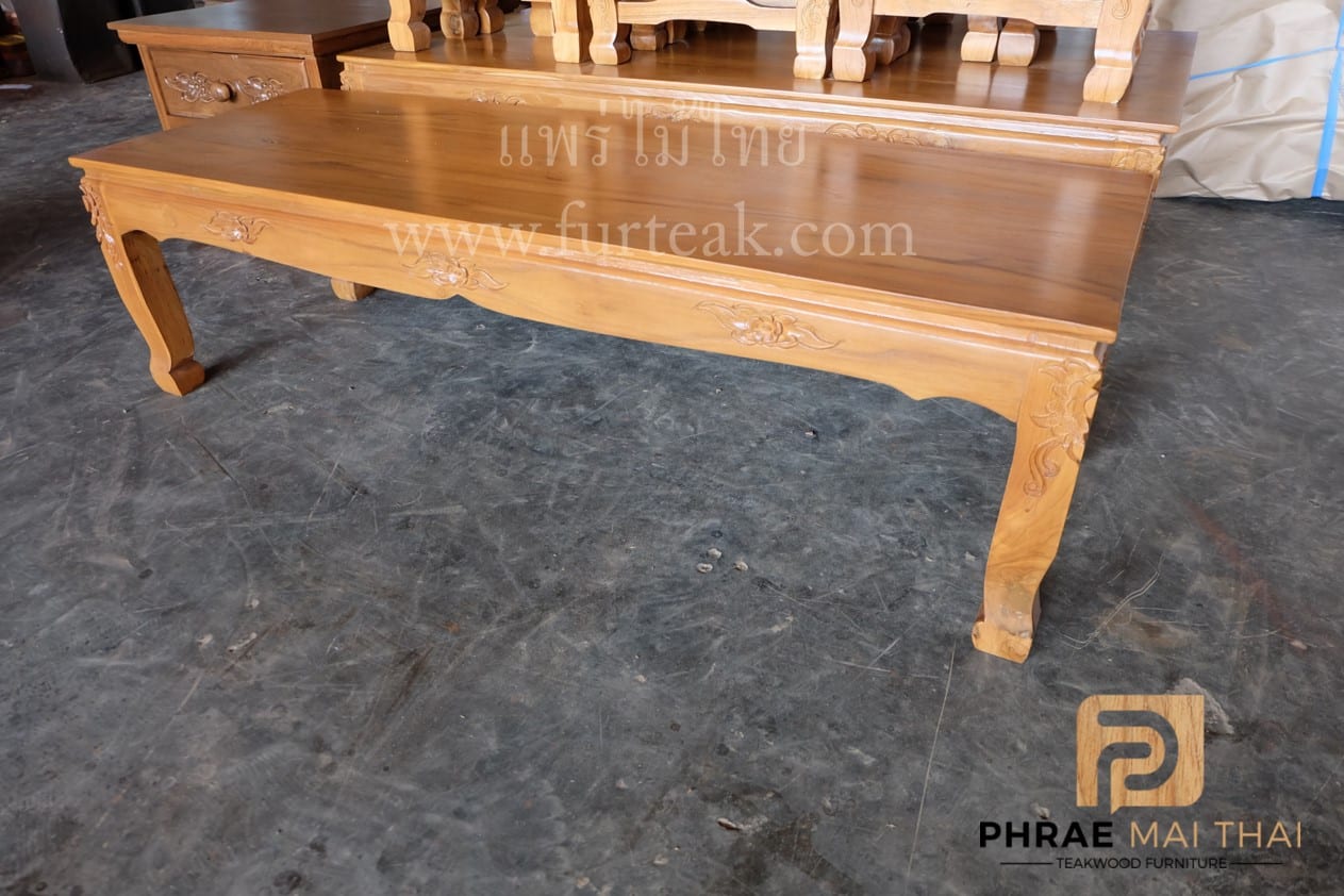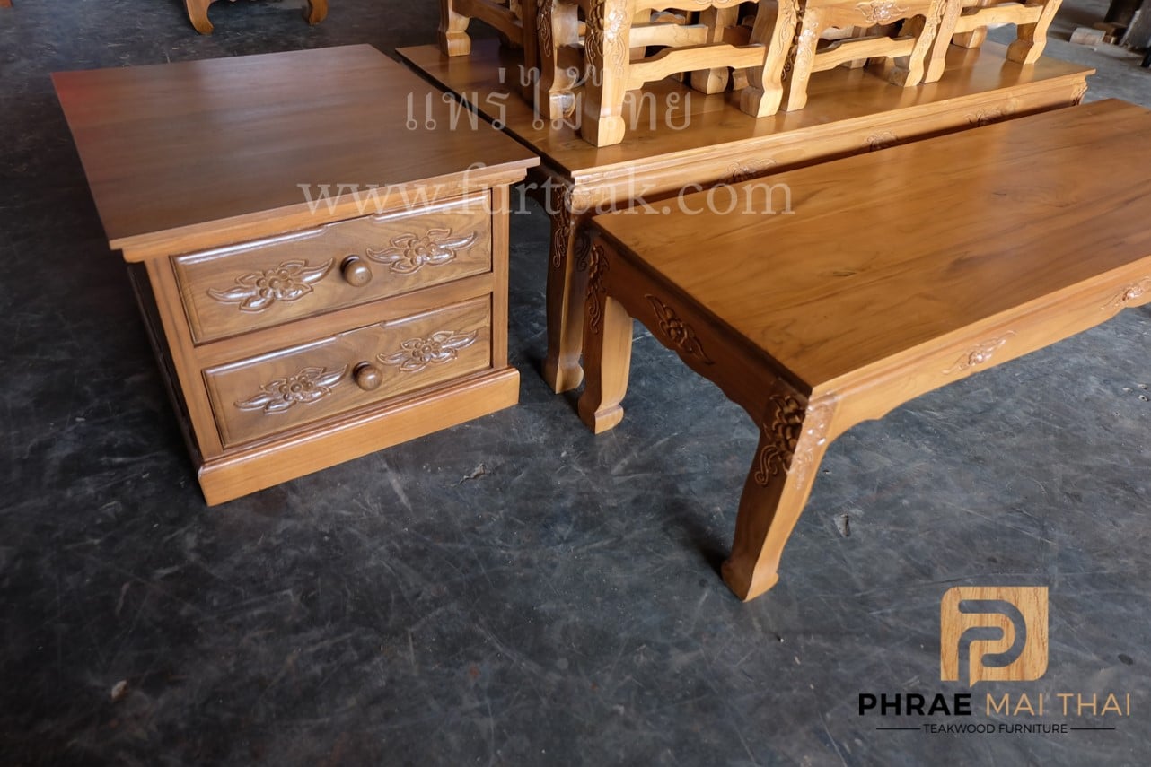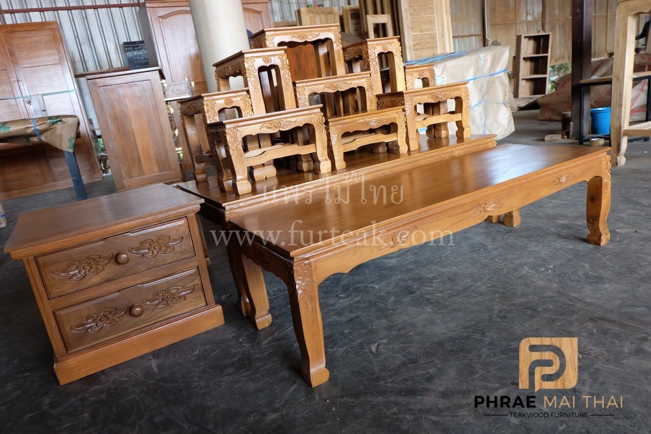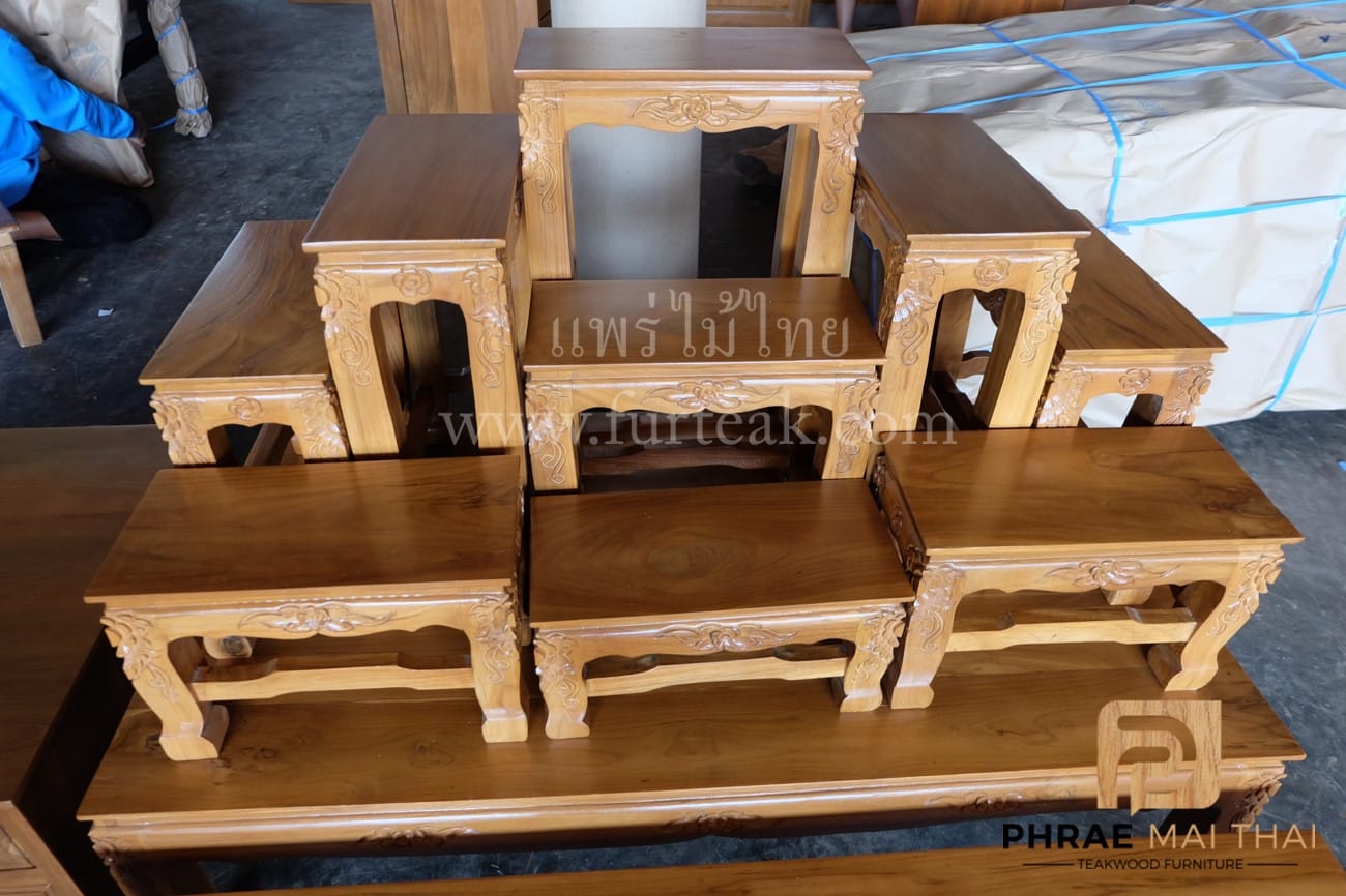ชุดโต๊ะหมู่บูชาไม้สัก หมู่ 9*7 นิ้ว แบบแกะสลัก ประกอบด้วย ตู้ 2 ลิ้นชัก 1 ตัว และโต๊ะวางของแกะสลัก 1 ตัว เป็นไม้สักทองอบแห้งประกอบไปด้วยโต๊ะหมู่ 9 ตัวขาสิงห์ สีสักทอง