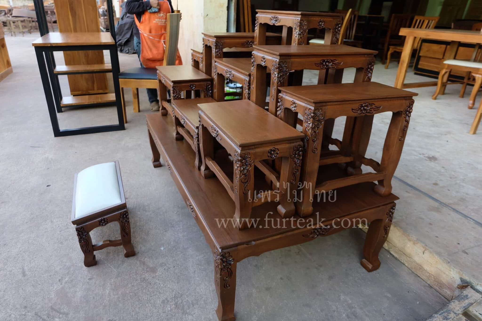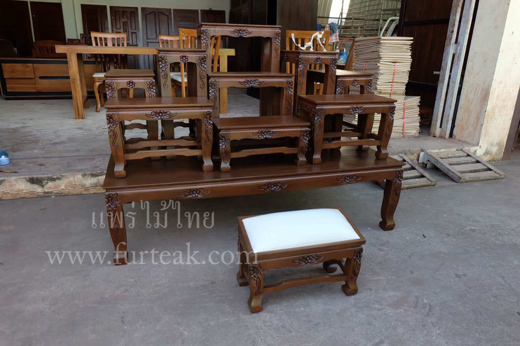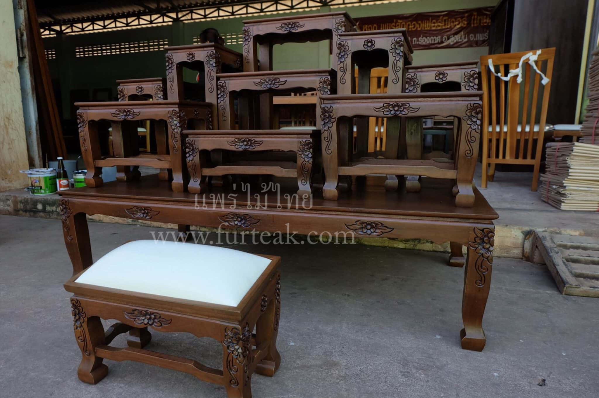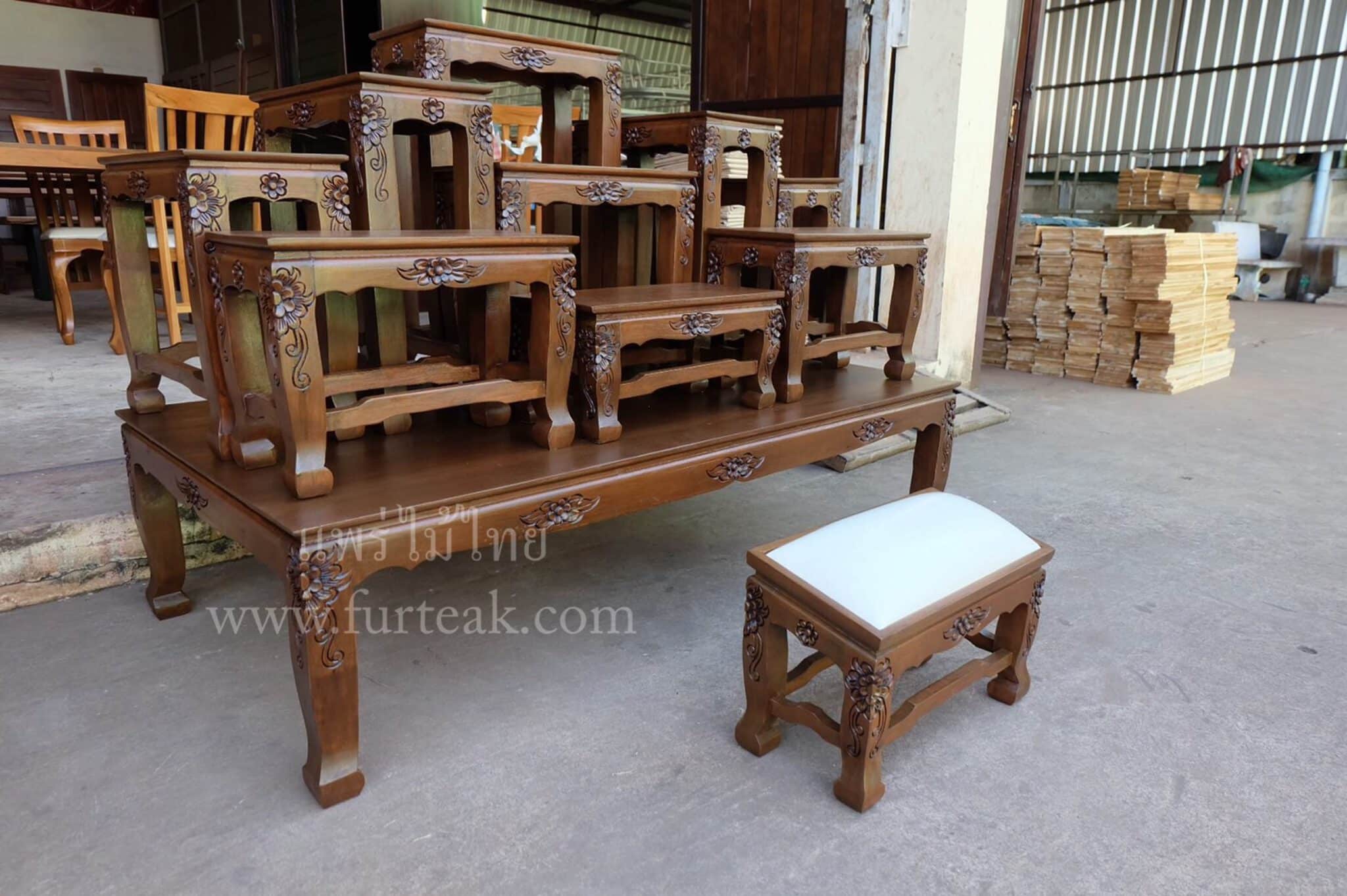 ชุด SET โต๊ะหมู่บูชา หน้า 9″ * 9″ นิ้วแกะลายไทยพร้อมโต๊ะกราบเบาะสีครีม เป็นไม้สักทองอบแห้ง ประกอบไปด้วยโต๊ะหมู่ 9ตัว ซึ่งคุณสมบัติของไม้เป็นไม้เนื้อแข็งอายุตั้งแต่ 30 ปีขึ้นไป เราเลือกใช้ไม้สักที่มีคุณภาพและใช้กระบวนการอบไม้ จึงทำให้ไม้มีการคงสภาพ ความชื้นน้อย และ โอกาสไม้หดตัวน้อยมาก