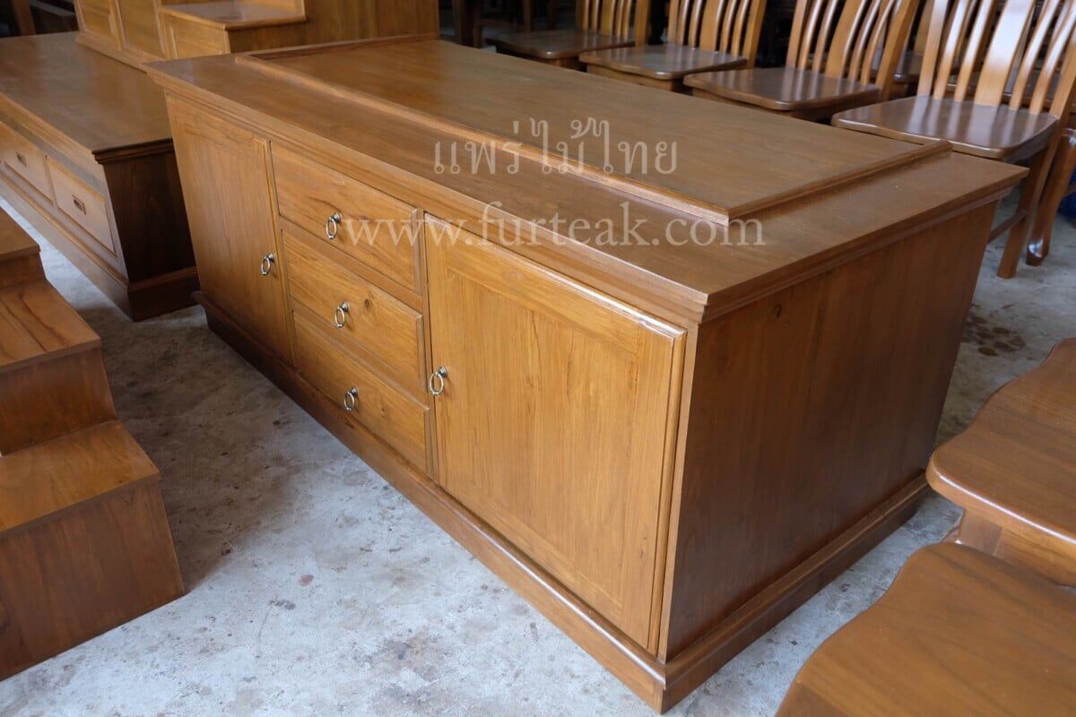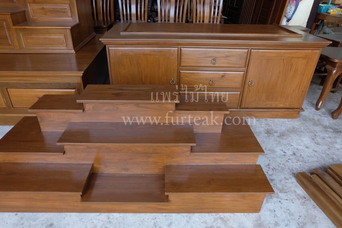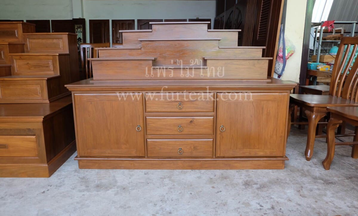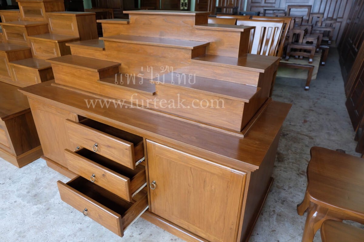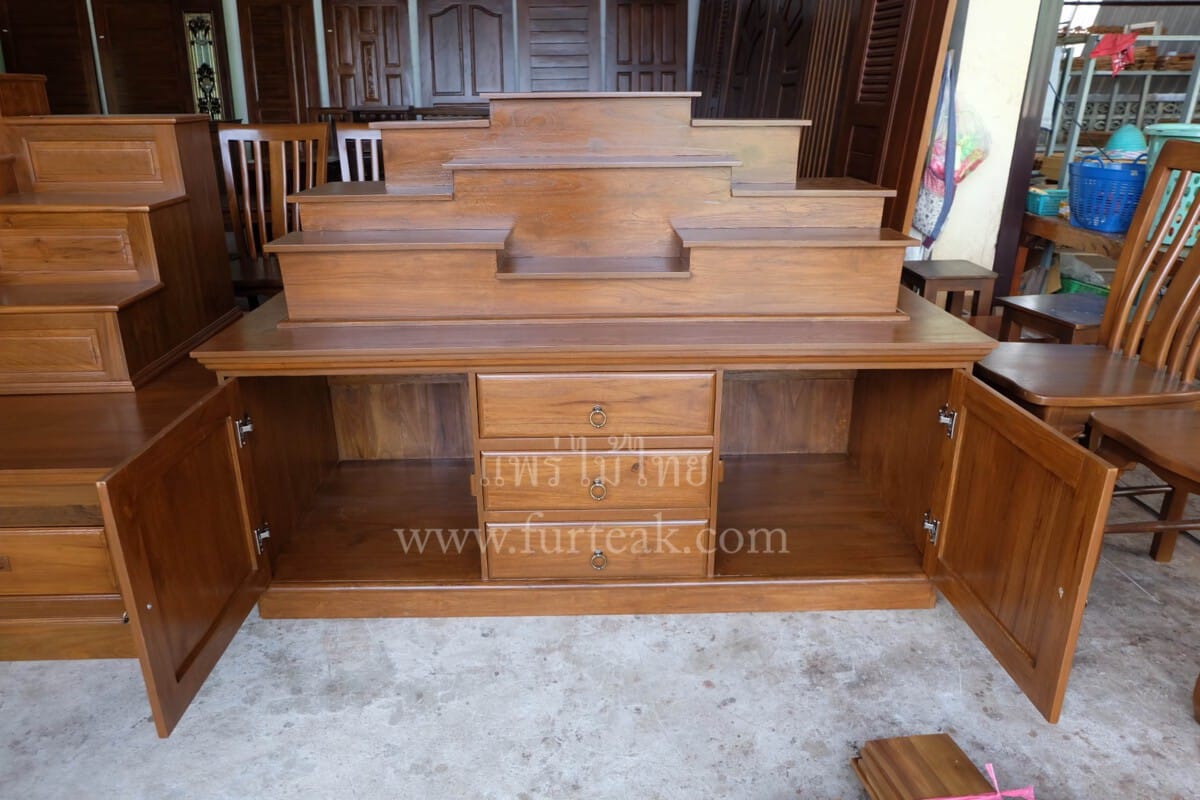 โต๊ะหมู่บูชาโมเดิร์นเรียบ มีบัวล๊อคตรงฐานประกอบไปด้วย 3 ลิ้นชัก 2 บานเปิด-ปิด เป็นไม้สักทองอบแห้งสีสักเข้ม (ถอดประกอบได้) ซึ่งคุณสมบัติของไม้เป็นไม้เนื้อแข็งอายุตั้งแต่ 30 ปีขึ้นไป เราเลือกใช้ไม้สักที่มีคุณภาพและใช้กระบวนการอบไม้ จึงทำให้ไม้มีการคงสภาพ ความชื้นน้อย โอกาสไม้หด หรือ แตกงอน้อยมาก