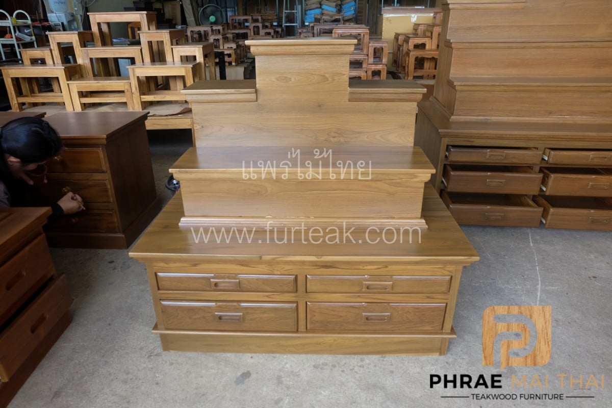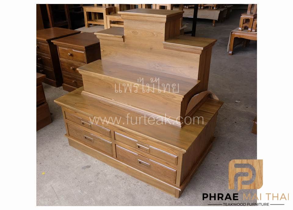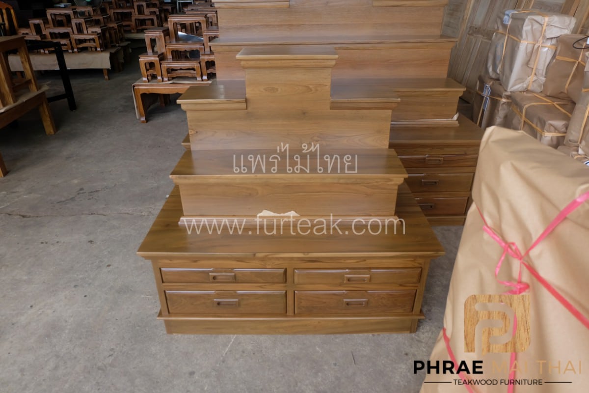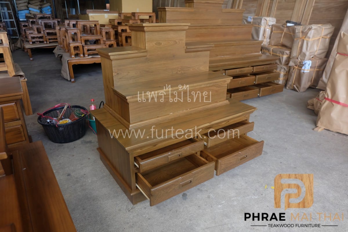 โต๊ะหมู่บูชาโมเดิร์น 2 ลิ้นชักใส่ของ และ 2 ถาดไหว้ ทุกแท่น ลึก 9 นิ้ว แท่นพระประธาน กว้าง 9 นิ้ว*ยาว 35 ซม. ขนาดเล็กแต่วางพระได้หลายองค์ หรือเป็นแท่นวางเทพต่างๆได้เช่นกัน เป็นไม้สักทองอบแห้งสีสักทอง (ถอดประกอบได้ ฐานล่าง 1 ตัวและท่อนบน 1ตัว ) ซึ่งเหมาะสำหรับท่านที่กำลังมองหาที่วางพระขนาดใหญ่แต่มีพื้นที่จำกัด
