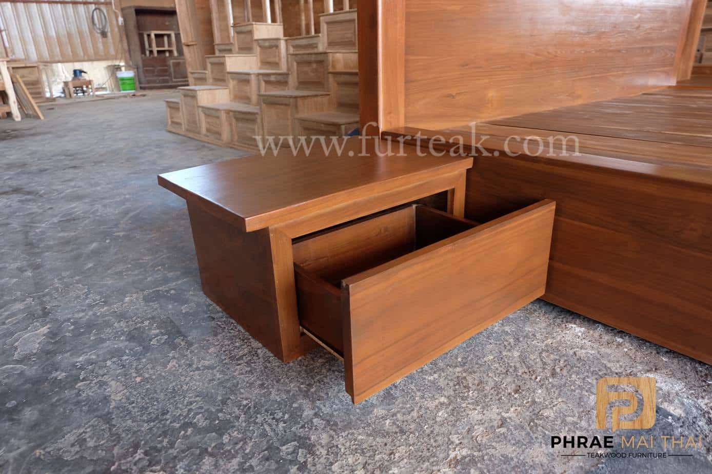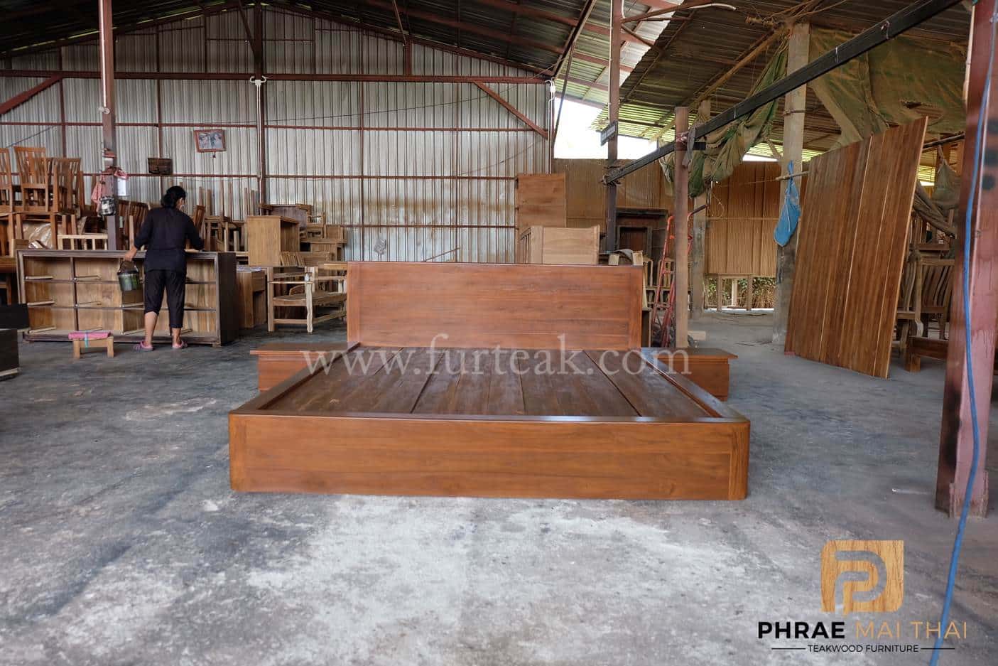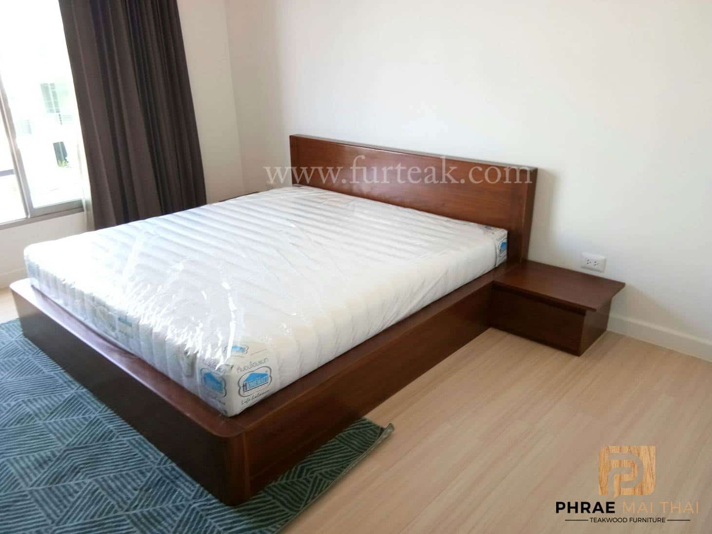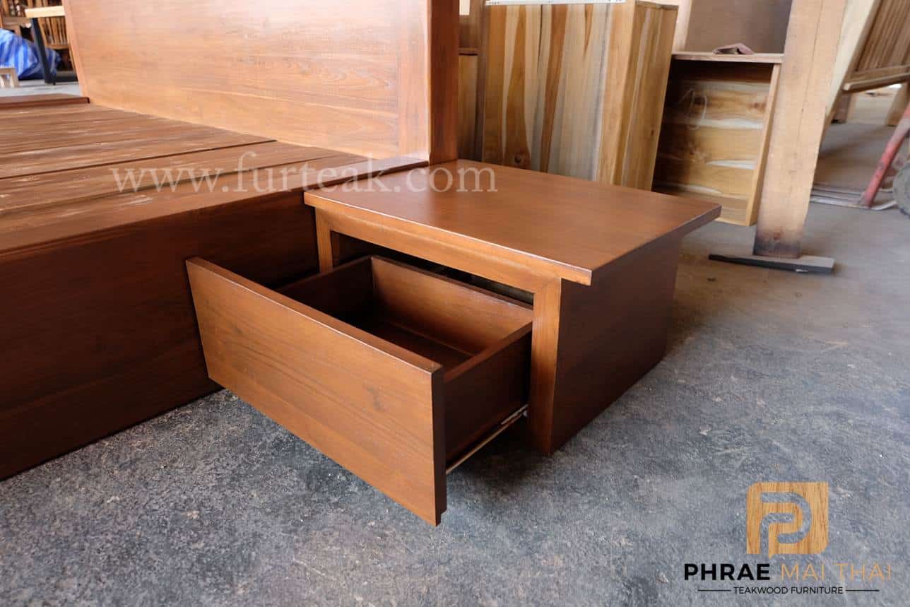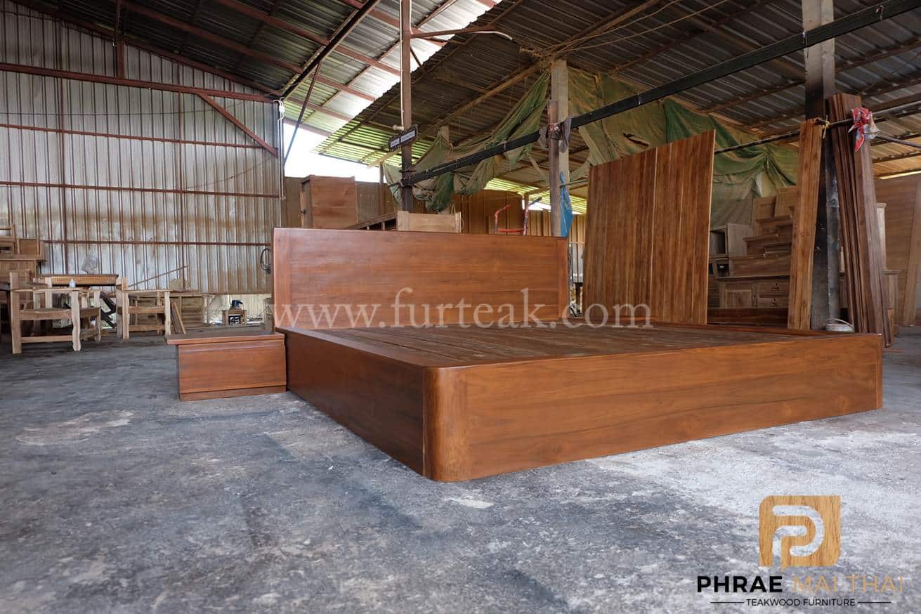 เตียงโมเดิร์น (ทึบล่างลบมุมท้ายเตียงแบบมน ) สีสักเข้ม หัวเตียงสูง 85 ซม. ขอบหนา 3.5 นิ้ว ท้ายเตียงสูง 30 ซม. เพิ่มตู้หัวเตียง มี 1 ลิ้นชักมือจับดึงในตัว จำนวน 2 หลัง ซึ่งคุณสมบัติของไม้เป็นไม้เนื้อแข็งอายุตั้งแต่ 30 ปีขึ้นไป เราเลือกใช้ไม้สักที่มีคุณภาพและใช้กระบวนการอบไม้ จึงทำให้ไม้มีการคงสภาพ ความชื้นน้อย และโอกาสไม้หดตัวน้อยมาก