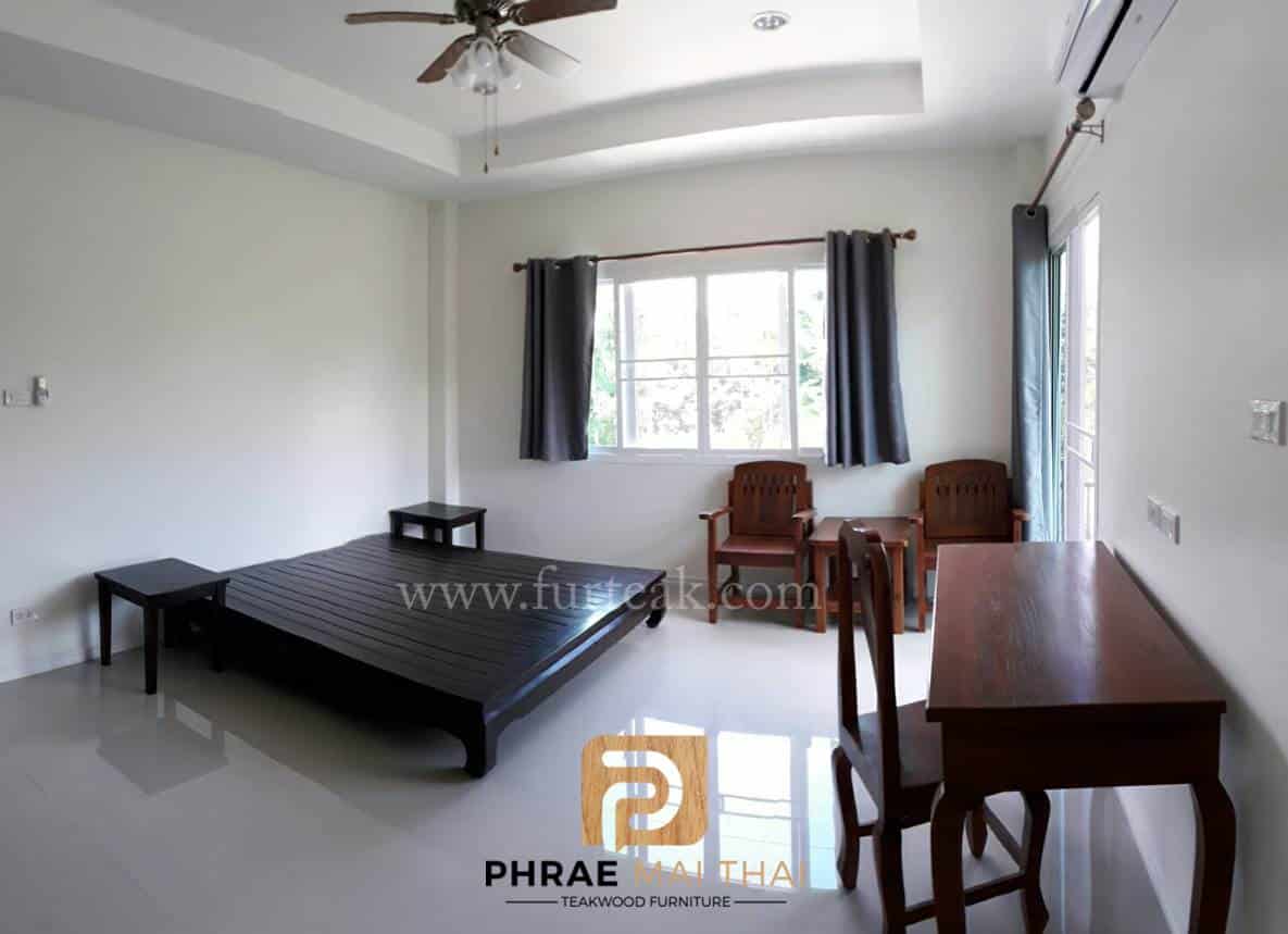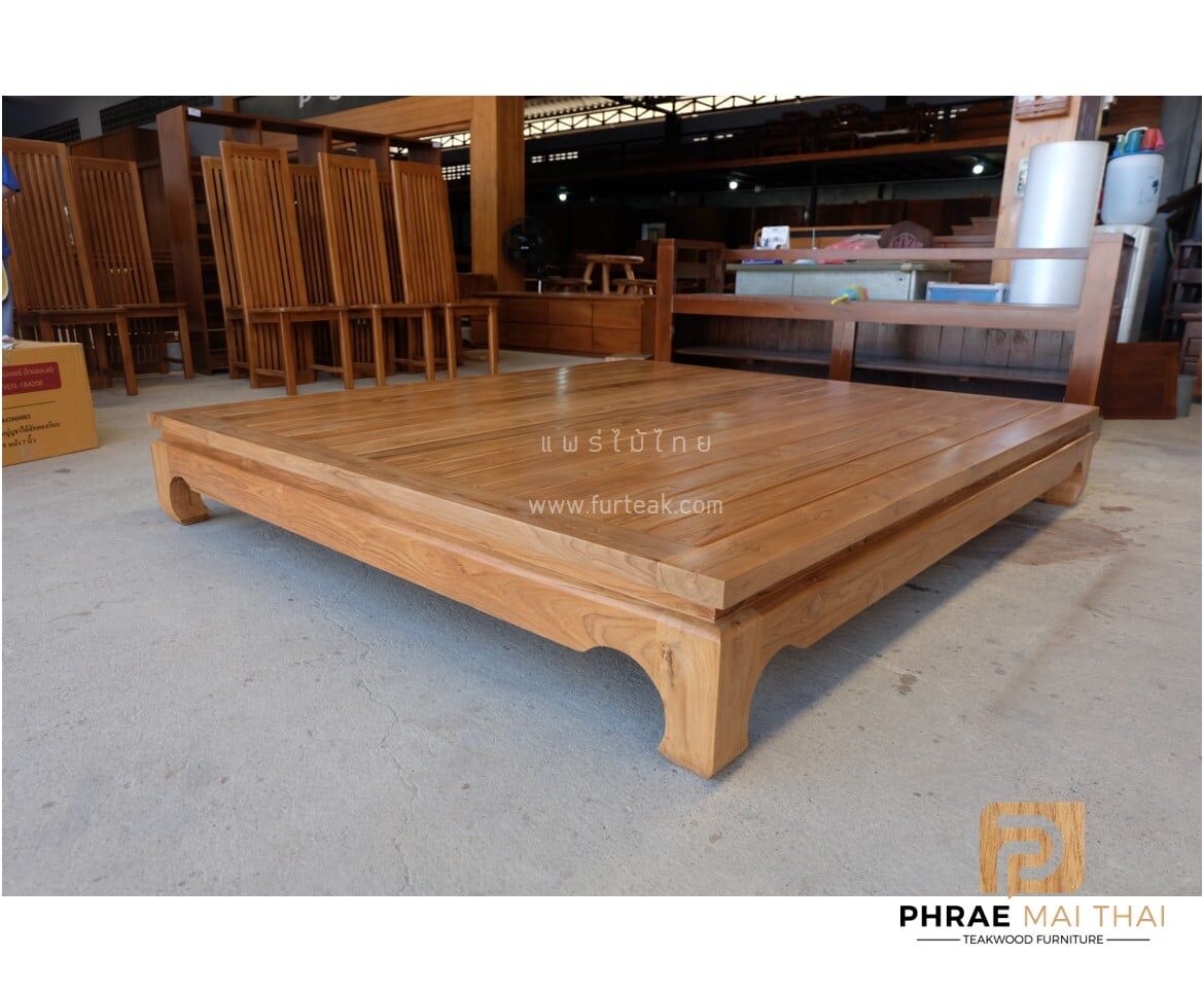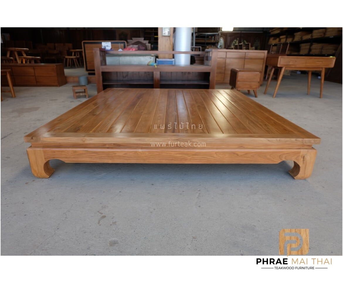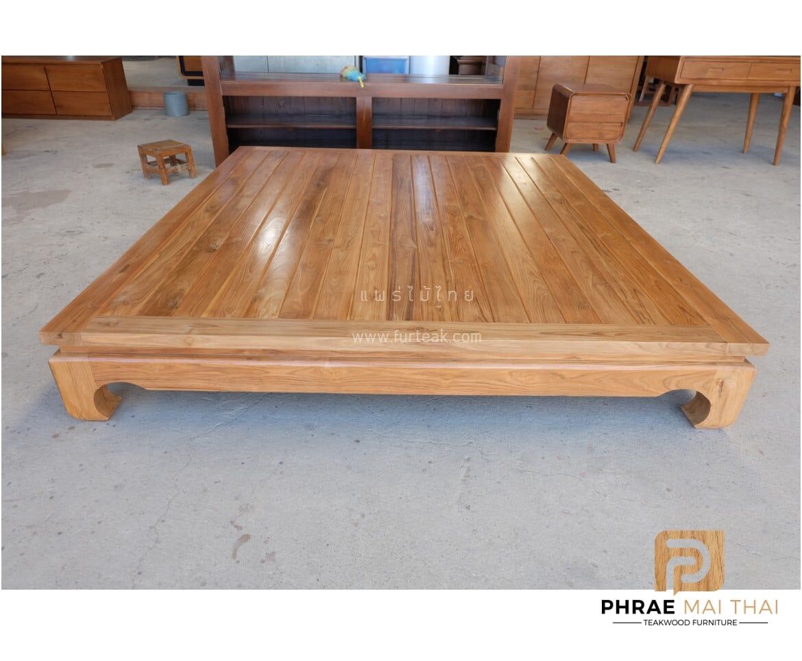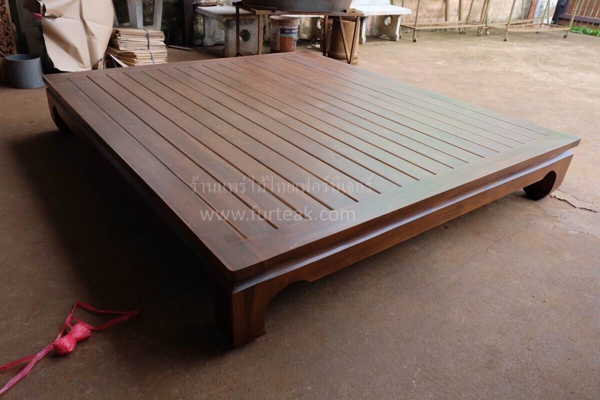 เตียงขาคู้ว ด้านบนเป็นไม้เซาะร่องเป็นไม้สักทองอบแห้ง ขาหนา 4 นิ้ว เหมาะสำหรับวางเบาะทับด้านบน คุณสมบัติของไม้เป็นไม้เนื้อแข็งอายุตั้งแต่ 30 ปีขึ้นไป เราเลือกใช้ไม้สักที่มีคุณภาพและใช้กระบวนการอบไม้จึงทำให้ไม้มีการคงสภาพ ความชื้นน้อย และโอกาสไม้หดตัวน้อยมาก เหมาะสำหรับตกแต่งรีสอร์ท อพาตเม้นท์ และโรงแรม