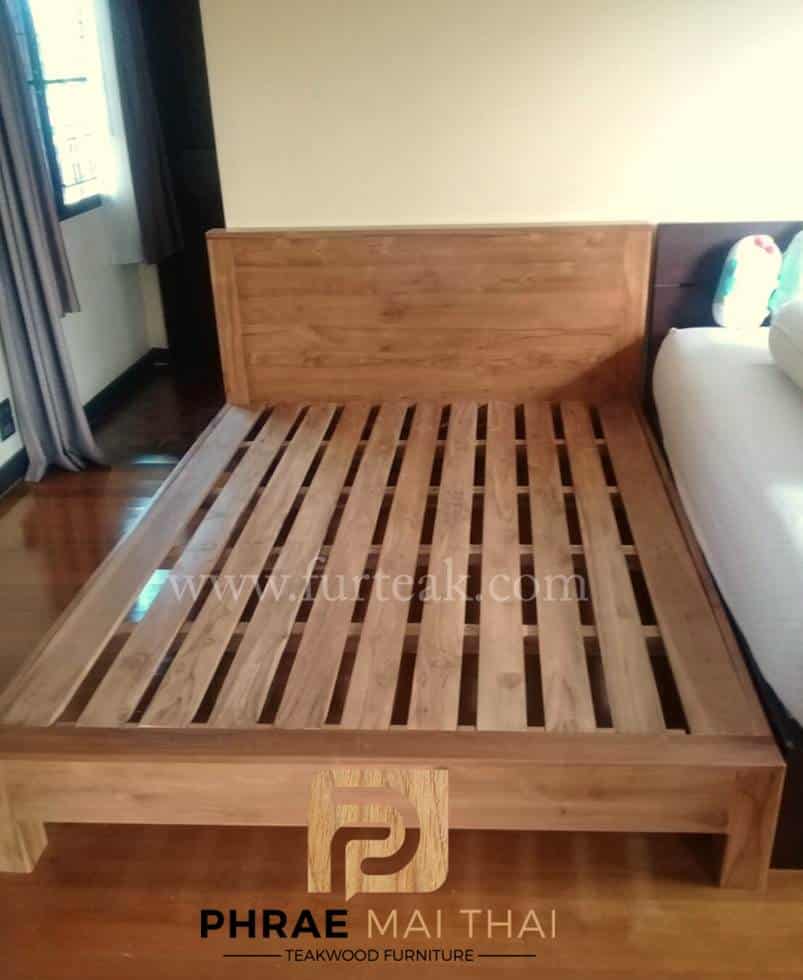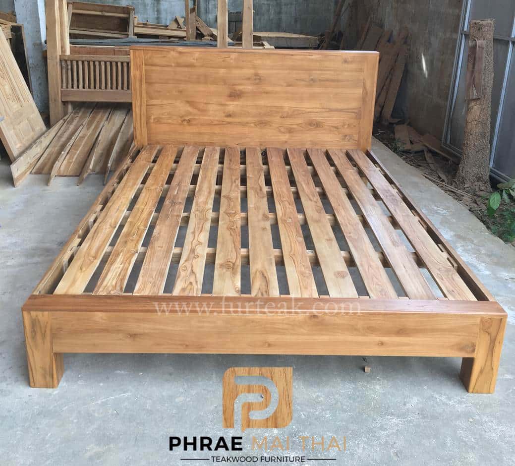 เตียงโมเดิร์น (ขาลอย) สีธรรมชาติ หัวเตียงสูง 90 ซม. ขอบหนา 3.5 นิ้ว ท้ายเตียงสูง 30 ซม. ซึ่งคุณสมบัติของไม้เป็นไม้เนื้อแข็งอายุตั้งแต่ 30 ปีขึ้นไป เราเลือกใช้ไม้สักที่มีคุณภาพและใช้กระบวนการอบไม้ จึงทำให้ไม้มีการคงสภาพ ความชื้นน้อย และโอกาสไม้หดตัวน้อยมาก