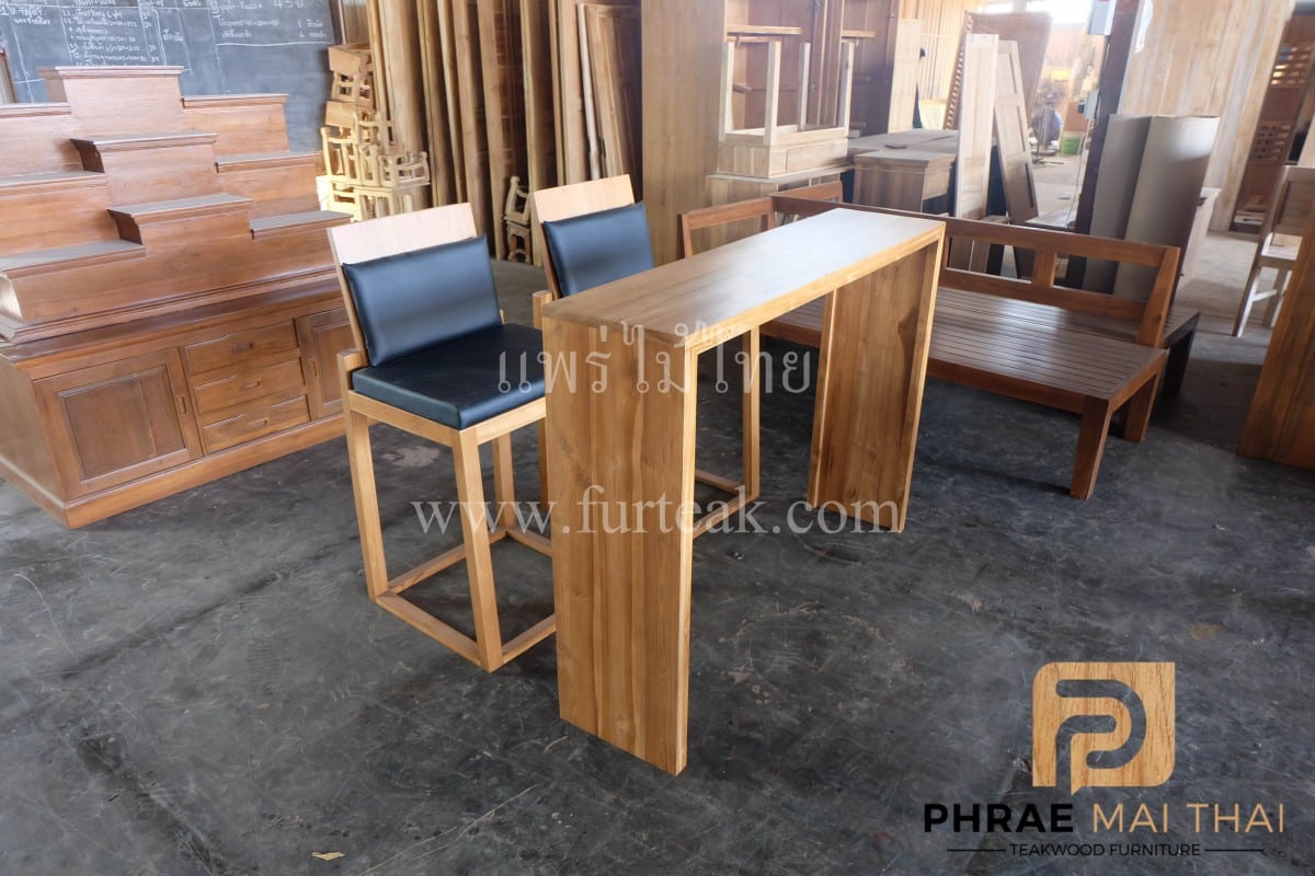 ชุดโต๊ะบาร์โมเดิร์น สีธรรมชาติ ประกอบไปด้วย โต๊ะยาว 150 ซม. ประกอบไปด้วยโต๊ะ 1 ตัว เก้าอี้ 2 ตัว เป็นไม้สักทองอบแห้ง ซึ่งคุณสมบัติของไม้เป็นไม้เนื้อแข็งอายุตั้งแต่ 30 ปีขึ้นไป เราเลือกใช้ไม้สักที่มีคุณภาพและใช้กระบวนการอบไม้ จึงทำให้ไม้มีการคงสภาพ ความชื้นน้อย และโอกาสไม้หดตัวน้อยมาก