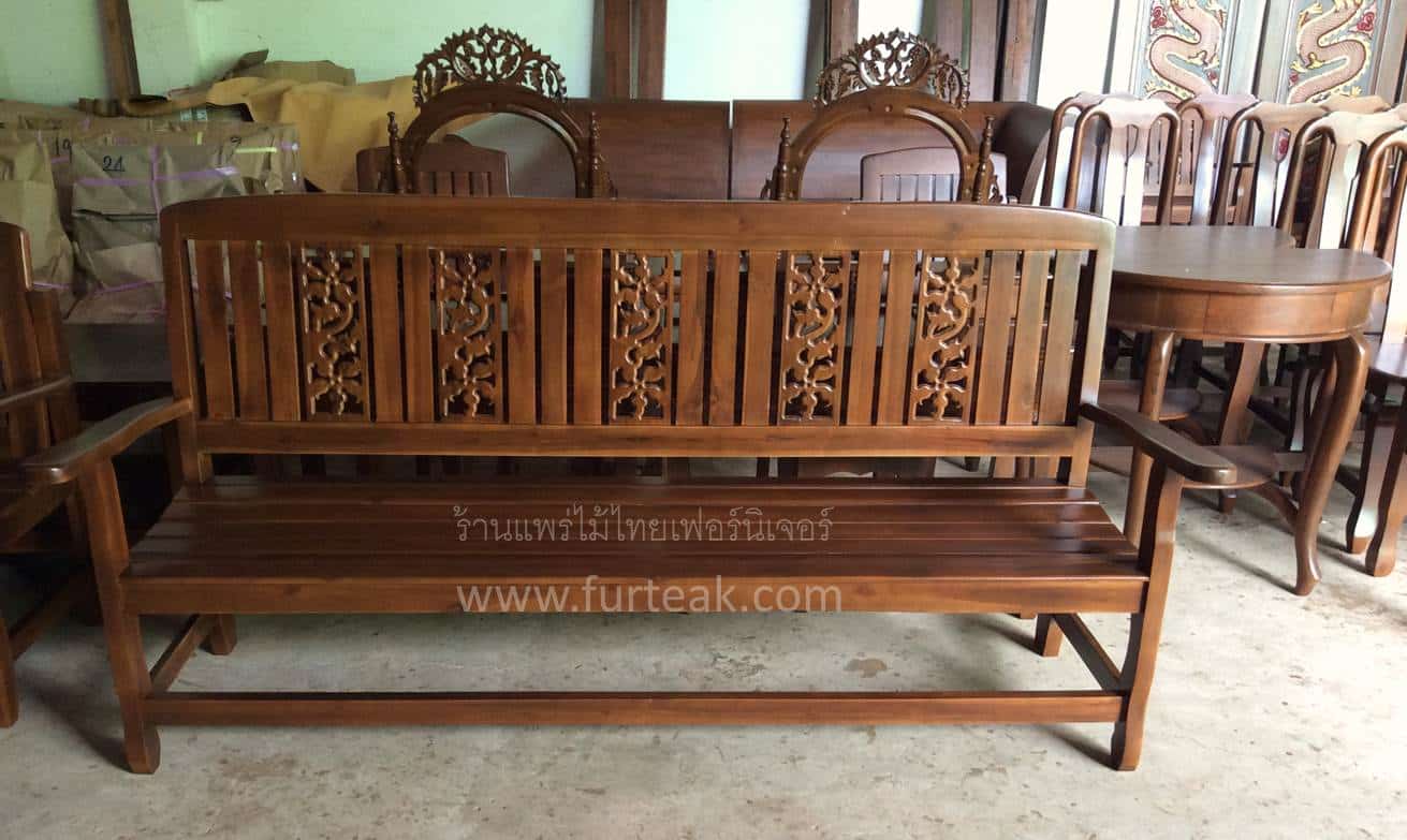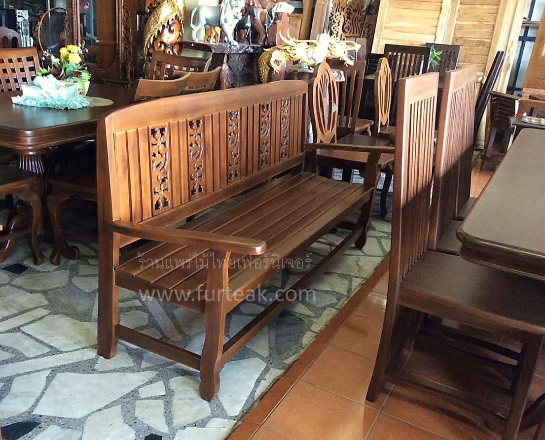 ม้านั่งยาวซี่แกะลายดอกไม้ (พนักพิง) สีสักเข้มเป็นไม้สักทองอบแห้ง