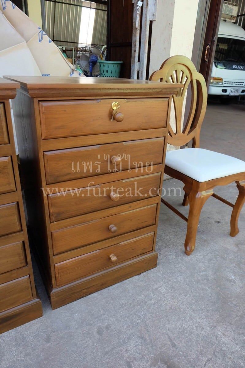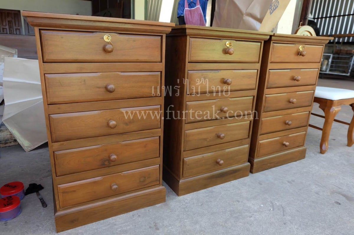 ตู้หัวเตียง/ตู้ลิ้นชักไม้สักเก่า มีกุญแจลิ้นชักด้านบนสุด ประกอบไปด้วย 5 ลิ้นชักสีสักทอง เราเลือกใช้ไม้สักที่มีคุณภาพและใช้กระบวนการอบไม้ จึงทำให้ไม้มีการคงสภาพ ความชื้นน้อย และโอกาสไม้หดตัวน้อยมาก