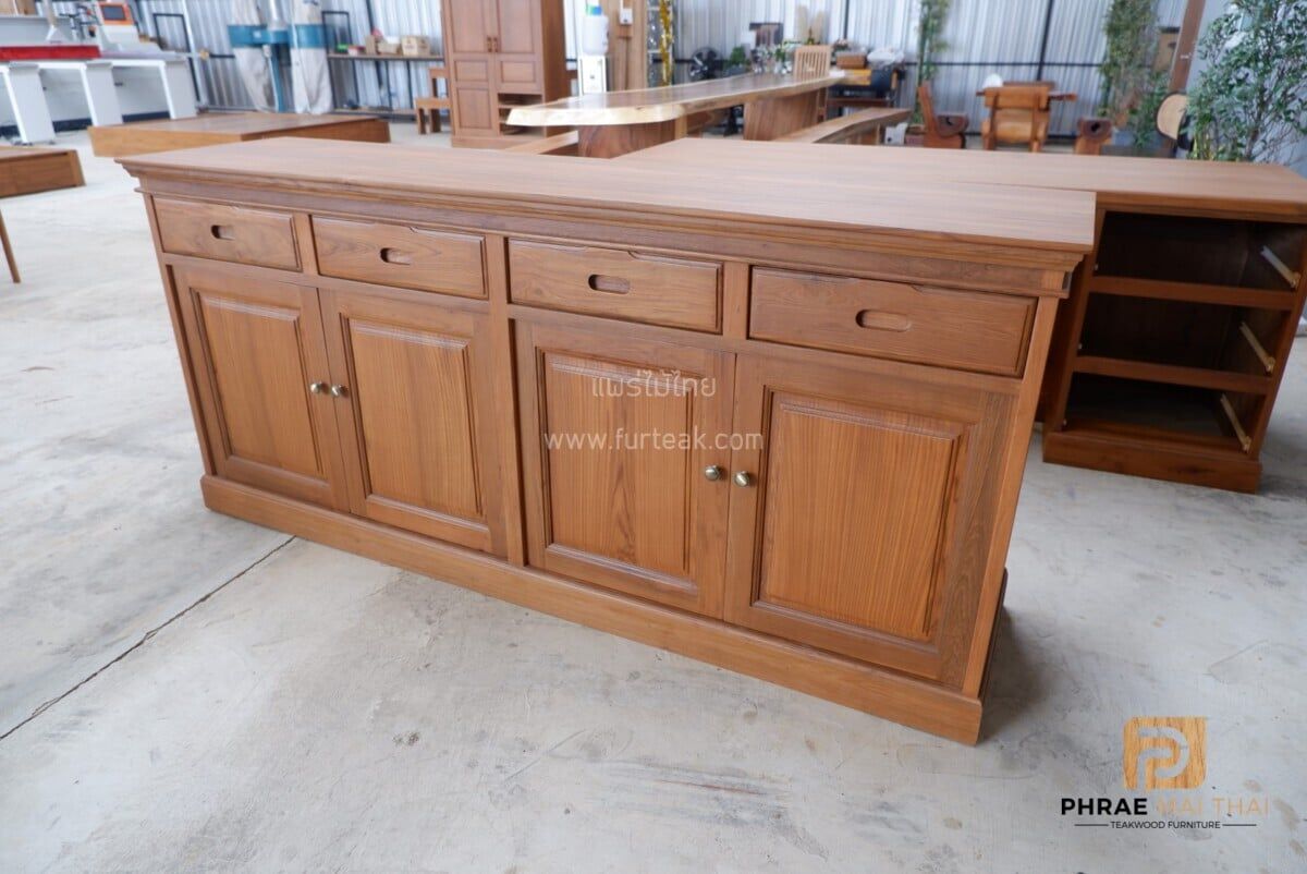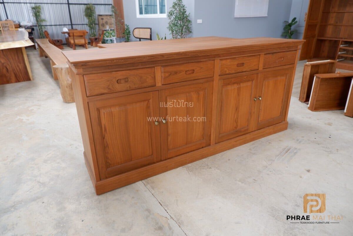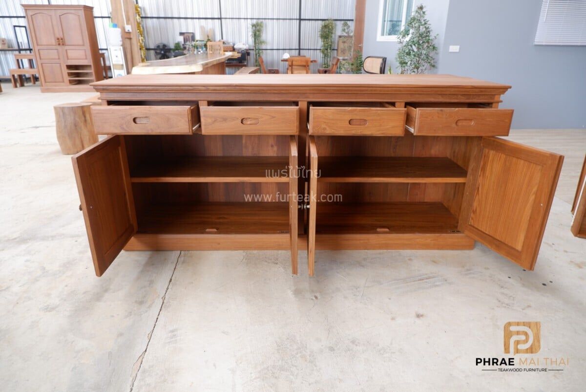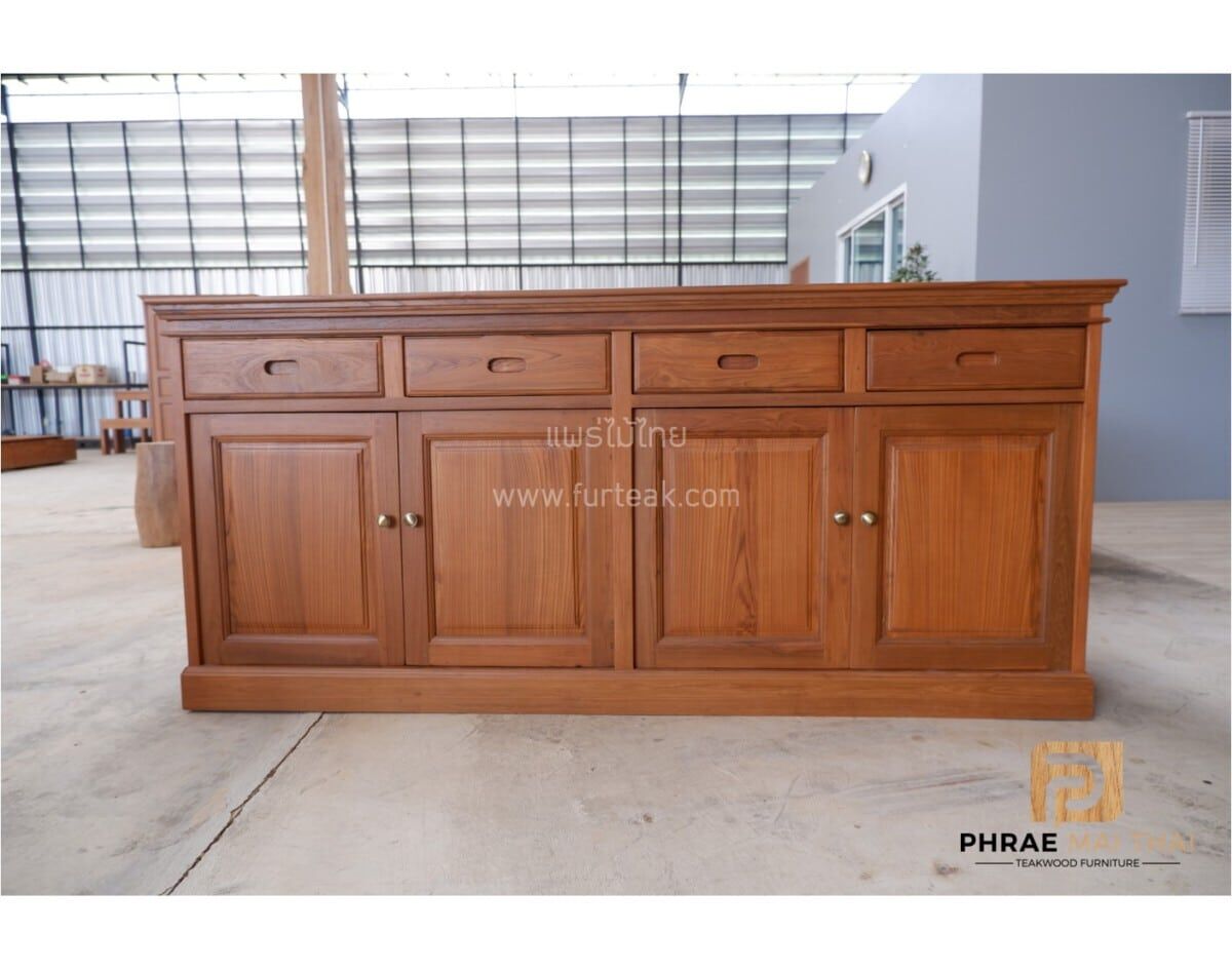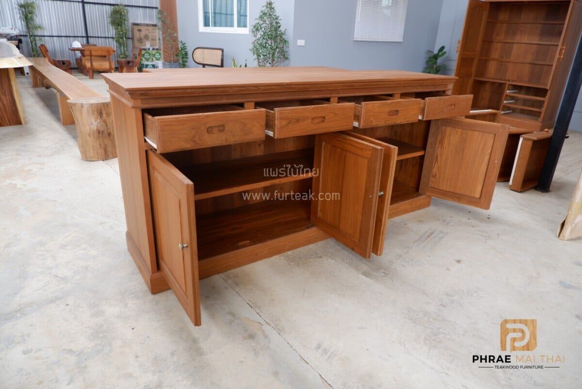 ตู้วางของ/ ตู้อเสนกประสงค์ 4 ลิ้นชัก 4 บานทึบเปิดปิด สีสักเข้มเป็นไม้สักทองอบแห้ง ซึ่งคุณสมบัติของไม้เป็นไม้เนื้อแข็งอายุตั้งแต่ 30 ปีขึ้นไป เราเลือกใช้ไม้สักที่มีคุณภาพและใช้กระบวนการอบไม้ จึงทำให้ไม้มีการคงสภาพ ความชื้นน้อย และโอกาสไม้หดตัวน้อยมาก