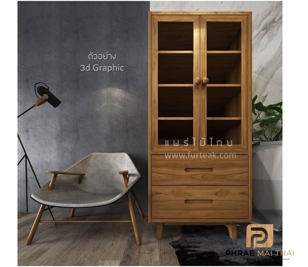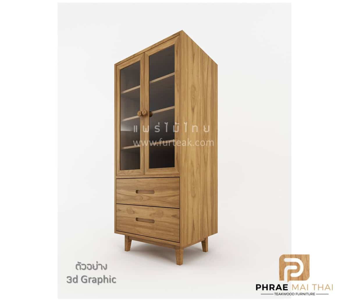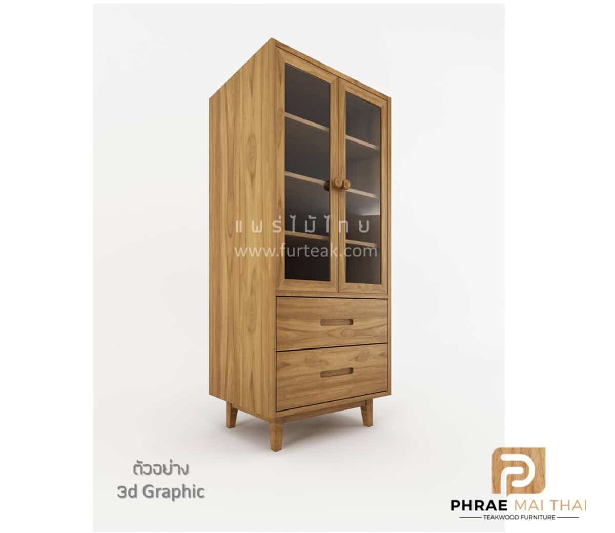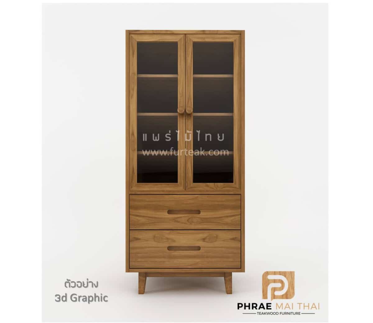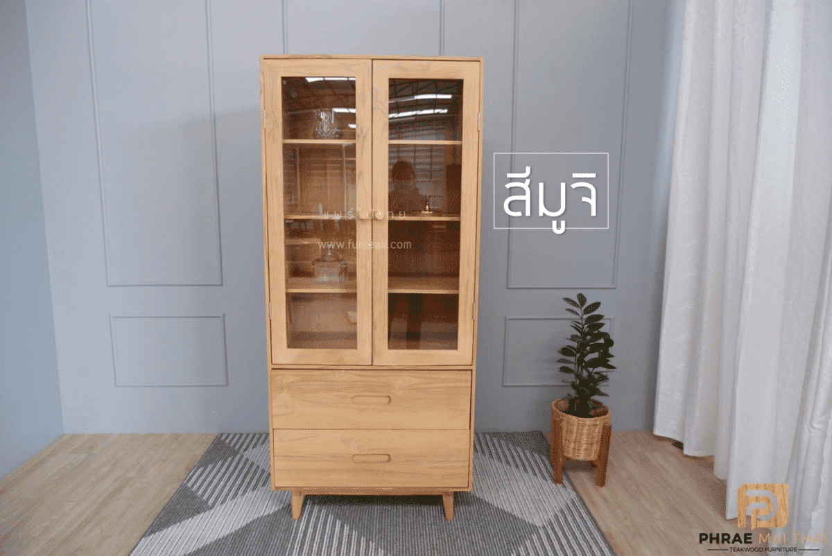 ตู้โชว์ไม้สัก ทรงโมเดิร์น มี 2 ลิ้นชัก ด้านบนบานปิด-เปิด ภายในวางของได้ 4 ชั้น (รวมกระจกแล้ว) สีสักทอง