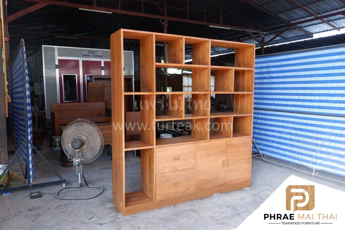 ตู้โชว์ ตู้หนังสือไม้สัก มี 2 ลิ้นชัก พร้อมช่องเก็บของบานปิด-เปิด สีสักทอง