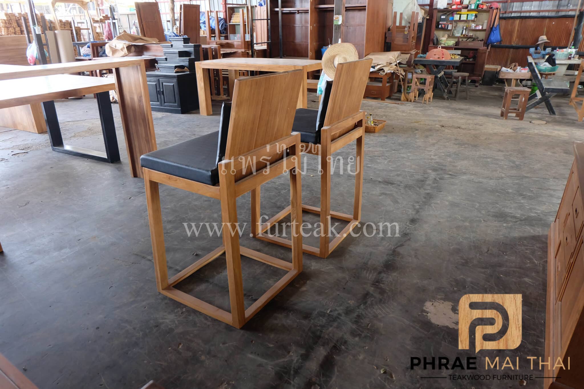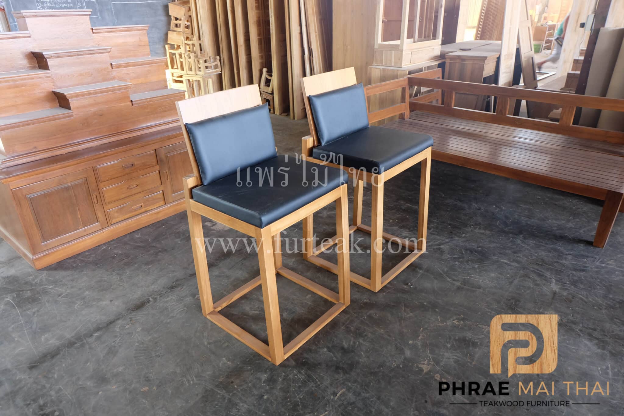 เก้าอี้บาร์โมเดิร์น พร้อมเบาะหนังสีดำมีพนักพิง เป็นไม้สักทองอบแห้ง ซึ่งคุณสมบัติของไม้เป็นไม้เนื้อแข็งอายุตั้งแต่ 30 ปีขึ้นไป เราเลือกใช้ไม้สักที่มีคุณภาพและใช้กระบวนการอบไม้ จึงทำให้ไม้มีการคงสภาพ ความชื้นน้อย และโอกาสไม้หดตัวน้อยมาก