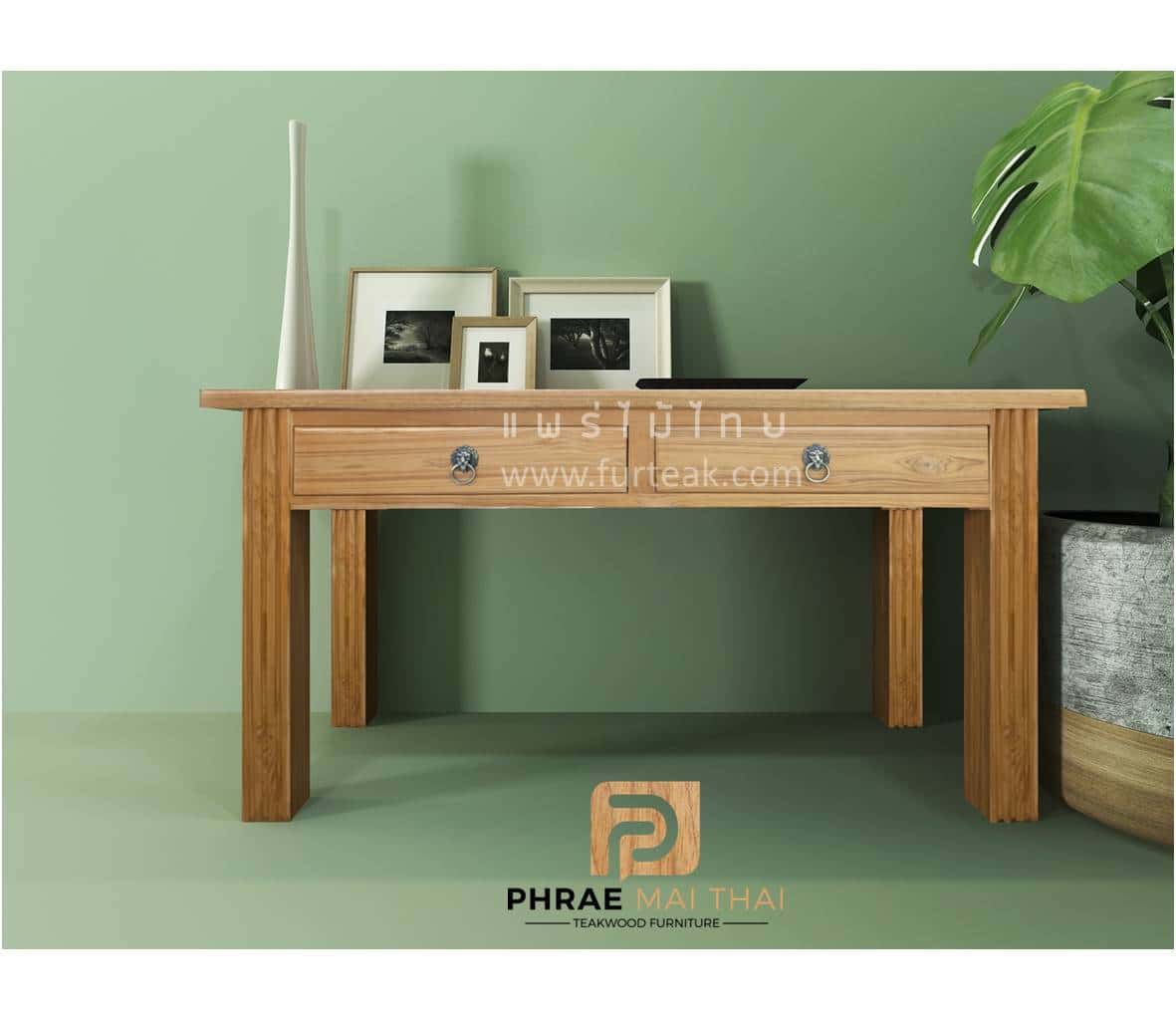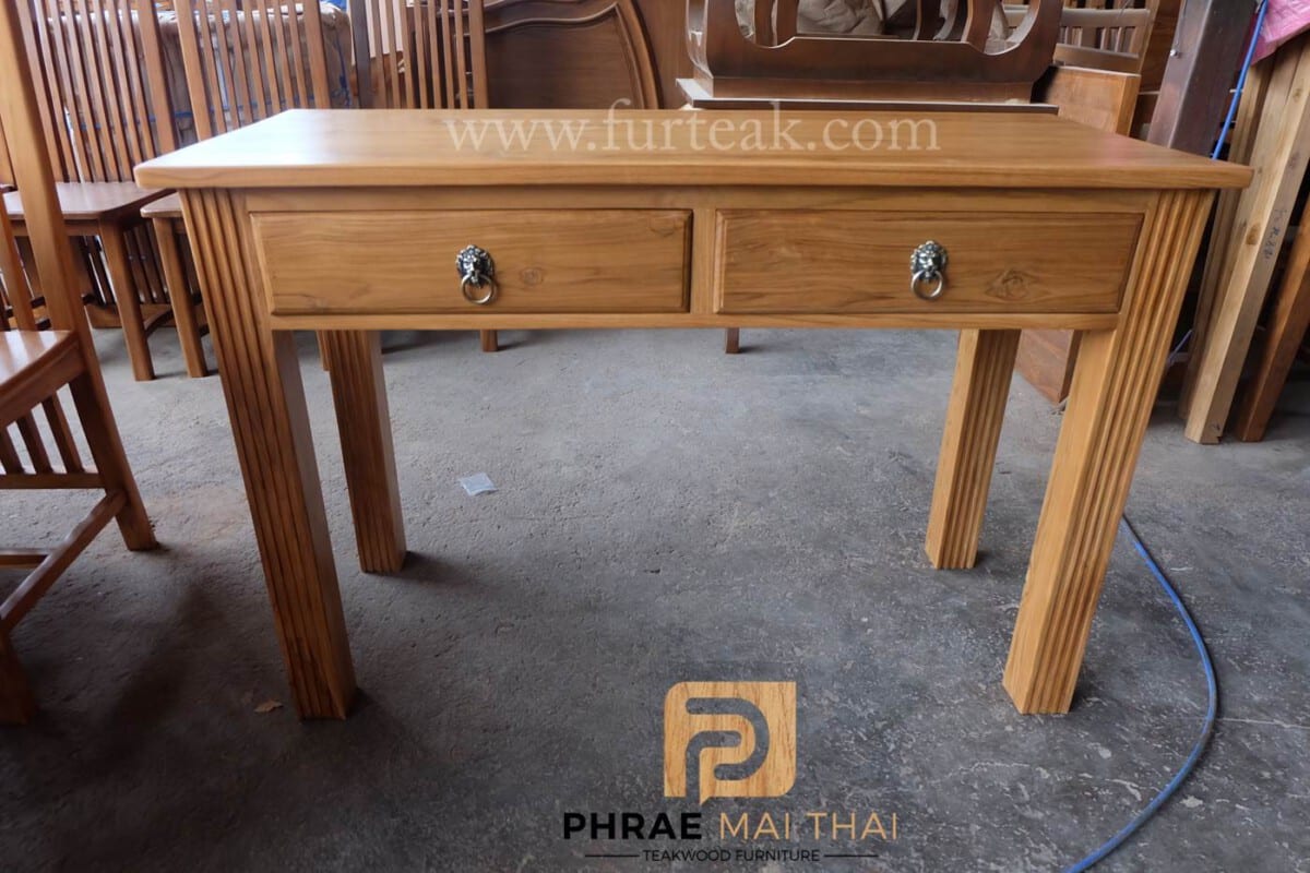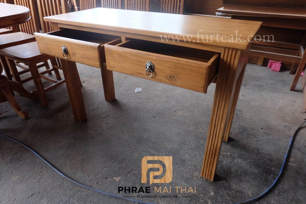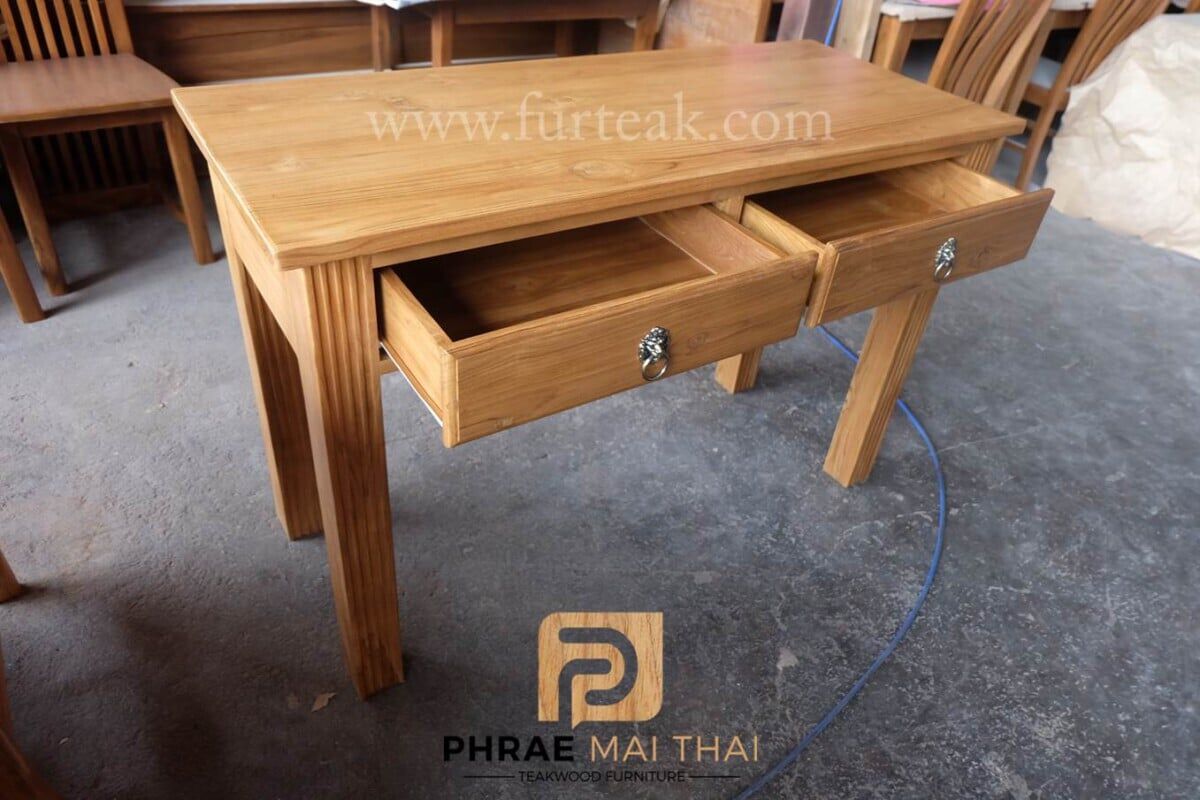 โต๊ะทำงานไม้สัก ประกอบไปด้วย 2 ลิ้นชัก เป็นไม้สักทองทั้งหมด สีธรรมชาติเป็นไม้สักทองอบแห้ง ซึ่งคุณสมบัติของไม้เป็นไม้เนื้อแข็งอายุตั้งแต่ 30 ปีขึ้นไป เราเลือกใช้ไม้สักที่มีคุณภาพและใช้กระบวนการอบไม้ จึงทำให้ไม้มีการคงสภาพ ความชื้นน้อย โอกาสไม้หด หรือ แตกงอน้อยมาก