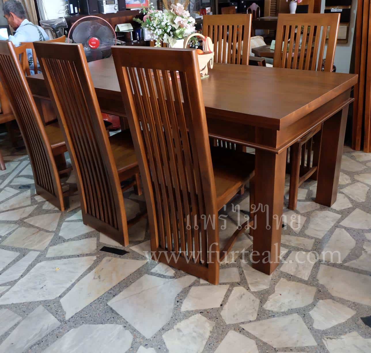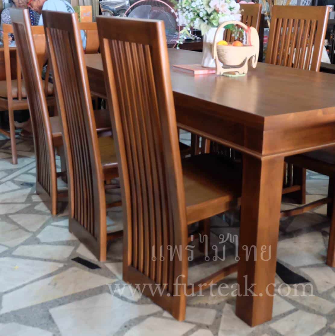 ชุดโต๊ะอาหารโมเดิร์น โต๊ะยาว 2 ม. พร้อมเก้าอี้ซี่ยาว 6 ตัวสีสักเข้ม เป็นไม้สักทองอบแห้ง ซึ่งคุณสมบัติของไม้เป็นไม้เนื้อแข็งอายุตั้งแต่ 30 ปีขึ้นไป เราเลือกใช้ไม้สักที่มีคุณภาพและใช้กระบวนการอบไม้ จึงทำให้ไม้มีการคงสภาพ ความชื้นน้อย และโอกาสไม้หดตัวน้อยมาก