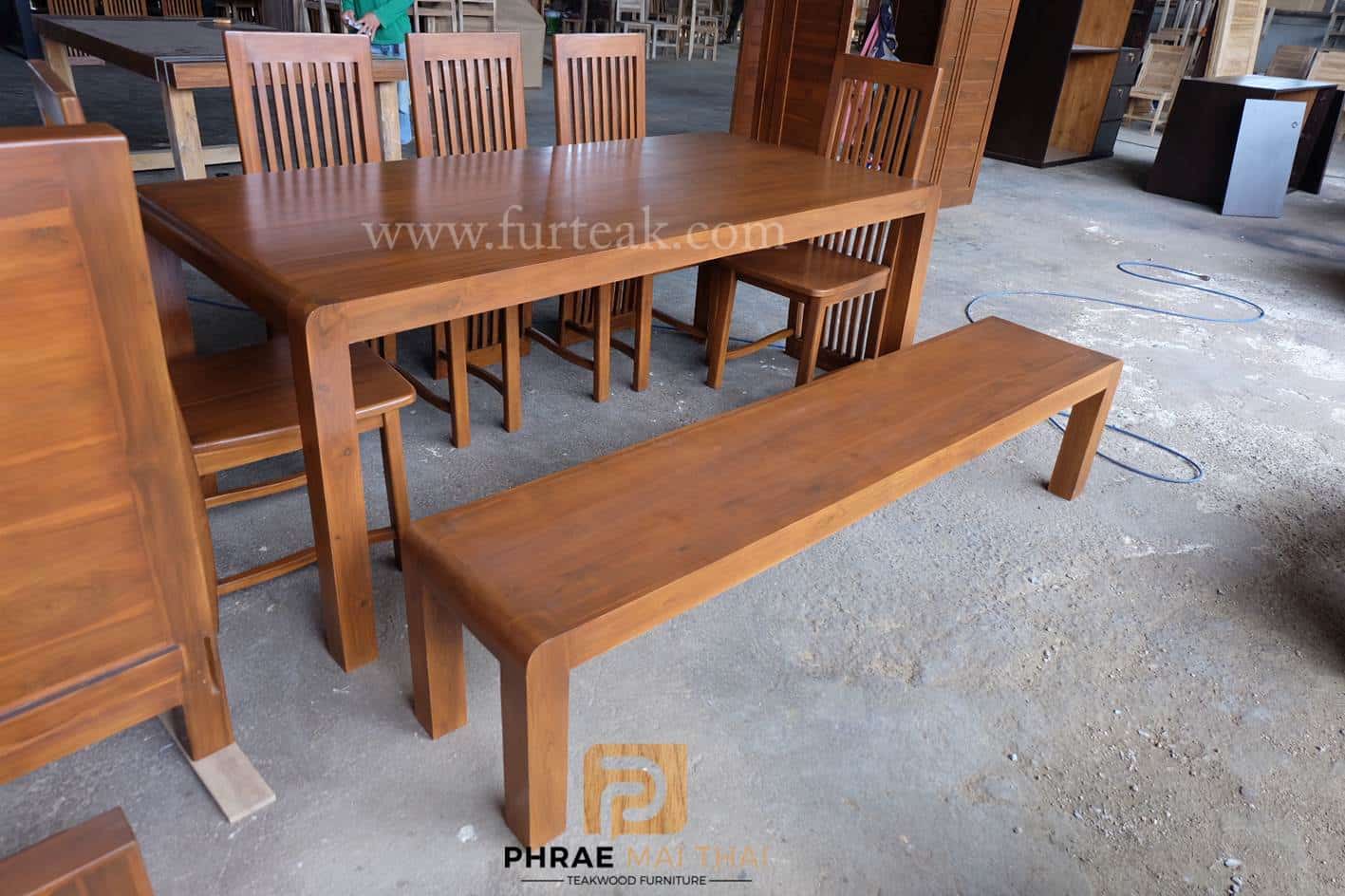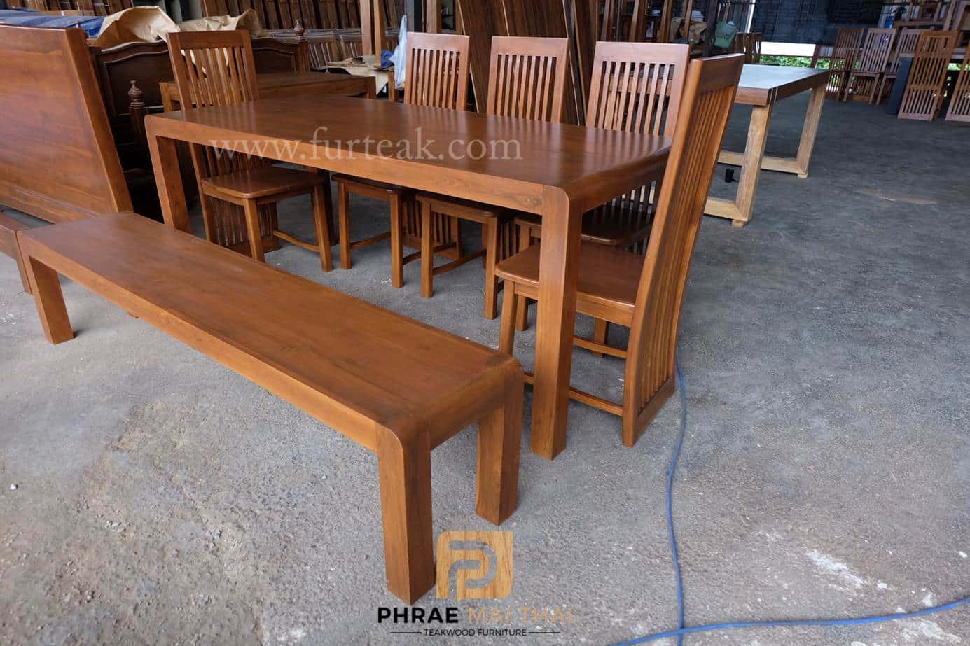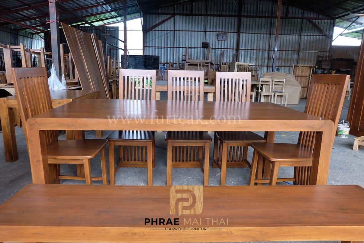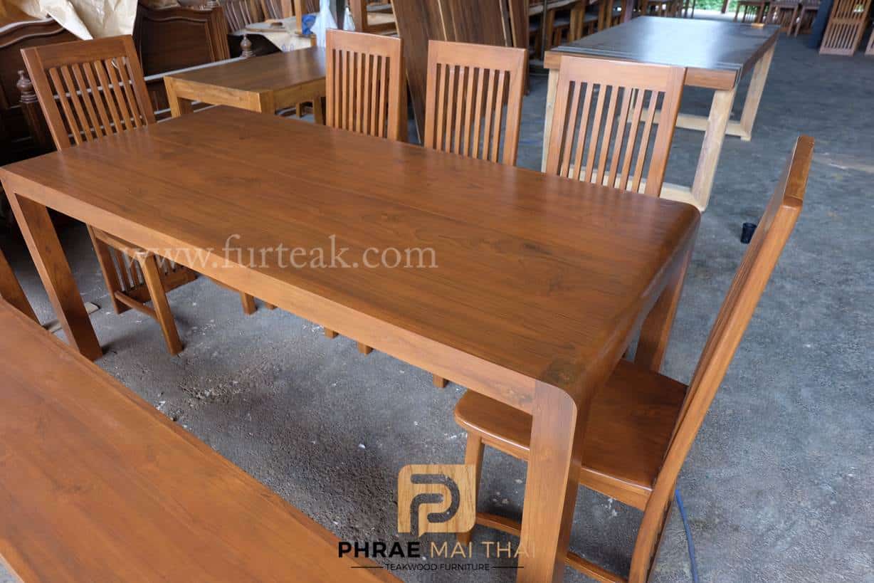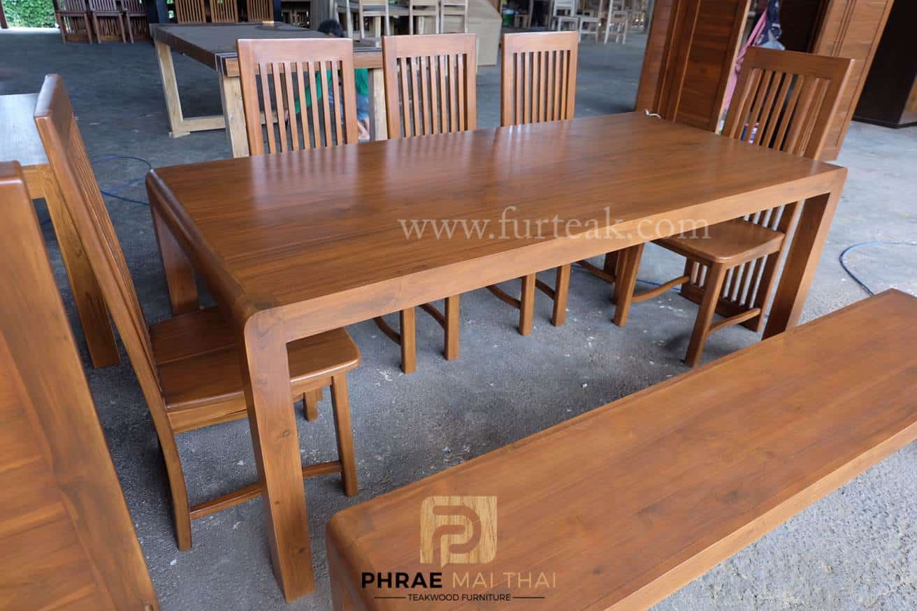 ชุดโต๊ะอาหารโมเดิร์น ขอบโต๊ะทรงมน ยาว 200 ซม. พร้อมเก้าอี้ซี่ยาว 5 ตัวและม้านั่งยาว 1 ตัว สีสักเข้ม **ดูขนาดได้ที่ข้อมูลเพิ่มเติม** เป็นไม้สักทองอบแห้ง ซึ่งคุณสมบัติของไม้เป็นไม้เนื้อแข็งอายุตั้งแต่ 30 ปีขึ้นไป เราเลือกใช้ไม้สักที่มีคุณภาพและใช้กระบวนการอบไม้ จึงทำให้ไม้มีการคงสภาพ ความชื้นน้อย และโอกาสไม้หดตัวน้อยมาก