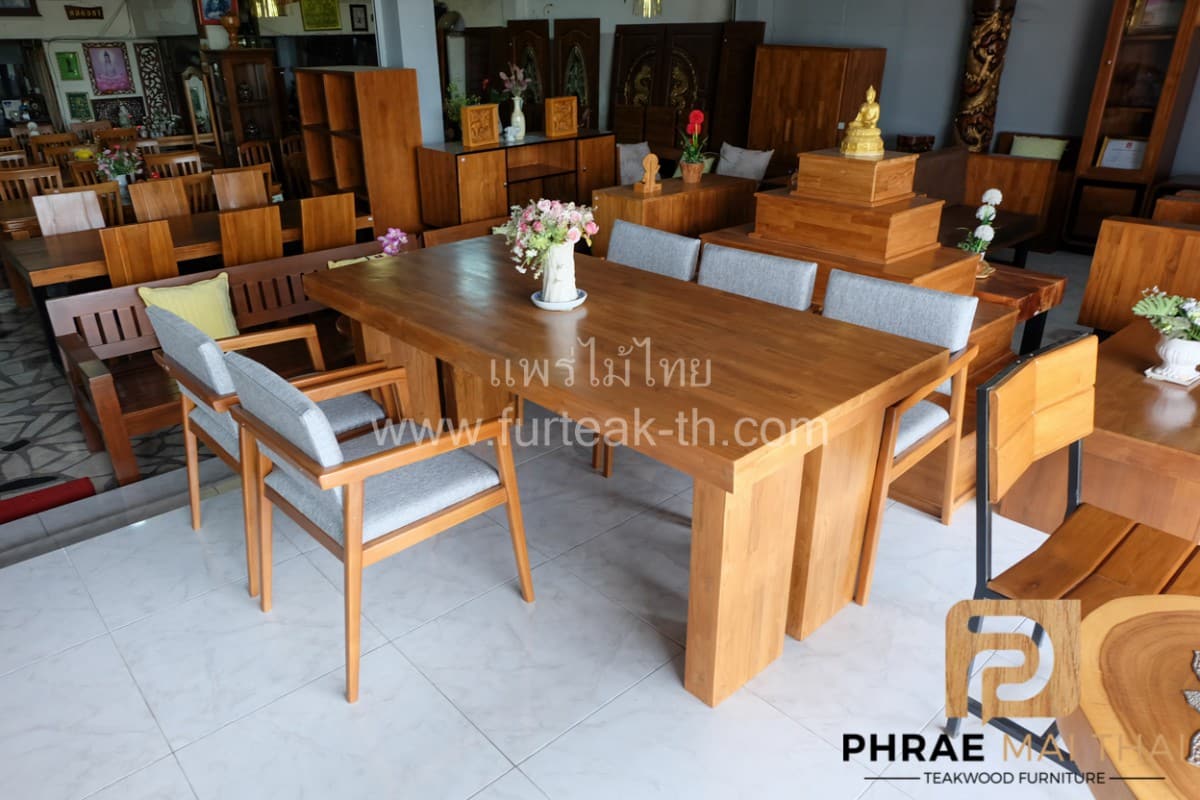 ชุดโต๊ะอาหารโมเดิร์น ลายไม้ประสาน ขาแฝด พร้อมเก้าอี้บุเบาะผ้าสีเทา 6 ที่นั่ง เป็นไม้สักทองอบแห้ง ซึ่งคุณสมบัติของไม้เป็นไม้เนื้อแข็งอายุตั้งแต่ 30 ปีขึ้นไป เราเลือกใช้ไม้สักที่มีคุณภาพและใช้กระบวนการอบไม้ จึงทำให้ไม้มีการคงสภาพ ความชื้นน้อย และโอกาสไม้หดตัวน้อยมาก