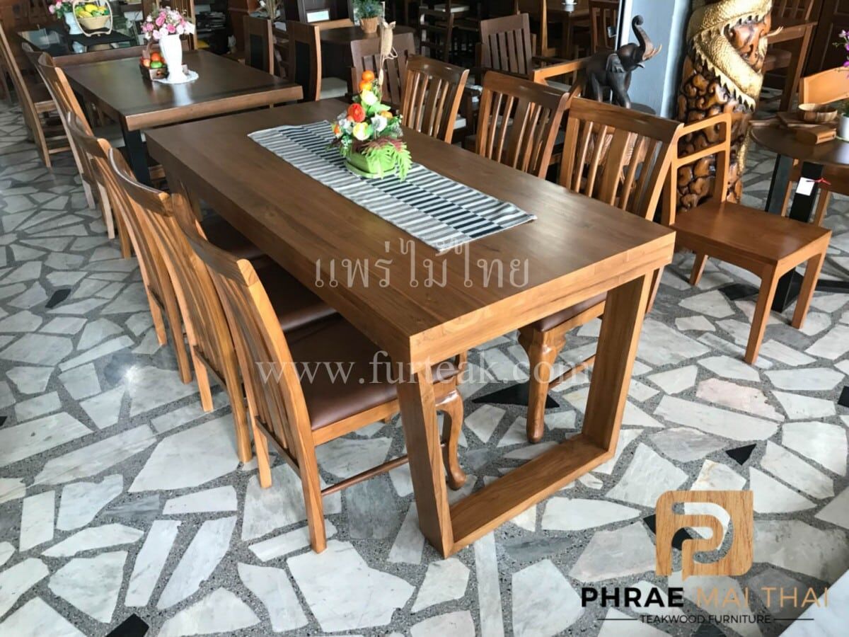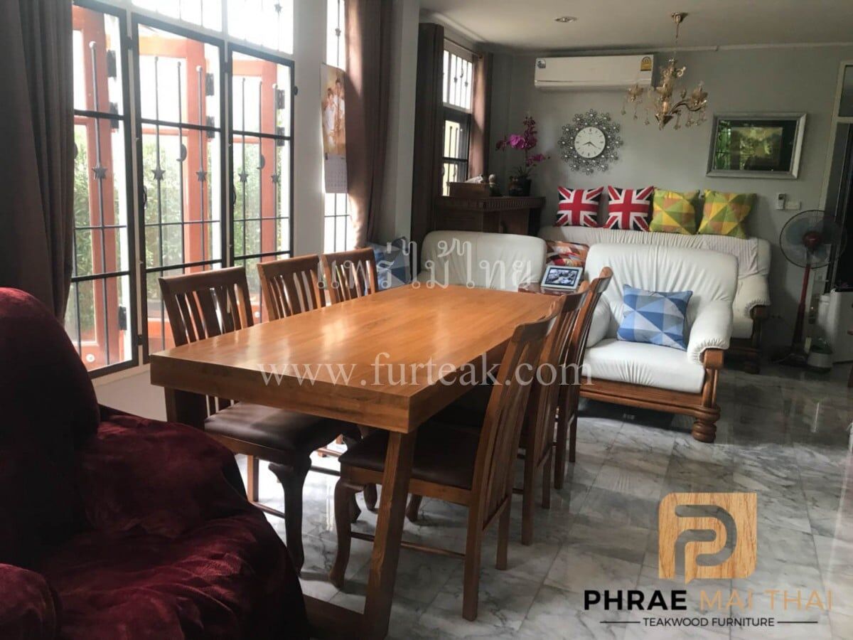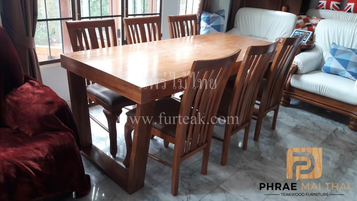 ชุดโต๊ะอาหารโมเดิร์น และเก้าอี้ซี่ยาวพร้อมเบาะสีน้ำตาล 6 ตัว สีสักทอง เป็นไม้สักทองอบแห้ง ซึ่งคุณสมบัติของไม้เป็นไม้เนื้อแข็งอายุตั้งแต่ 30 ปีขึ้นไป เราเลือกใช้ไม้สักที่มีคุณภาพและใช้กระบวนการอบไม้ จึงทำให้ไม้มีการคงสภาพ ความชื้นน้อย และโอกาสไม้หดตัวน้อยมาก
