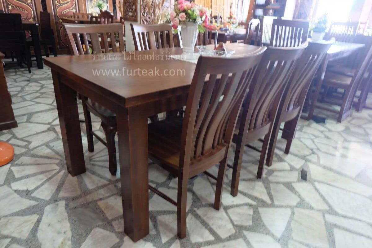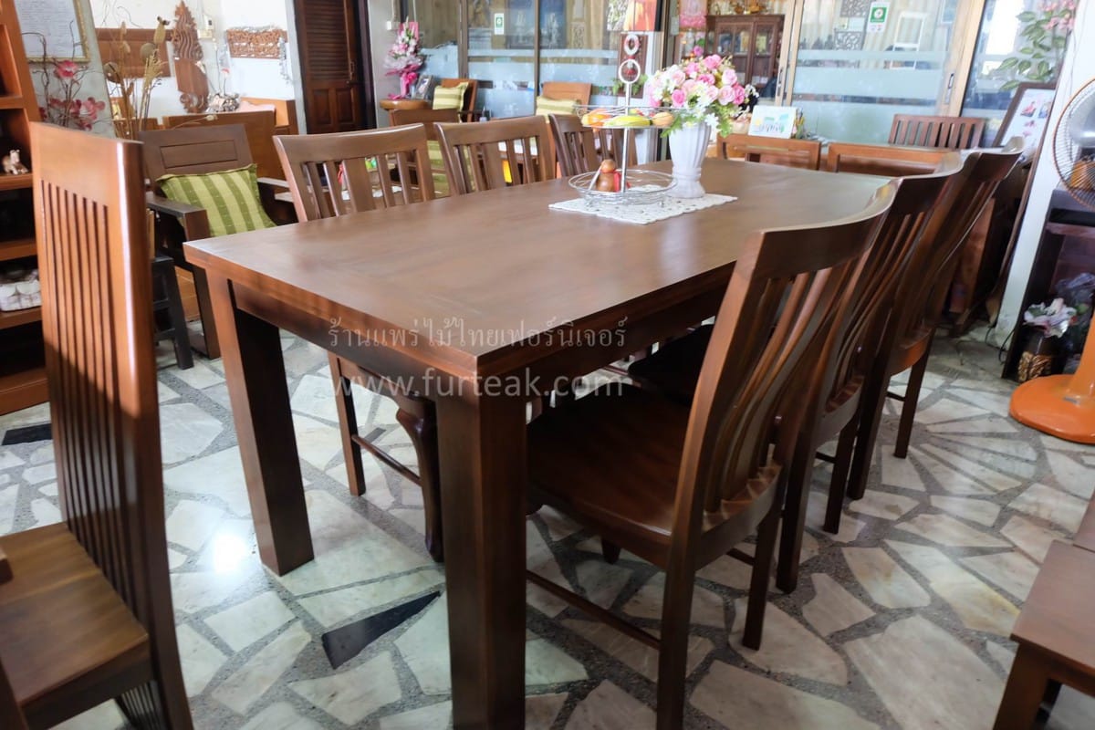 ชุดโต๊ะอาหารไม้สักขาหนา 4 นิ้ว พร้อมเก้าอี้ซี่ 6 ที่นั่ง สีสักเข้มเป็นไม้สักทองอบแห้ง ซึ่งคุณสมบัติของไม้เป็นไม้เนื้อแข็งอายุตั้งแต่ 30 ปีขึ้นไป เราเลือกใช้ไม้สักที่มีคุณภาพและใช้กระบวนการอบไม้ จึงทำให้ไม้มีการคงสภาพ ความชื้นน้อย และโอกาสไม้หดตัวน้อยมาก