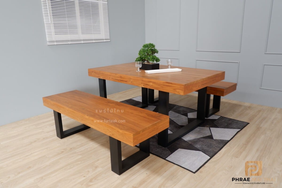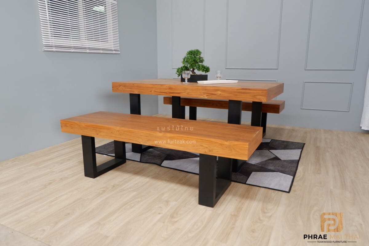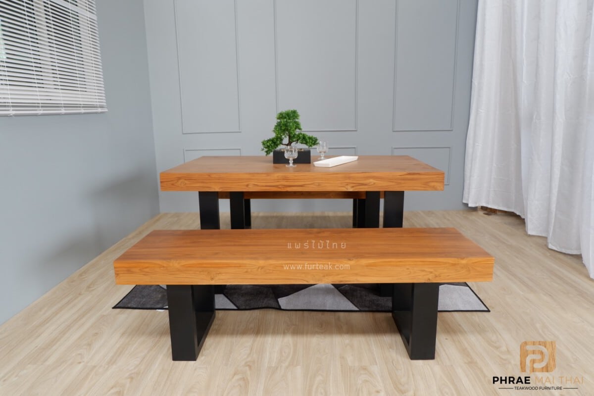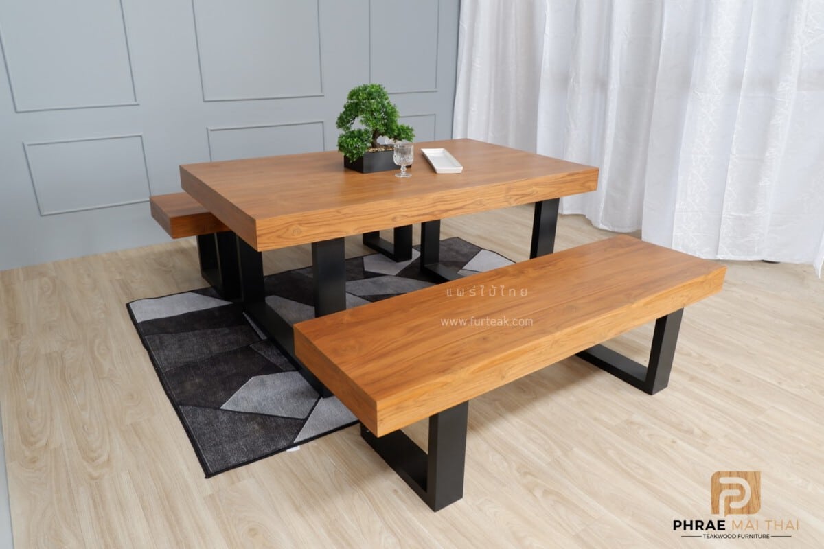 ชุดโต๊ะอาหารไม้สัก ขาแบนตรง พร้อมม้านั่งยาว 2 ตัว สีสักทอง ขาดำ เป็นไม้สักทองอบแห้ง ซึ่งคุณสมบัติของไม้เป็นไม้เนื้อแข็งอายุตั้งแต่ 30 ปีขึ้นไป เราเลือกใช้ไม้สักที่มีคุณภาพและใช้กระบวนการอบไม้ จึงทำให้ไม้มีการคงสภาพ ความชื้นน้อย และโอกาสไม้หดตัวน้อยมาก