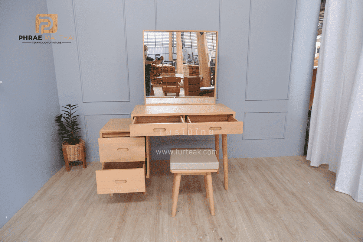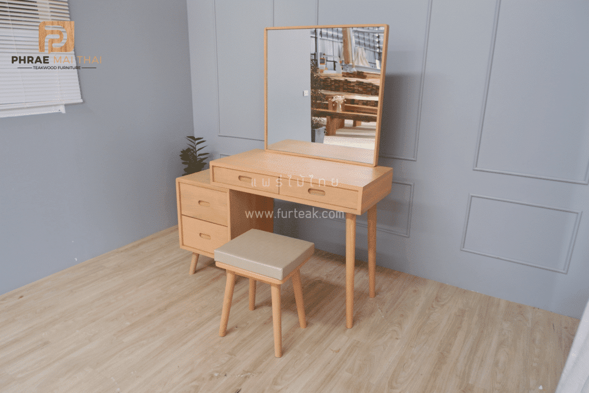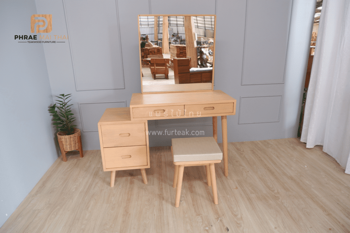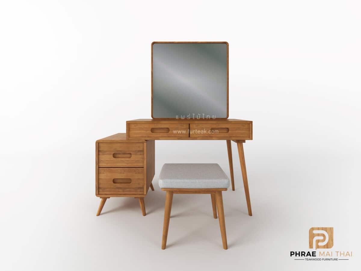 โต๊ะเครื่องแป้งไม้สักแบบโมเดิร์น ประกอบไปด้วย 2 ลิ้นชัก พร้อมกระจกเงา และเก้าอี้ 1 ตัวพร้อมเบาะ เป็นไม้สักทองทั้งหมด สีสักทองเป็นไม้สักทองอบแห้ง ซึ่งคุณสมบัติของไม้เป็นไม้เนื้อแข็งอายุตั้งแต่ 30 ปีขึ้นไป เราเลือกใช้ไม้สักที่มีคุณภาพและใช้กระบวนการอบไม้ จึงทำให้ไม้มีการคงสภาพ ความชื้นน้อย โอกาสไม้หดตัวน้อยมาก