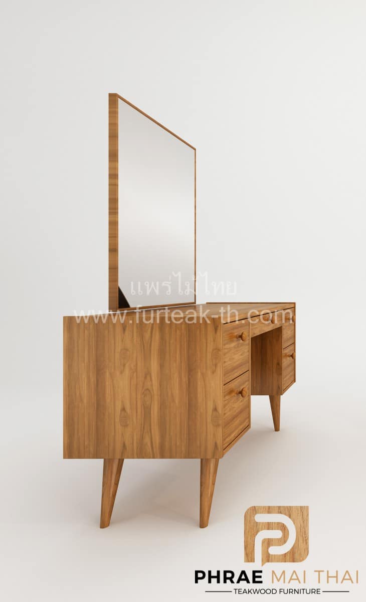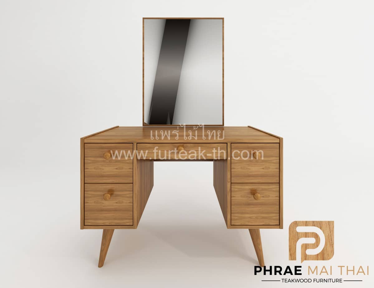 โต๊ะเครื่องแป้งไม้สัก ขากลึงกลม มี 5 ลิ้นชัก พร้อมกระจกเงา เป็นไม้สักทองทั้งหมด สีสักทองเป็นไม้สักทองอบแห้ง ซึ่งคุณสมบัติของไม้เป็นไม้เนื้อแข็งอายุตั้งแต่ 30 ปีขึ้นไป เราเลือกใช้ไม้สักที่มีคุณภาพและใช้กระบวนการอบไม้ จึงทำให้ไม้มีการคงสภาพ ความชื้นน้อย โอกาสไม้หดตัวน้อยมาก