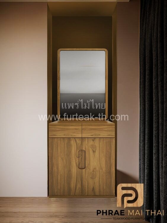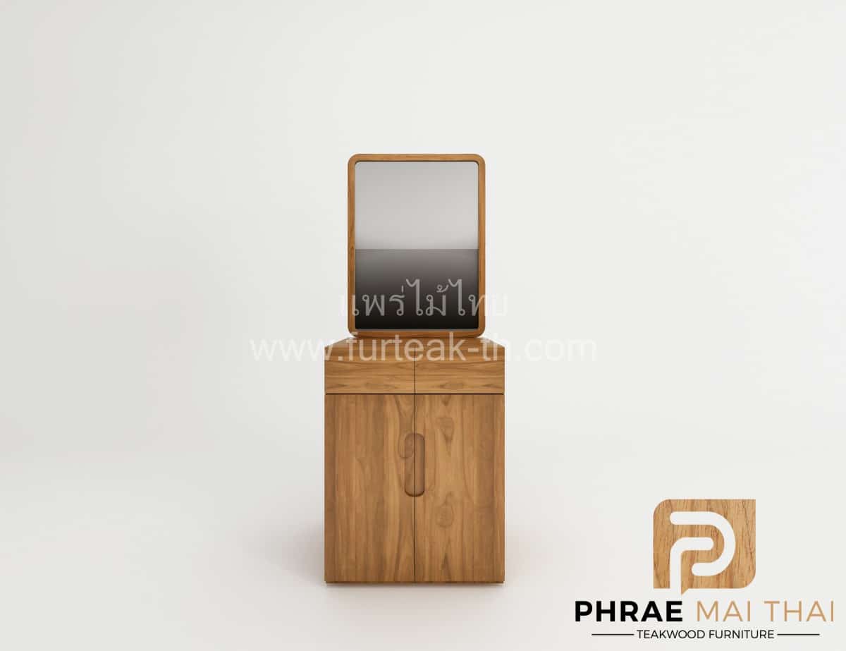 โต๊ะเครื่องแป้งไม้สักแบบโมเดิร์น มี 2 ลิ้นชัก 2 บานปิดเปิด พร้อมกระจกเงา เป็นไม้สักทองทั้งหมด สีสักทองเป็นไม้สักทองอบแห้ง ซึ่งคุณสมบัติของไม้เป็นไม้เนื้อแข็งอายุตั้งแต่ 30 ปีขึ้นไป เราเลือกใช้ไม้สักที่มีคุณภาพและใช้กระบวนการอบไม้ จึงทำให้ไม้มีการคงสภาพ ความชื้นน้อย โอกาสไม้หดตัวน้อยมาก